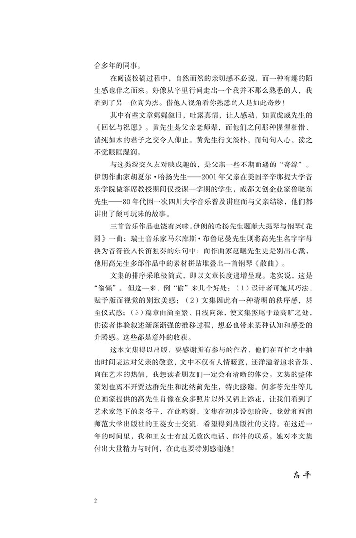 高为杰是我国音乐界德高望重的教授,被誉为“具创新精神的作曲家和音乐理论家、音乐教育家”,一位集创作、教学、理论研究于一体的“学者型作曲家”,被人称作中国音乐界的“一本活字典”“一部百科全书”。该书就是高为杰先生的亲朋好友、学生后辈们为祝贺他八十高寿而编撰的一本文集,以此庆祝高先生在音乐艺术及教育方面的杰出成就。文集采取撰文、作曲(小品)、题字、绘画、照片等多种方式表达大家对高先生的深厚感情和衷心祝愿,或许是讲述高先生轶事,或许是对他学术成就的评论,或许是诚恳坦率地从各个视角去谈论他等,既呈现作曲家、学者、导师、一位学术的高为杰,也呈现作为友人、同仁、家人、一个生活的高为杰。这部庆生纪念文集同时也是一份珍贵的文献,纪录了中国当代音乐发展历程中的人和事,可供同行借鉴参考之用。