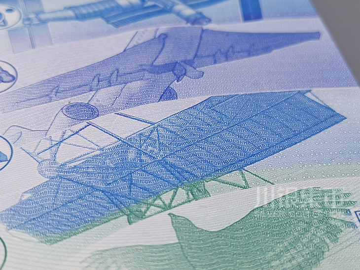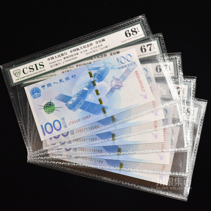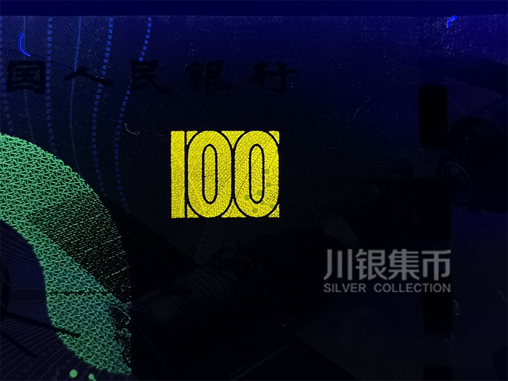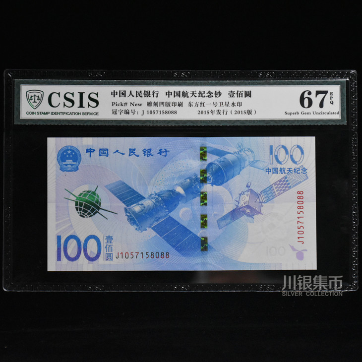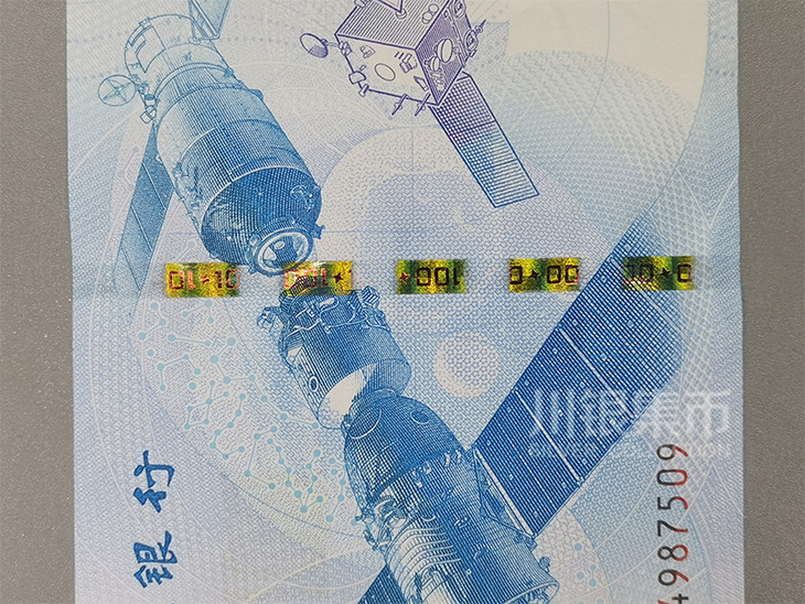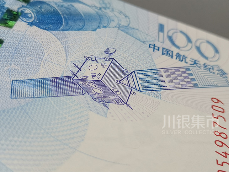 正面主景图案为神舟九号飞船与天宫一号交会对接图案。左上方为国徽图案、“中国人民银行”行名,其下方为东方红一号卫星图案。票面左下方为面额数字“100”和汉字“壹佰圆”。