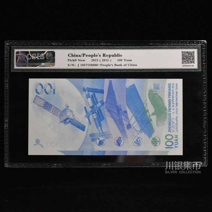 背面主景图案由上至下依次为嫦娥一号卫星图案、2020年中国空间站“天宫”、喷气式客机、冯如2号双翼螺旋桨飞机、飞禽海东青图案。票面左上角为风筝局部图案,右上角为面额数字“100”。票面下方为行长章与年号“2015”,中国人民银行汉语拼音字母和蒙、藏、维、壮四种民族文字的“中国人民银行”字样与面额,面额数字“100”,汉语拼音字母“YUAN”。
