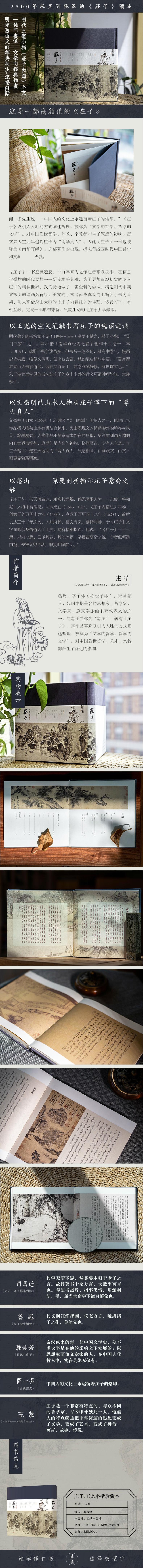 完成一部形神兼备、气韵生动的《庄子》珍藏本。 手书为骨架、明末高僧憨山的《庄子内篇注》为神理,多管齐下、有机互融, 全新的尝试,精选明代中期文徵明的绘画为背景、王宠的小楷《南华真经内七篇》 一一研读难乎其难,为了更加直观切实的契入庄子的精神世界,我们特地做了一番* 《庄子》一书空灵透脱,千百年来为之作注者难以枚举,在信息化爆炸的时代要想成就。 一书也被称为《南华真经》。这部著作的出现,标志着战国时代中国哲学和文学的 教都产生了深远的影响。唐玄宗天宝元年追封庄子为“南华真人”,因此《庄子》 方式阐述哲理,被称为“文学的哲学,哲学的文学”。对中国后世哲学、艺术、宗* 闻一多先生说:“中国人的文化上永远留着庄子的烙印。”《庄子》以引人入胜的