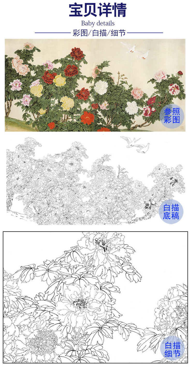 于非闇横幅工笔花鸟白描底稿《牡丹双鸽图》-多种白描尺寸可选-YF91