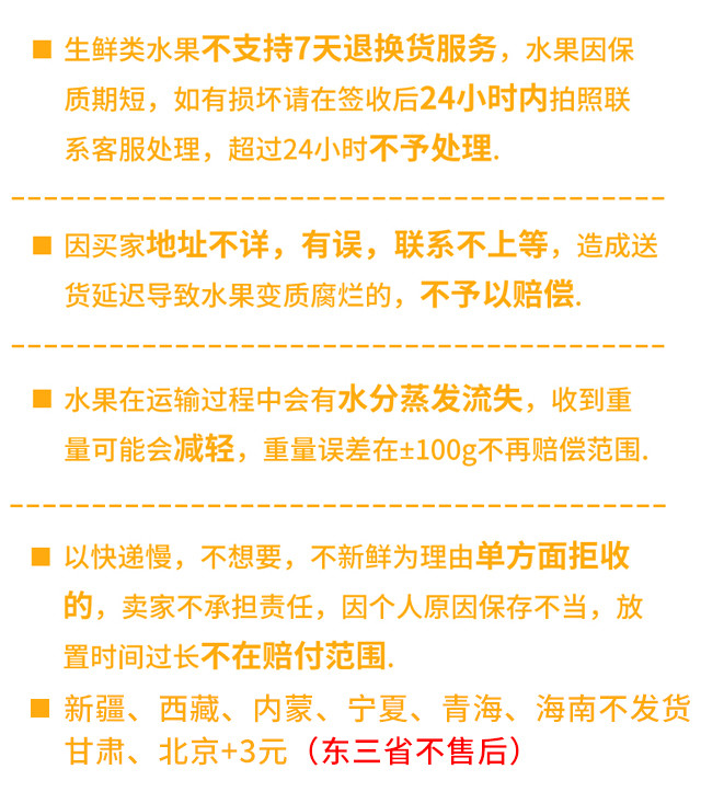 4.生鲜水果因为客户原因无法收取或者拒收一律不予赔付。