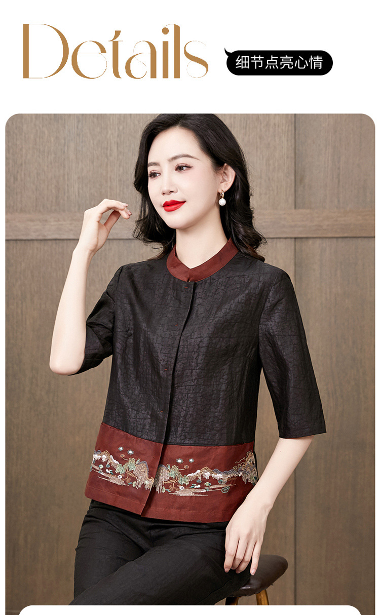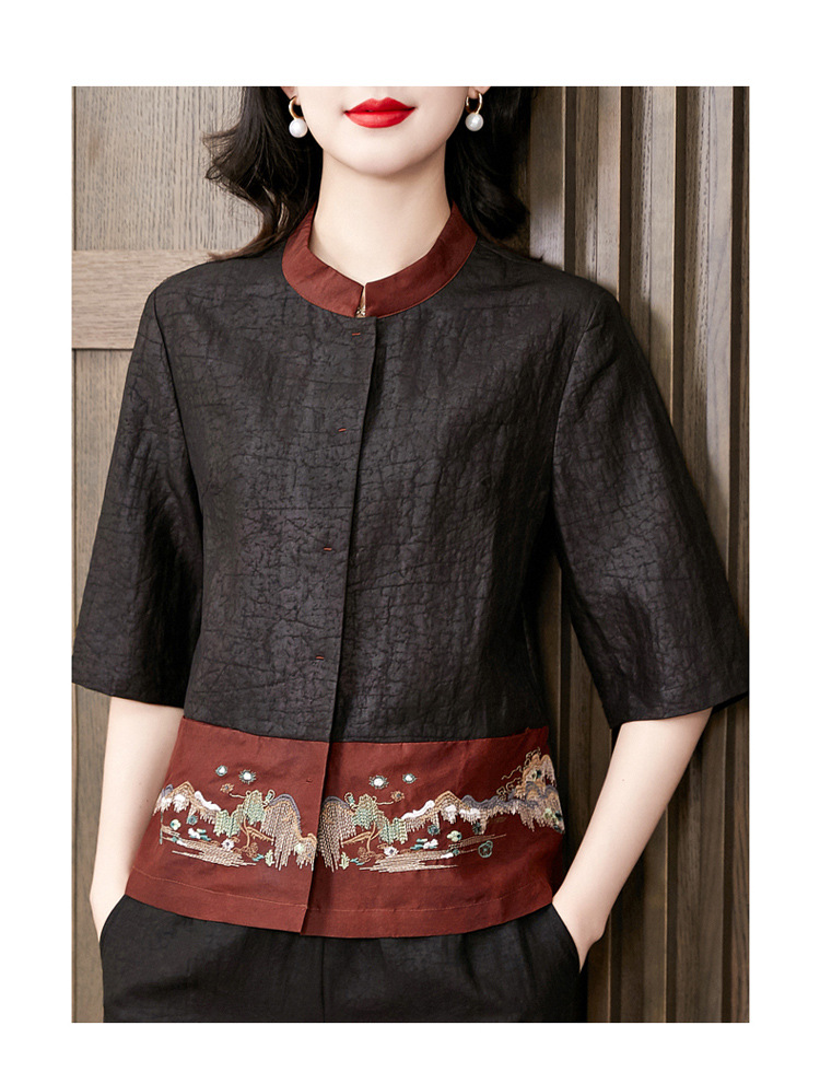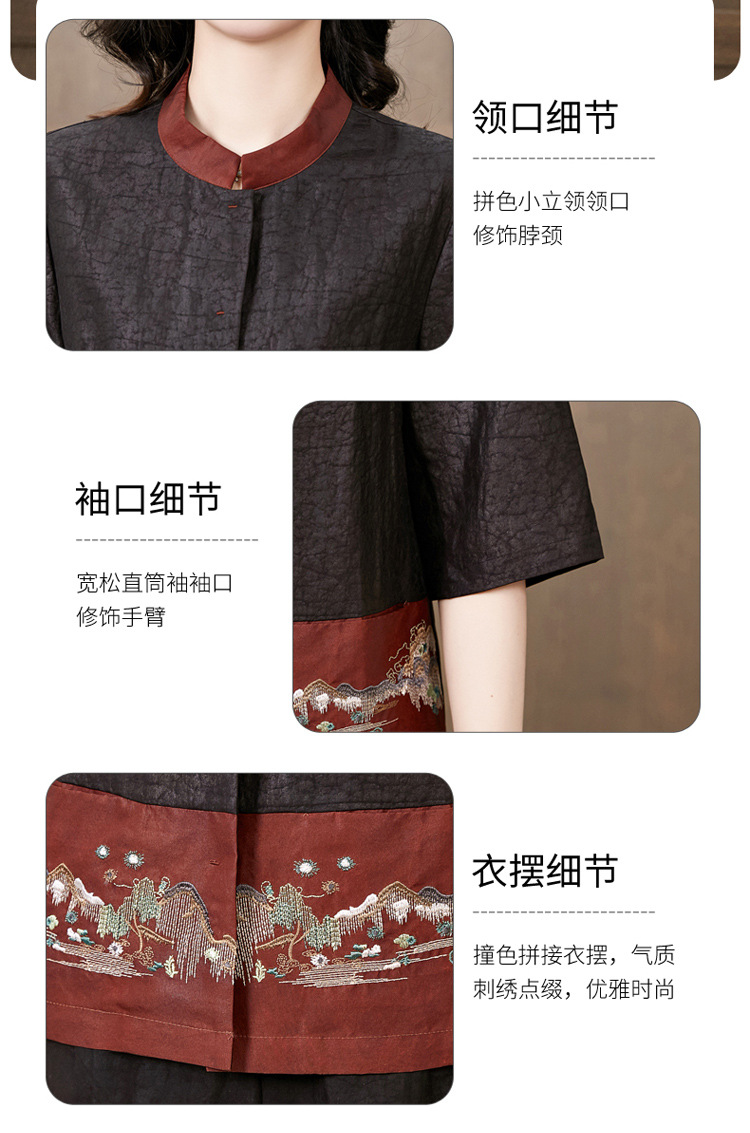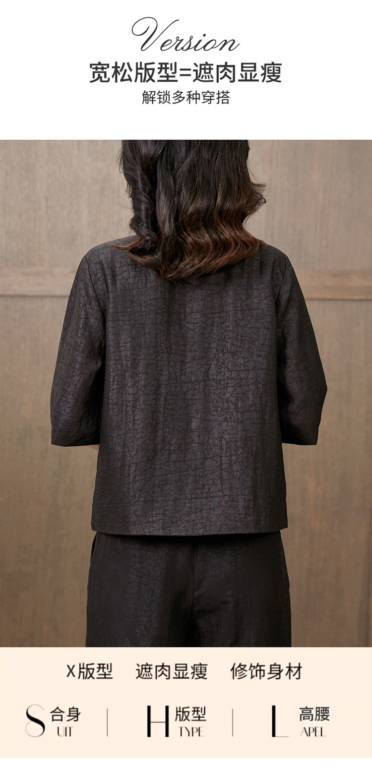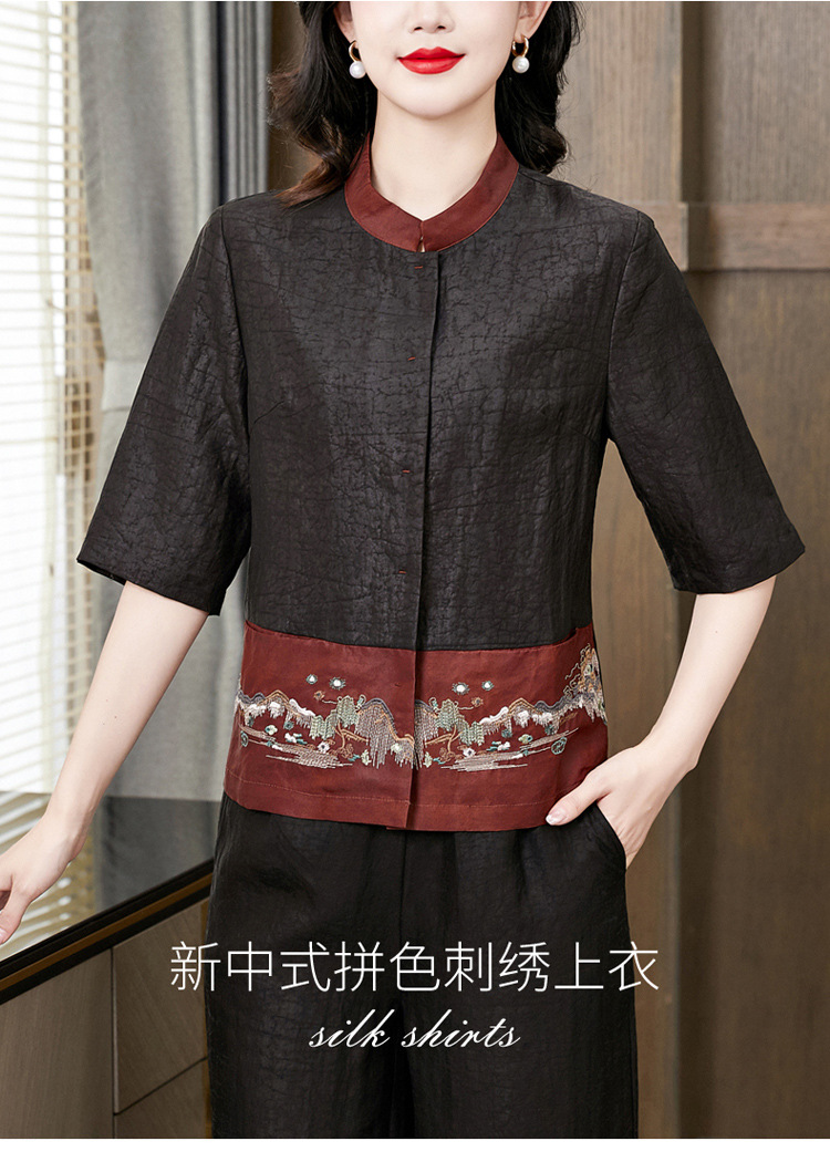 LS-2616香云纱龟裂纹衬衫2024新款夏季立领中袖贵夫人宽松桑蚕丝拼接上衣