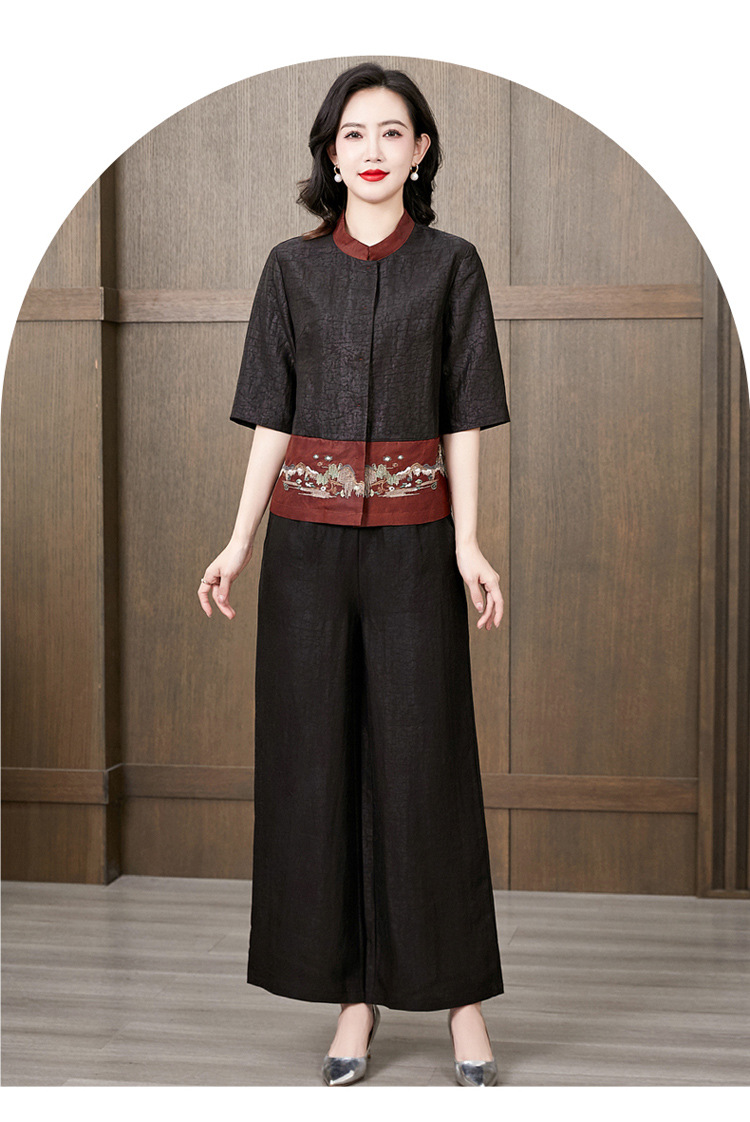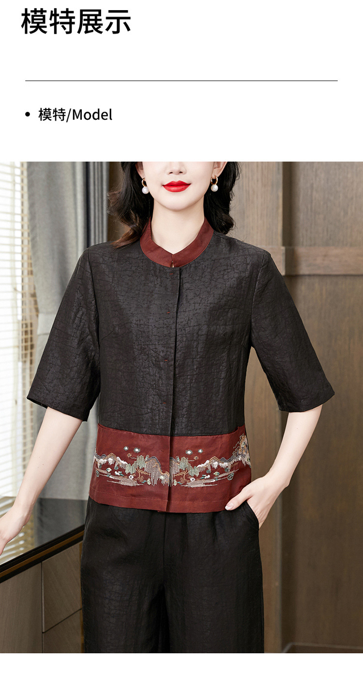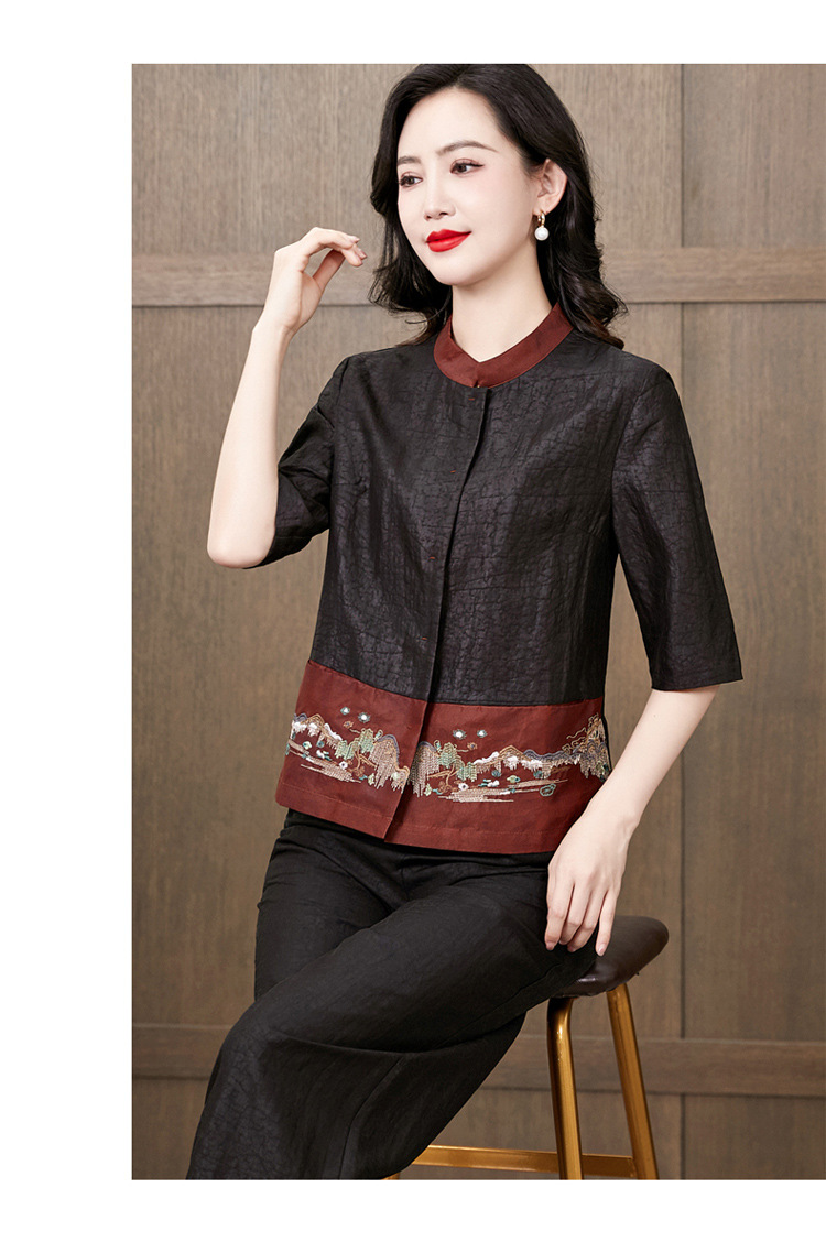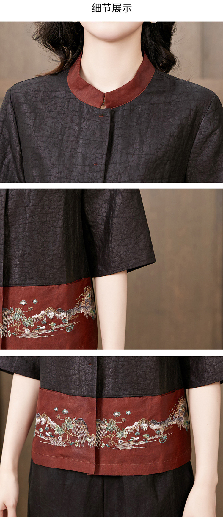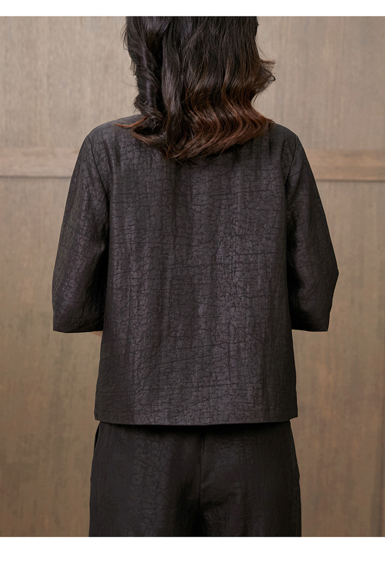 LS-2616香云纱龟裂纹衬衫2024新款夏季立领中袖贵夫人宽松桑蚕丝拼接上衣