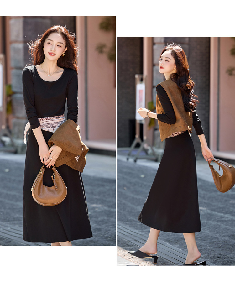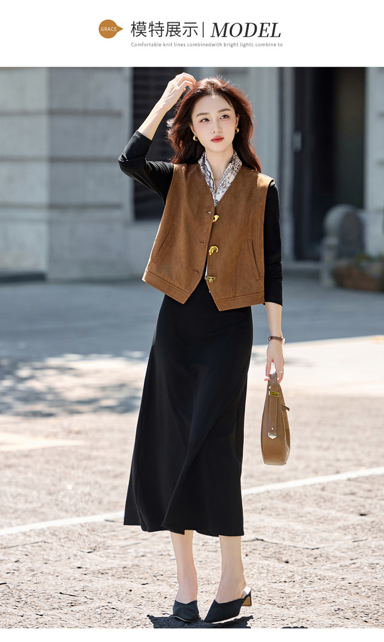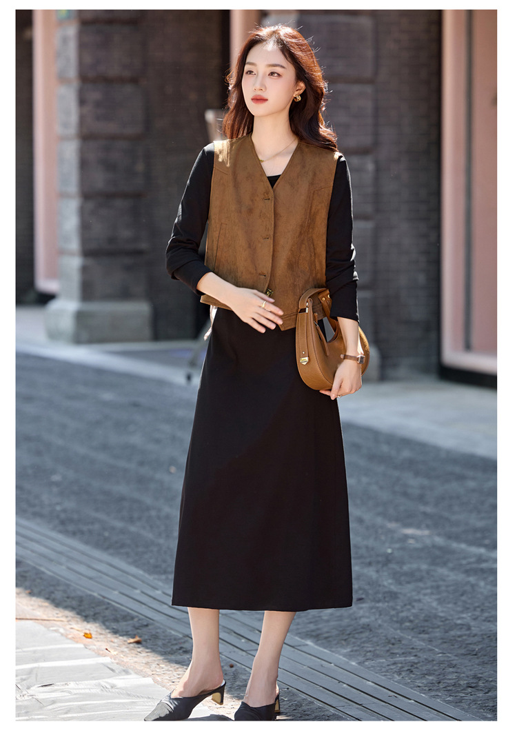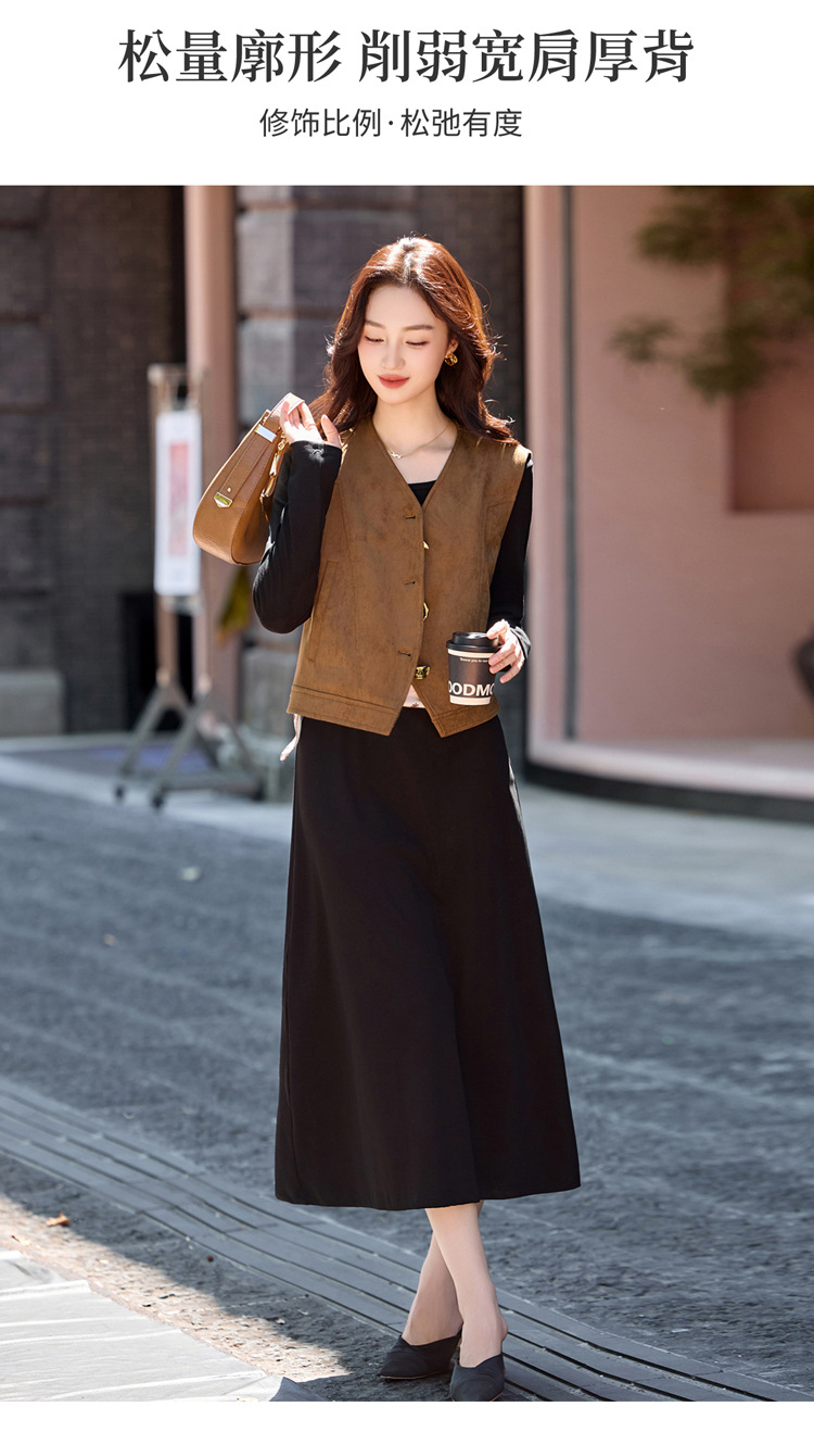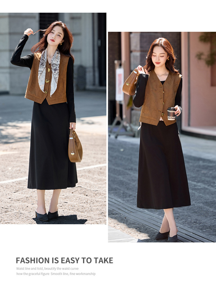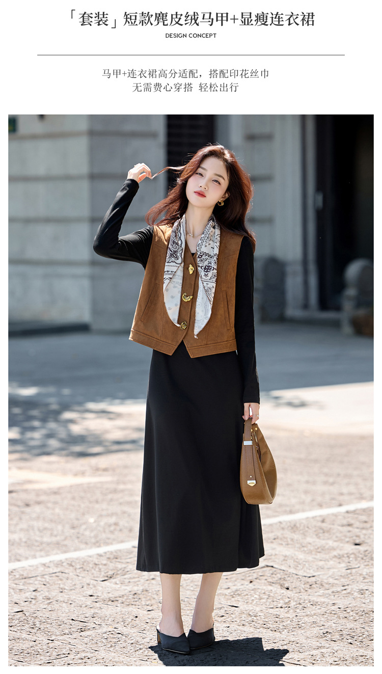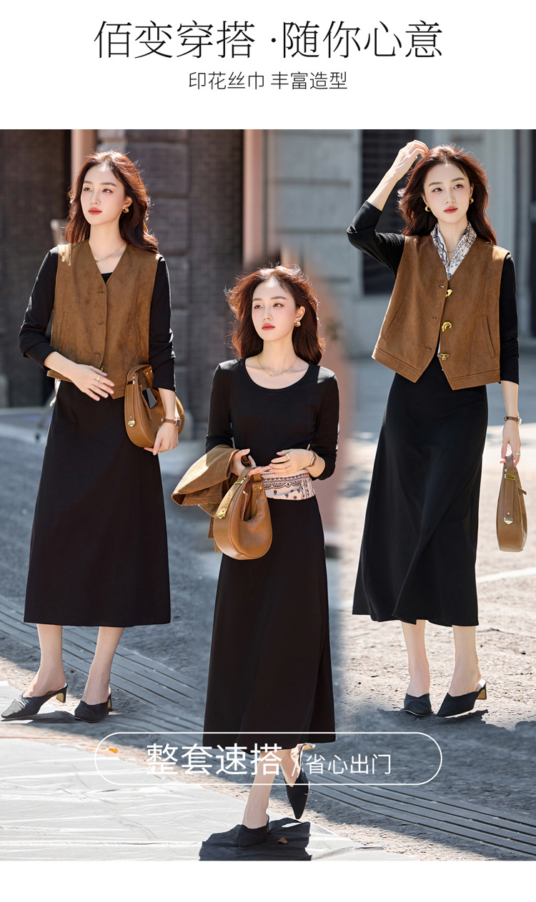 韩系时尚气质麂皮绒马甲,丝巾显瘦打底裙两件套HR-YF2621
