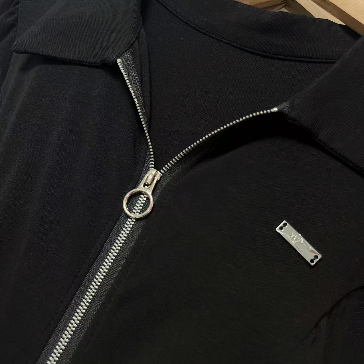 清仓价2025~翻领黑色拉链打结短款T恤-喜出
