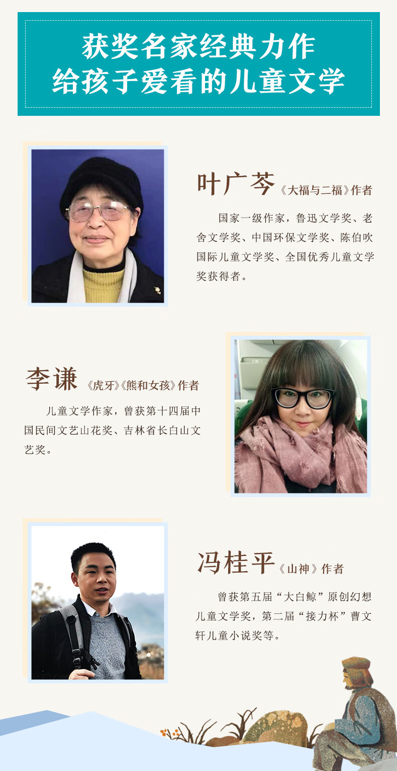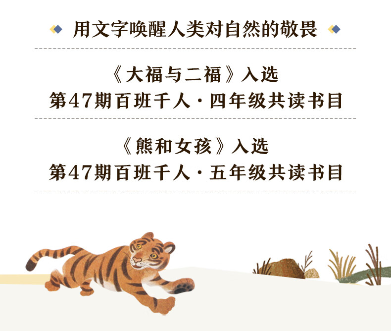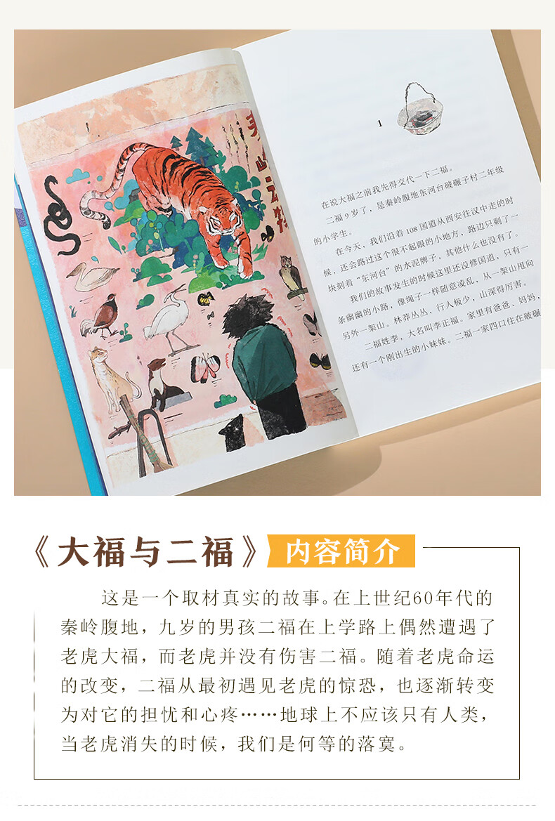 《大福与二福》是一个取材真实的故事,讲述了一段跨越物种的感人情谊。这曲回响在秦岭深处、令人深省的悲歌,是献给地球上后一只秦岭华南虎的。作者叶广芩老师曾在秦岭腹地周至县深入基层工作8年,而这片土地也是上世纪虎患频发,许多离奇故事的诞生地。艺术来源于生活,写作亦是如此。叶老师在这段工作期间,关注生态与动物保护,积极投身保宣传事业,为大熊猫、金丝猴等秦岭濒危物种全力发声。由于秦岭后一只老虎的命运是和孩子们紧密联系在一起的,便有了这篇写给孩子的纪实动物小说。