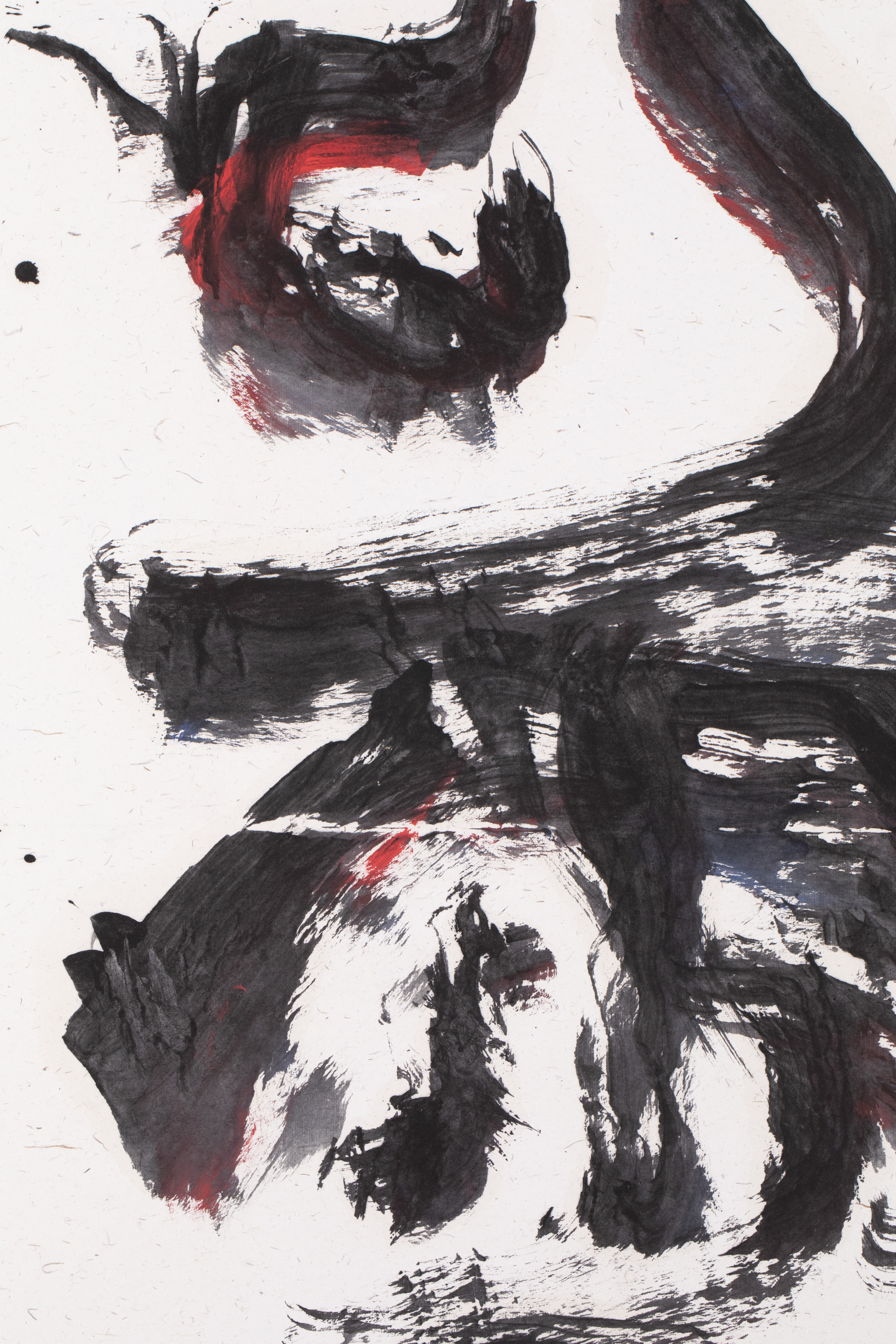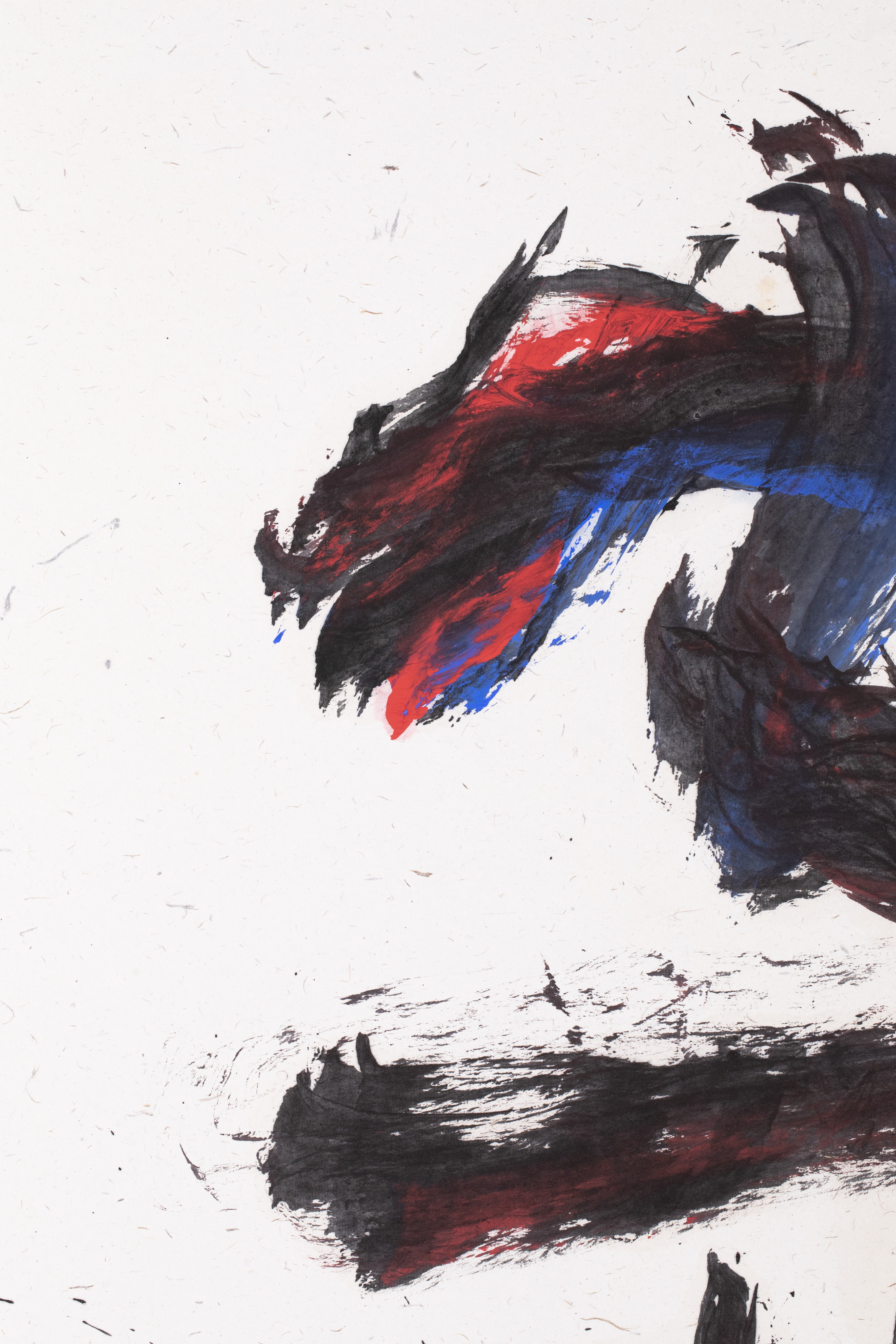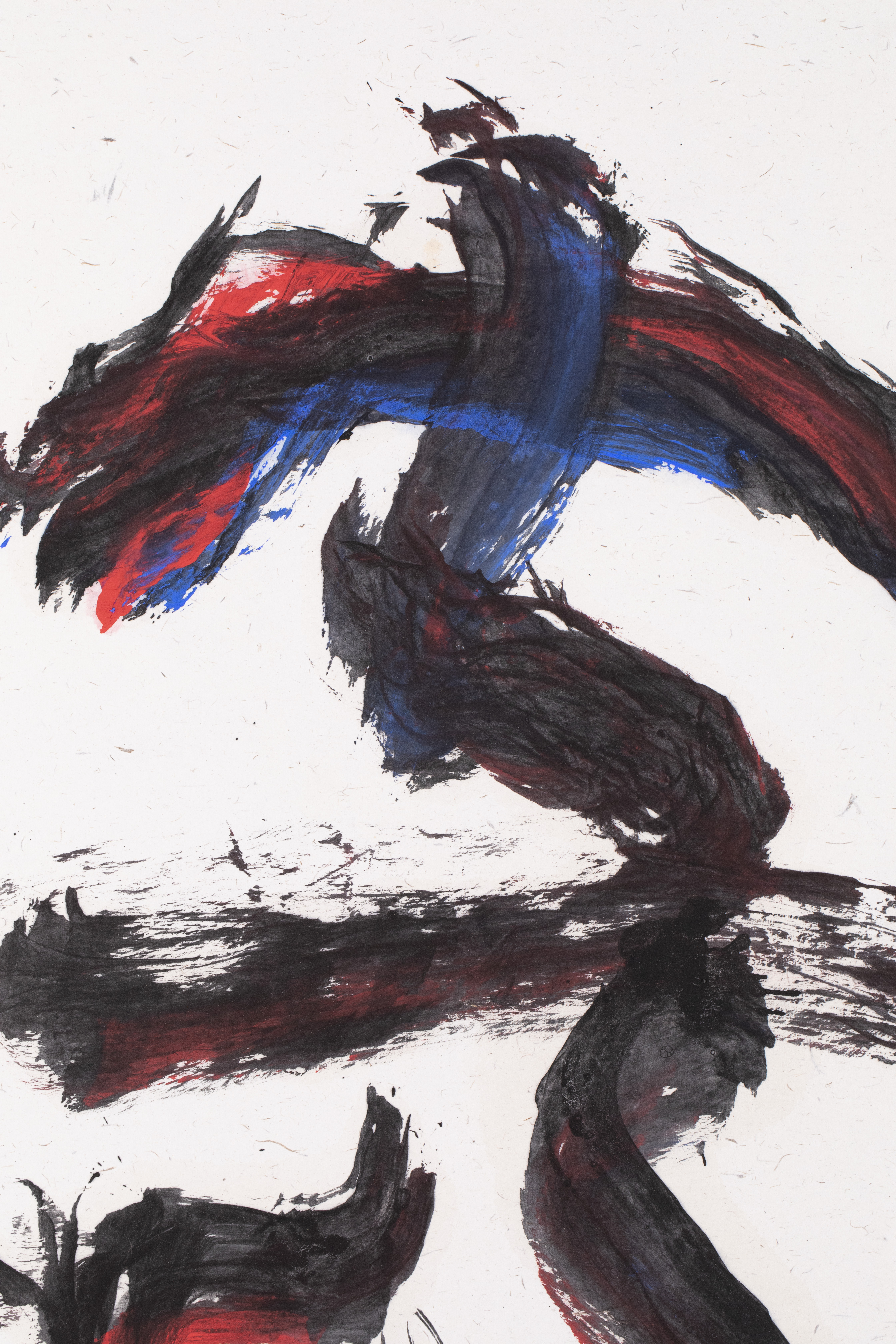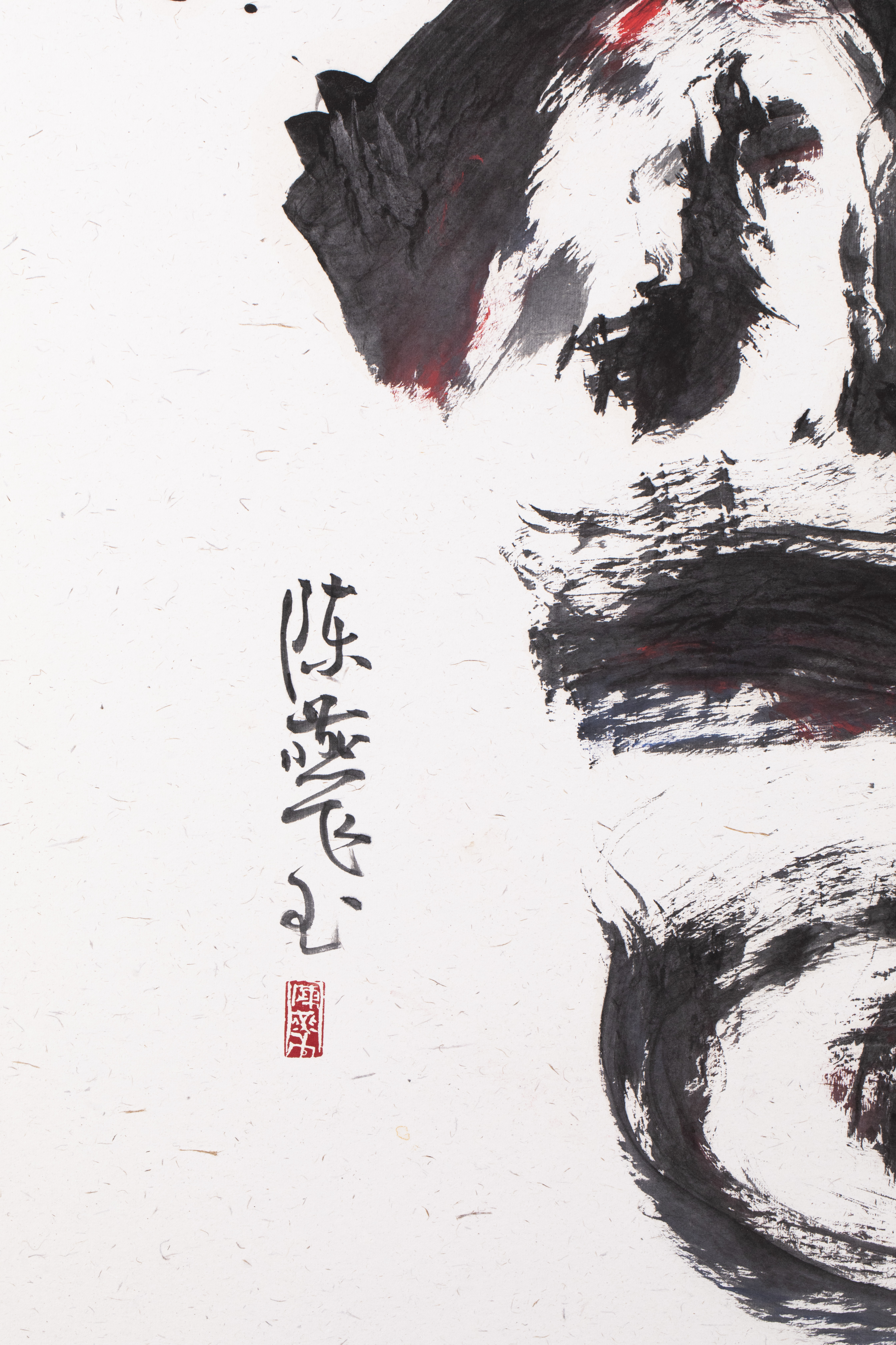 此作品几处彩墨渲染,于深浓的黑墨中焕发光彩。墨迹的枯浓与线条的变化如行云流水,走笔舒展飞扬、飘逸流丽,颇有趣味,整体予人明朗畅快之感。