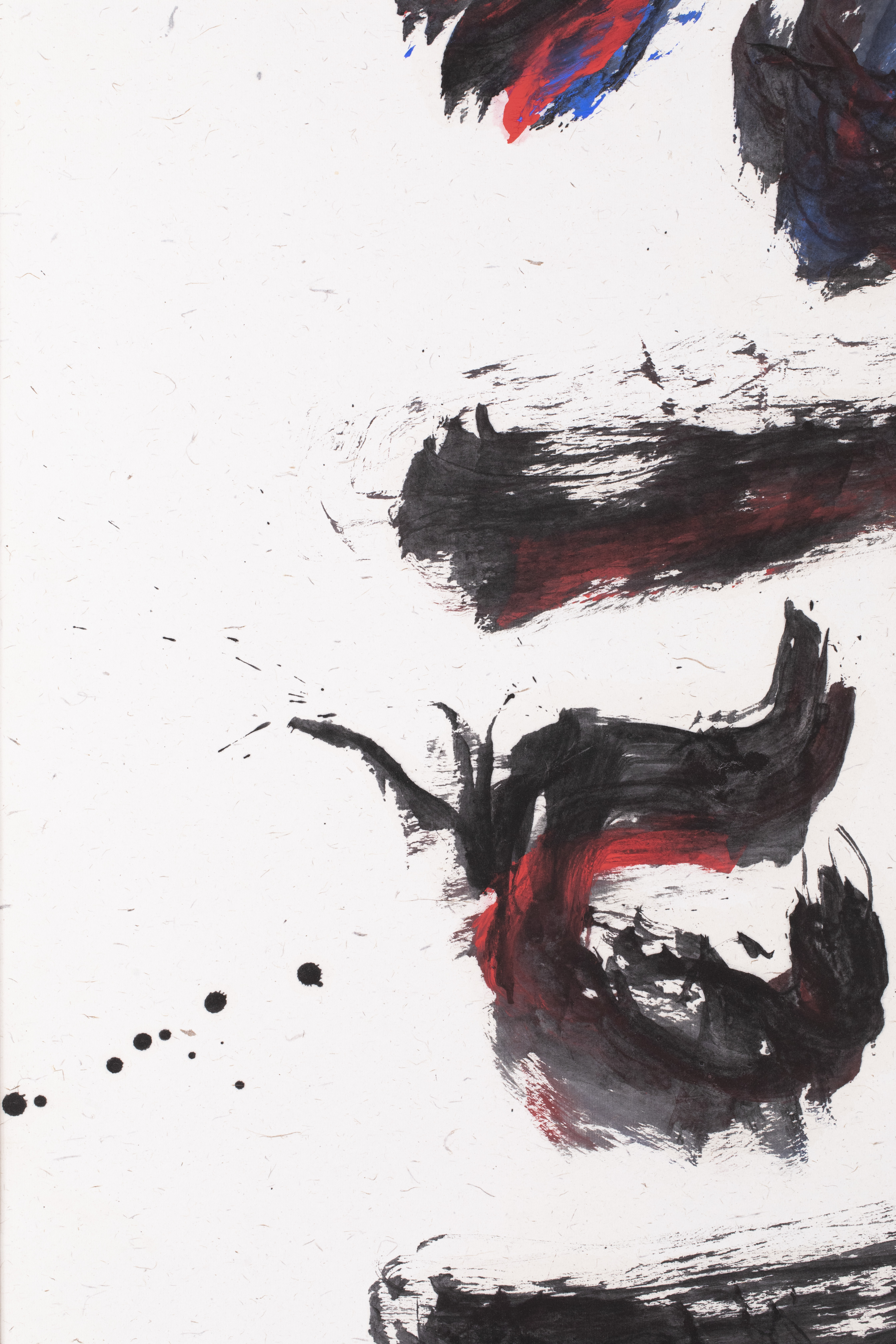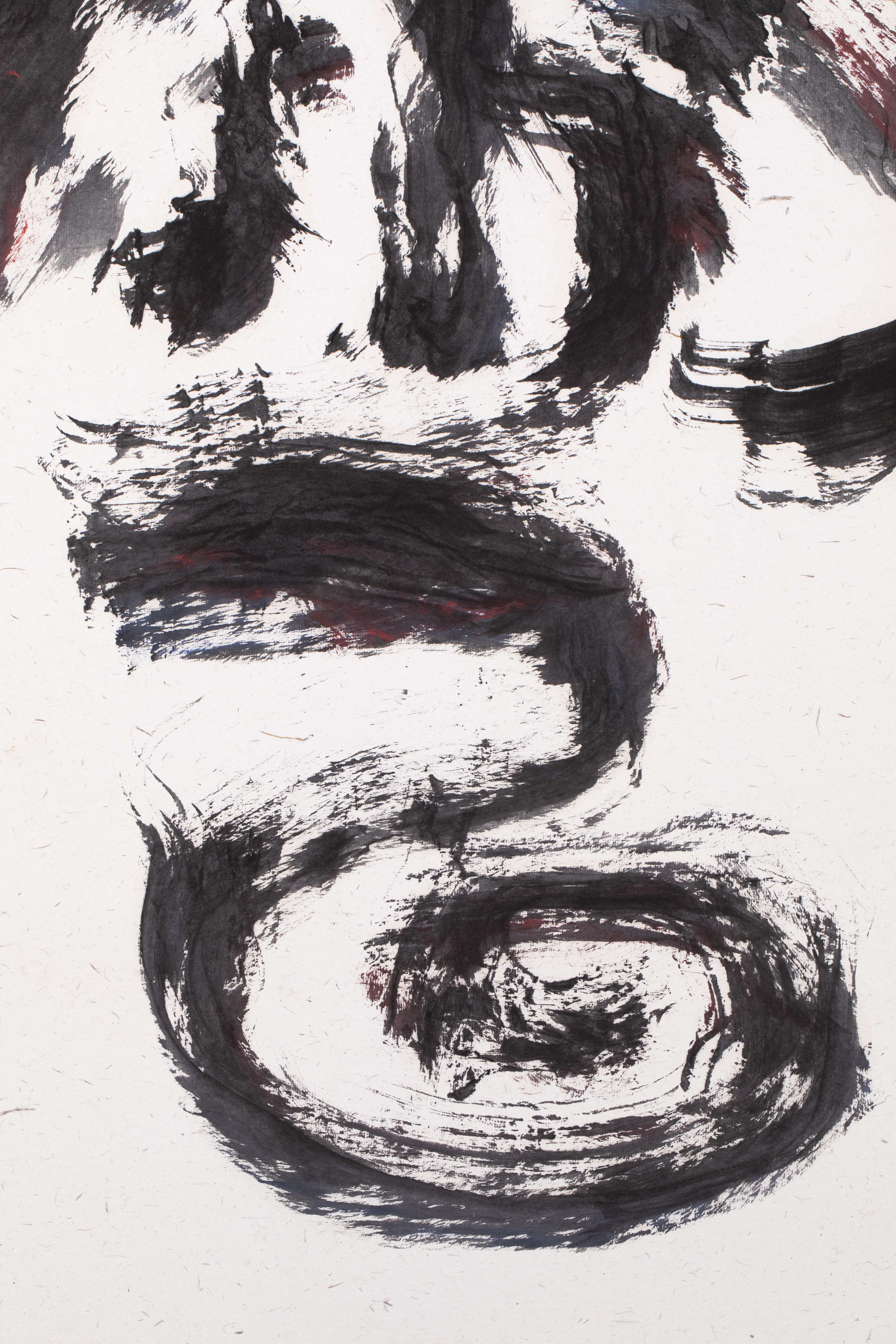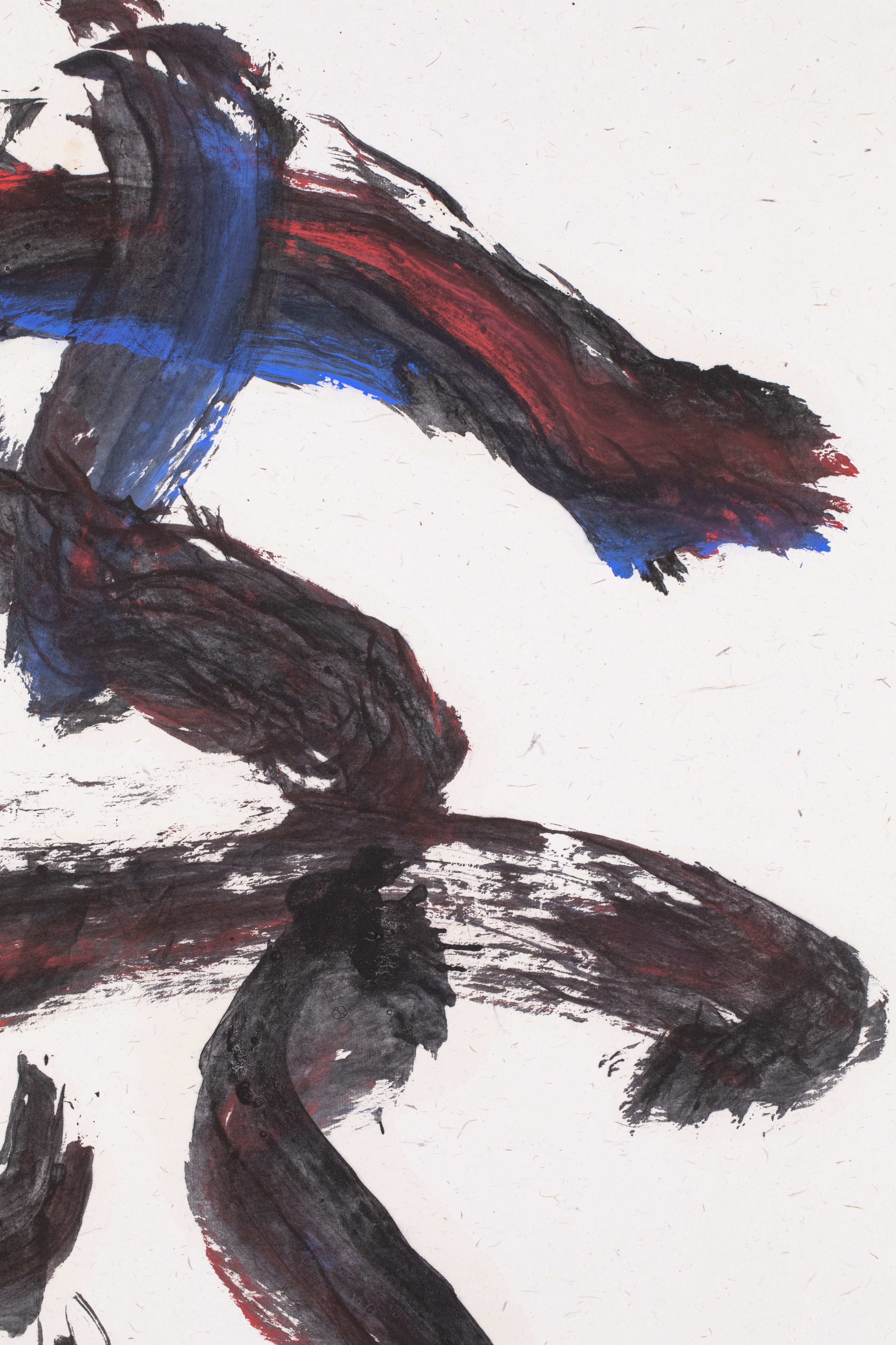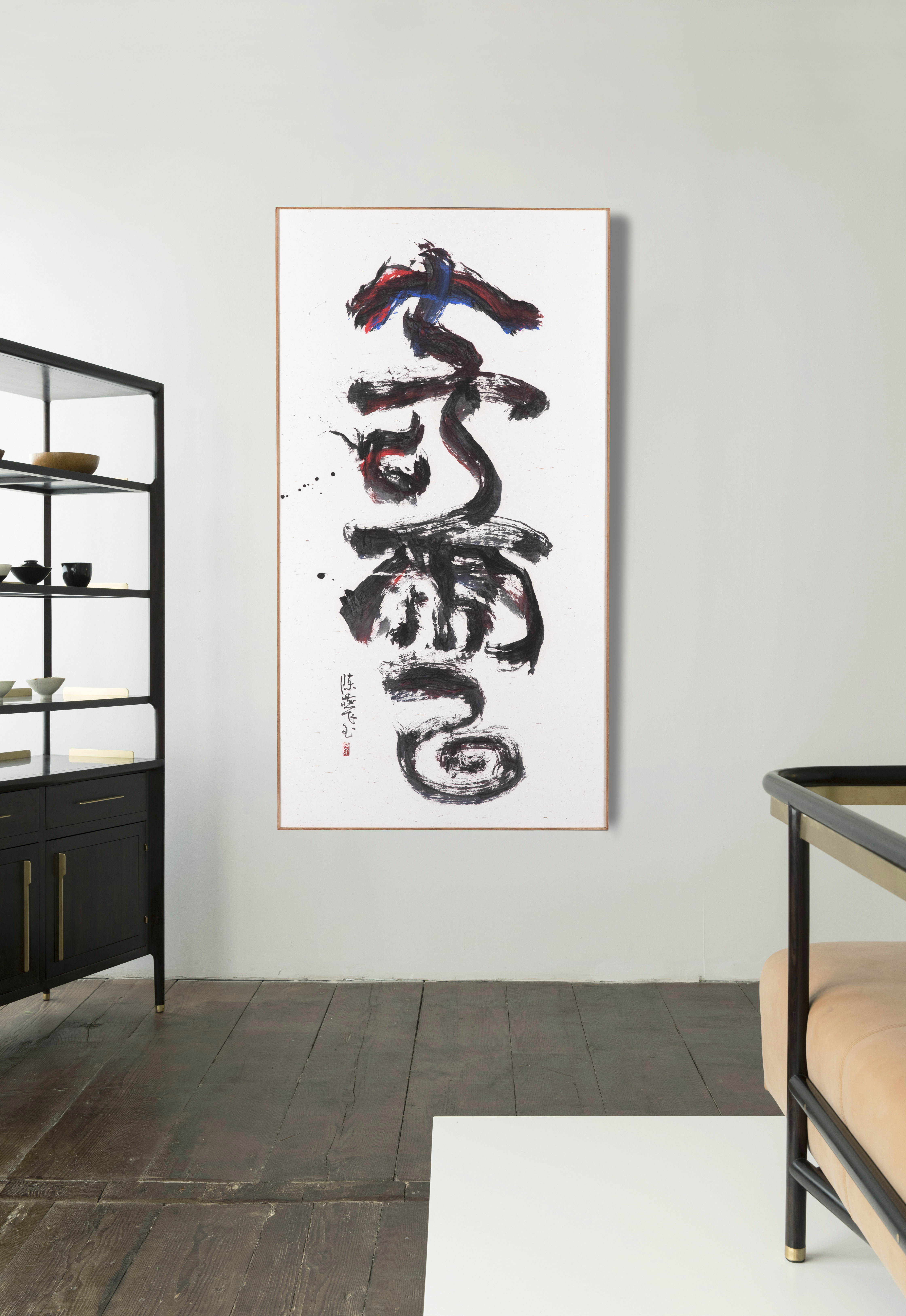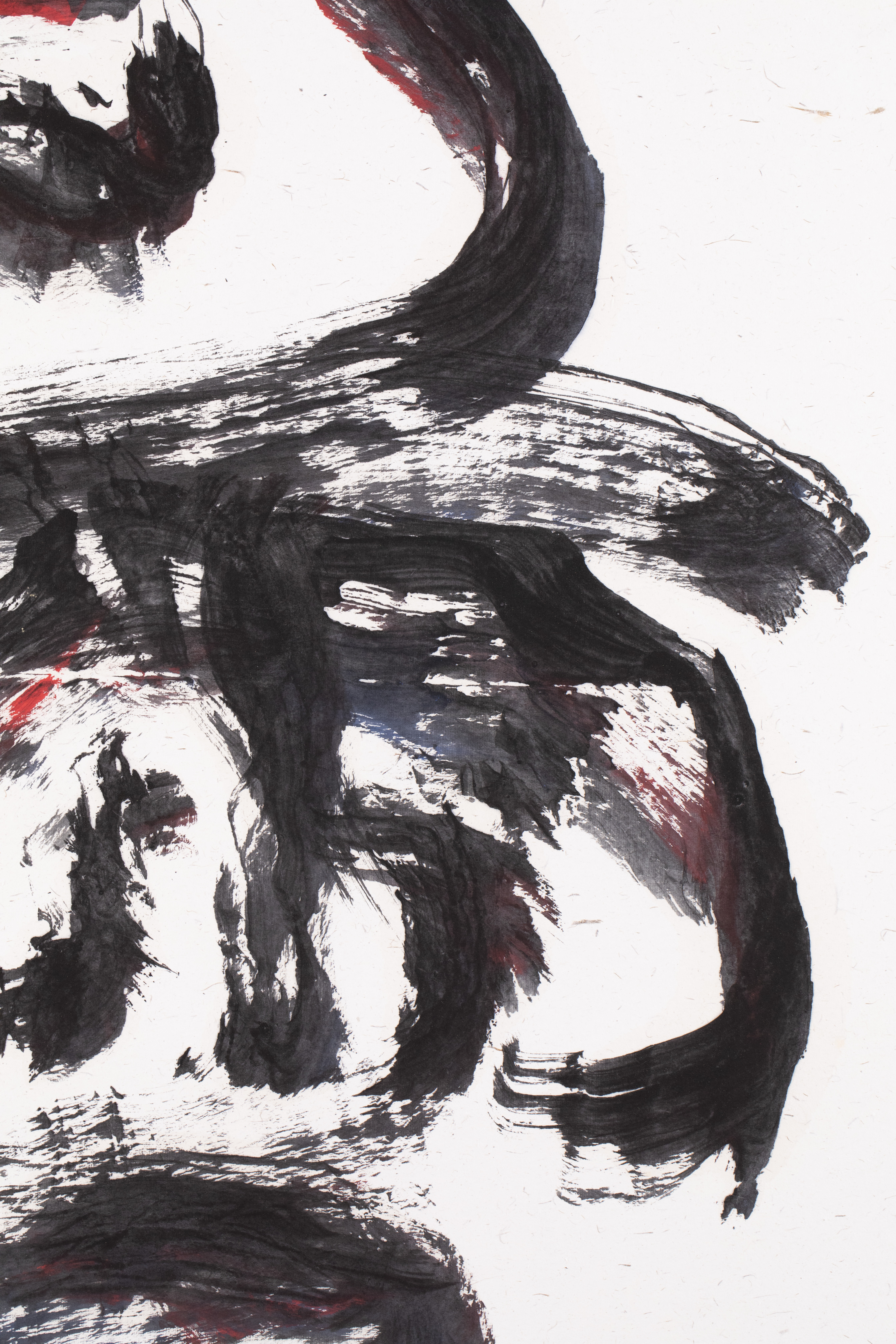 此作品几处彩墨渲染,于深浓的黑墨中焕发光彩。墨迹的枯浓与线条的变化如行云流水,走笔舒展飞扬、飘逸流丽,颇有趣味,整体予人明朗畅快之感。