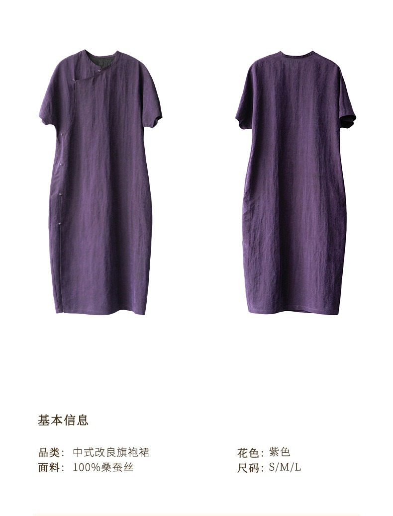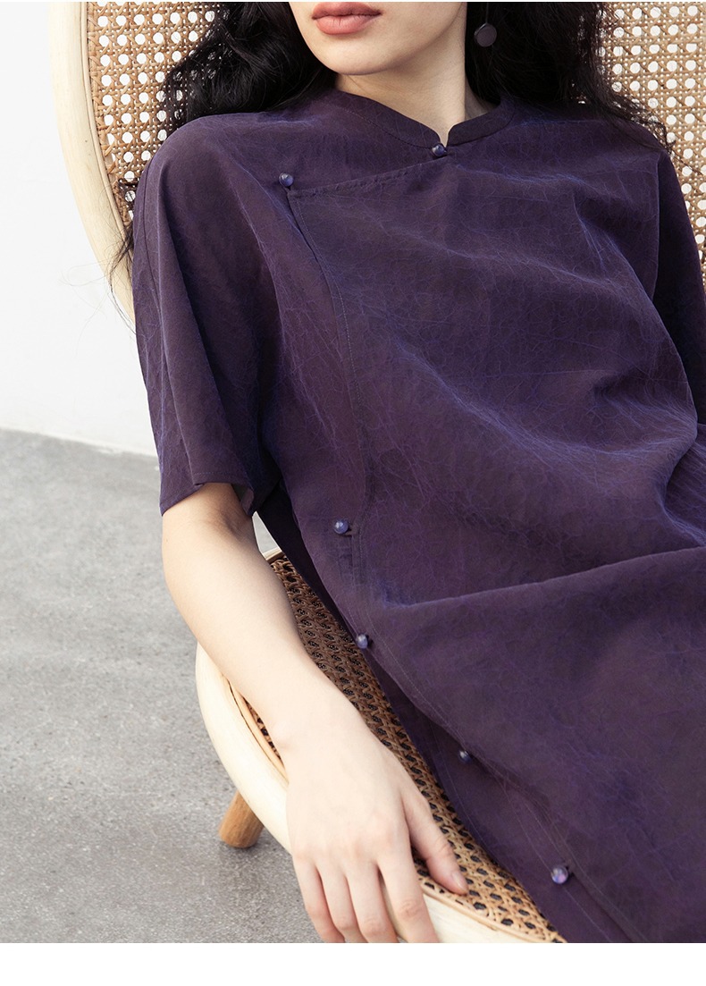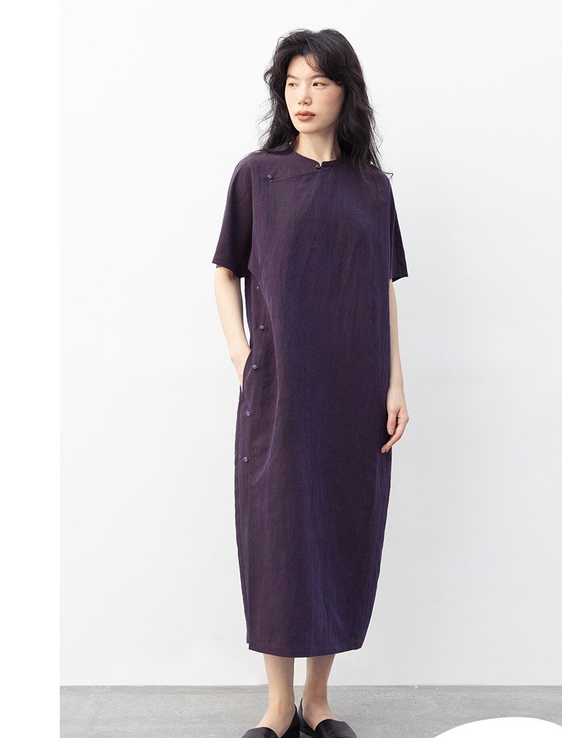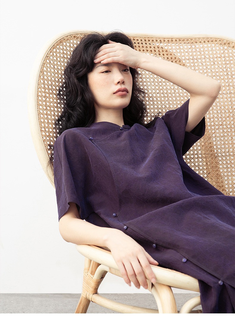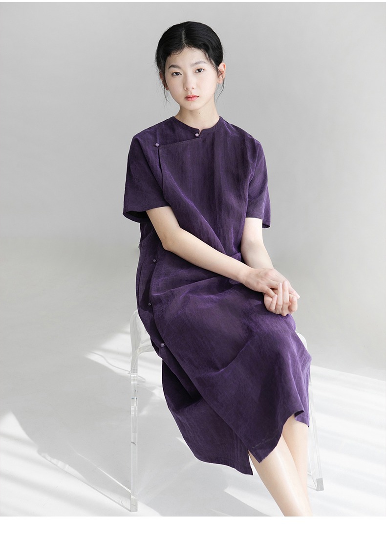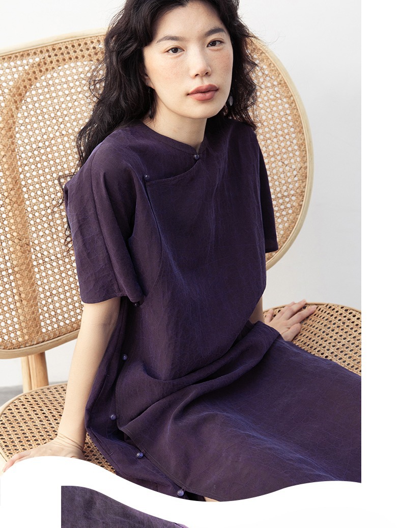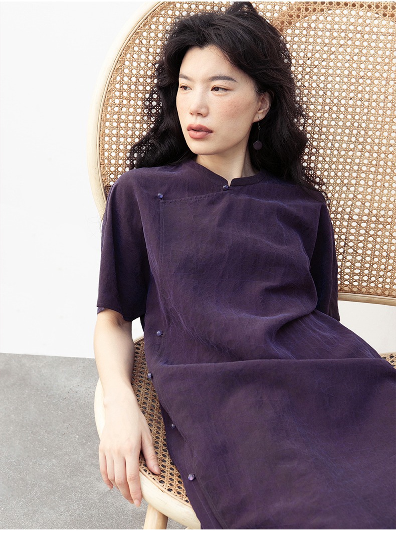 丁摩 真丝香云纱龟裂纹新中式紫色改良旗袍100%桑蚕丝连衣裙5ZF-34710