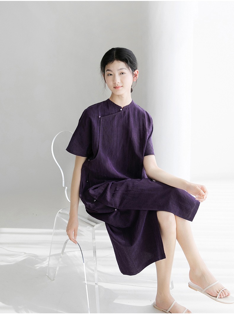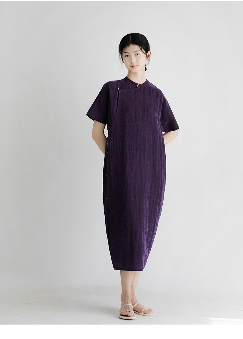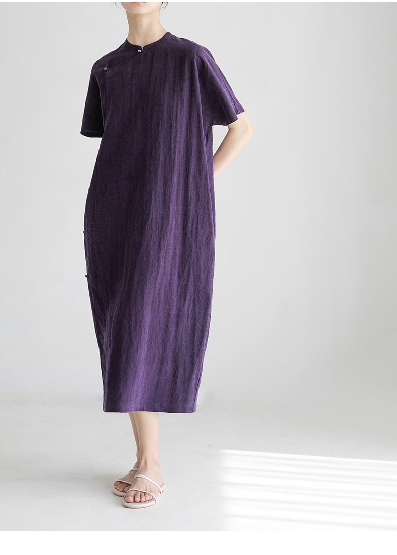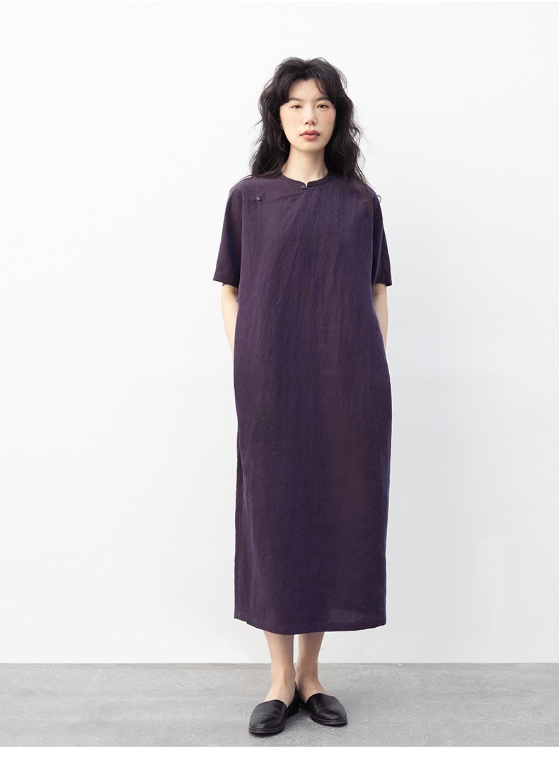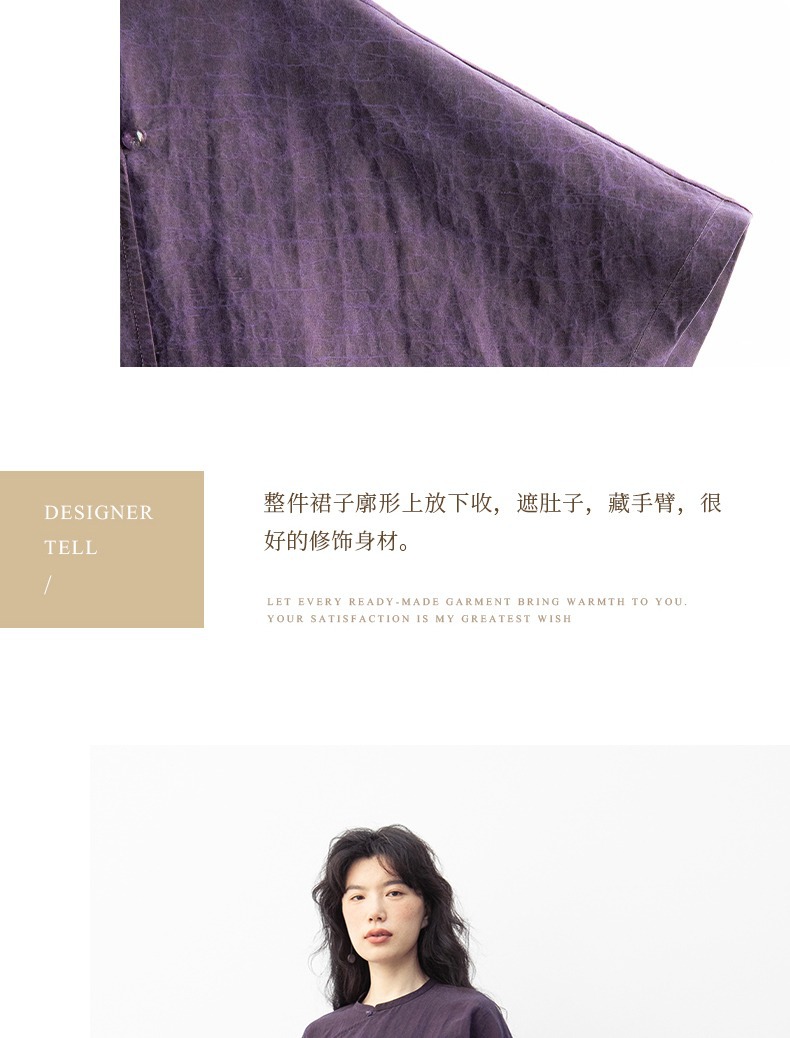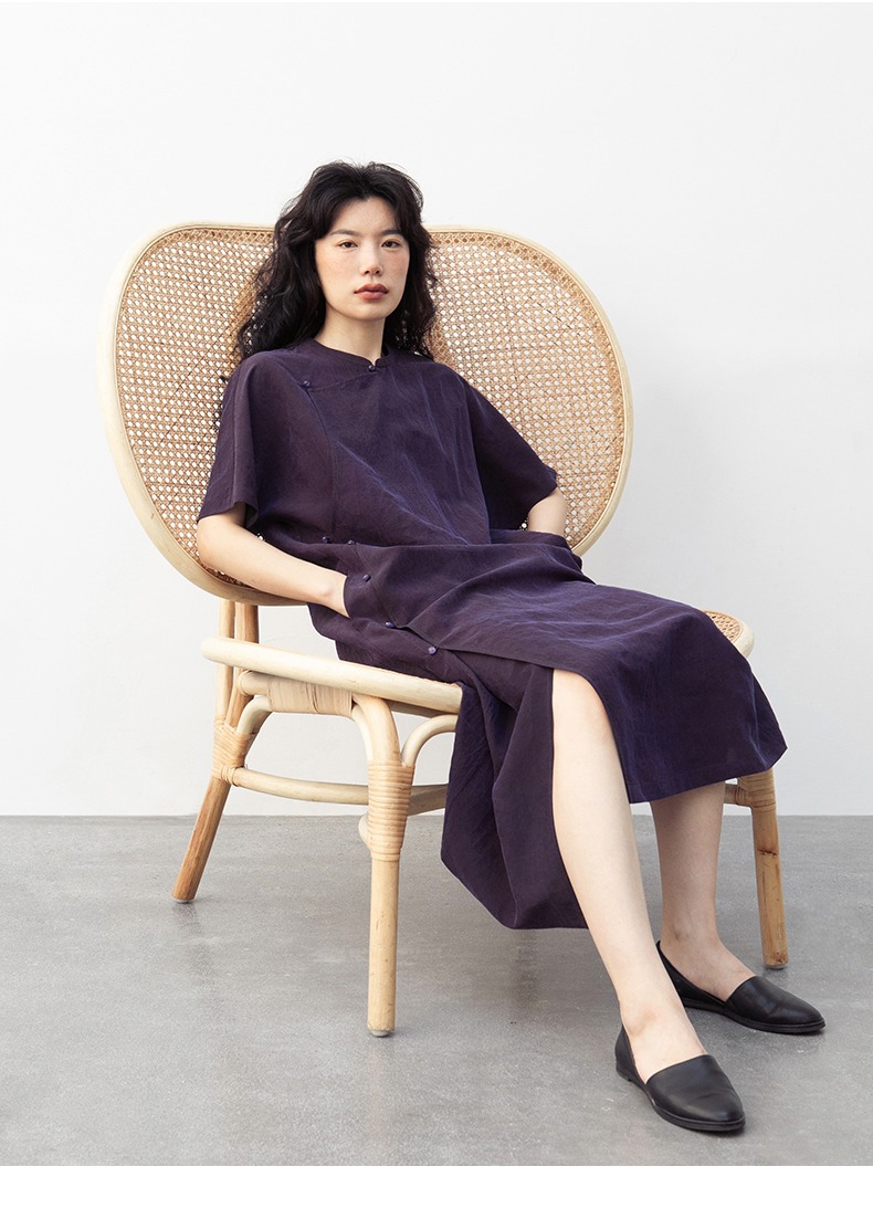 丁摩 真丝香云纱龟裂纹新中式紫色改良旗袍100%桑蚕丝连衣裙5ZF-34710