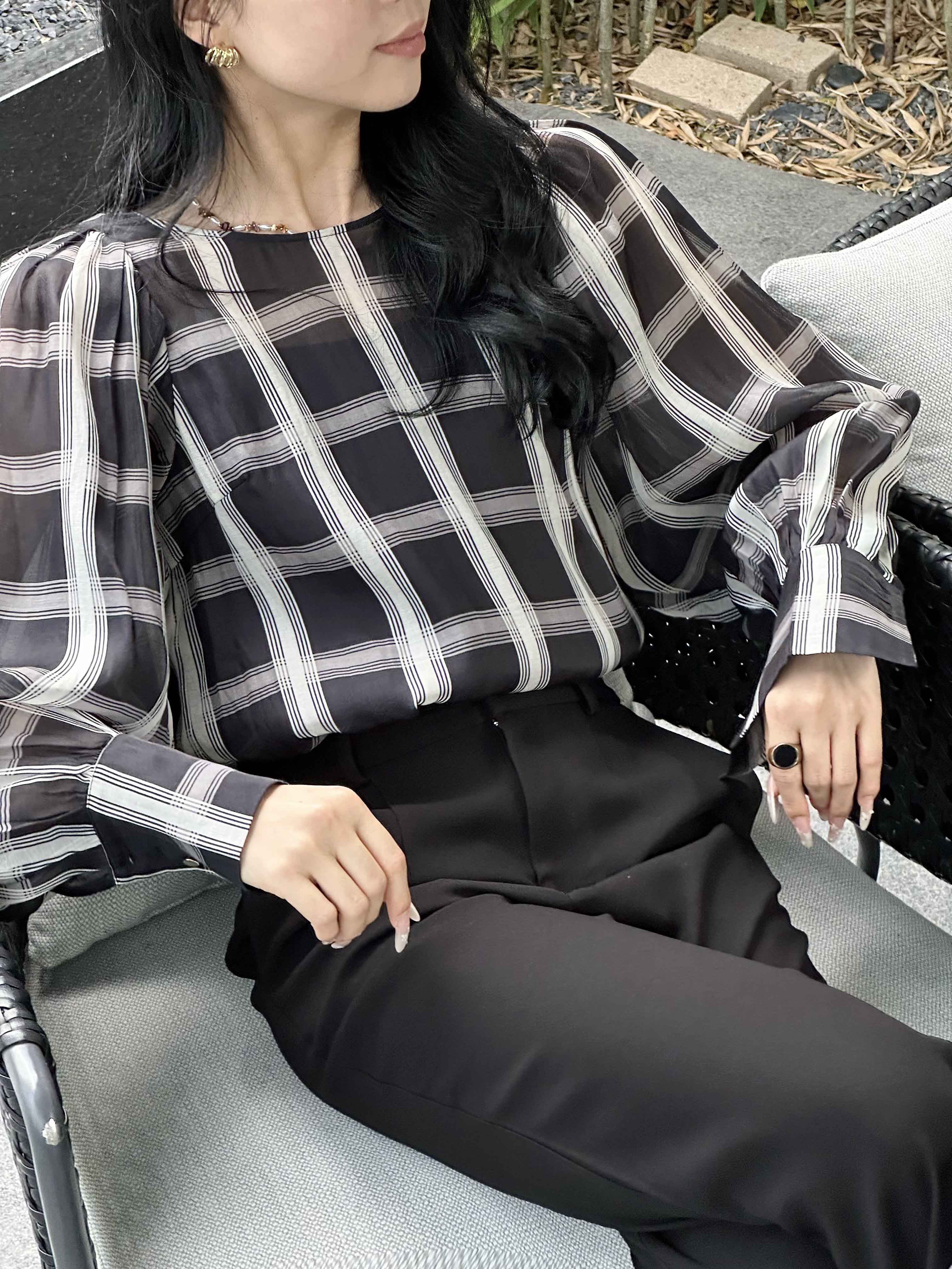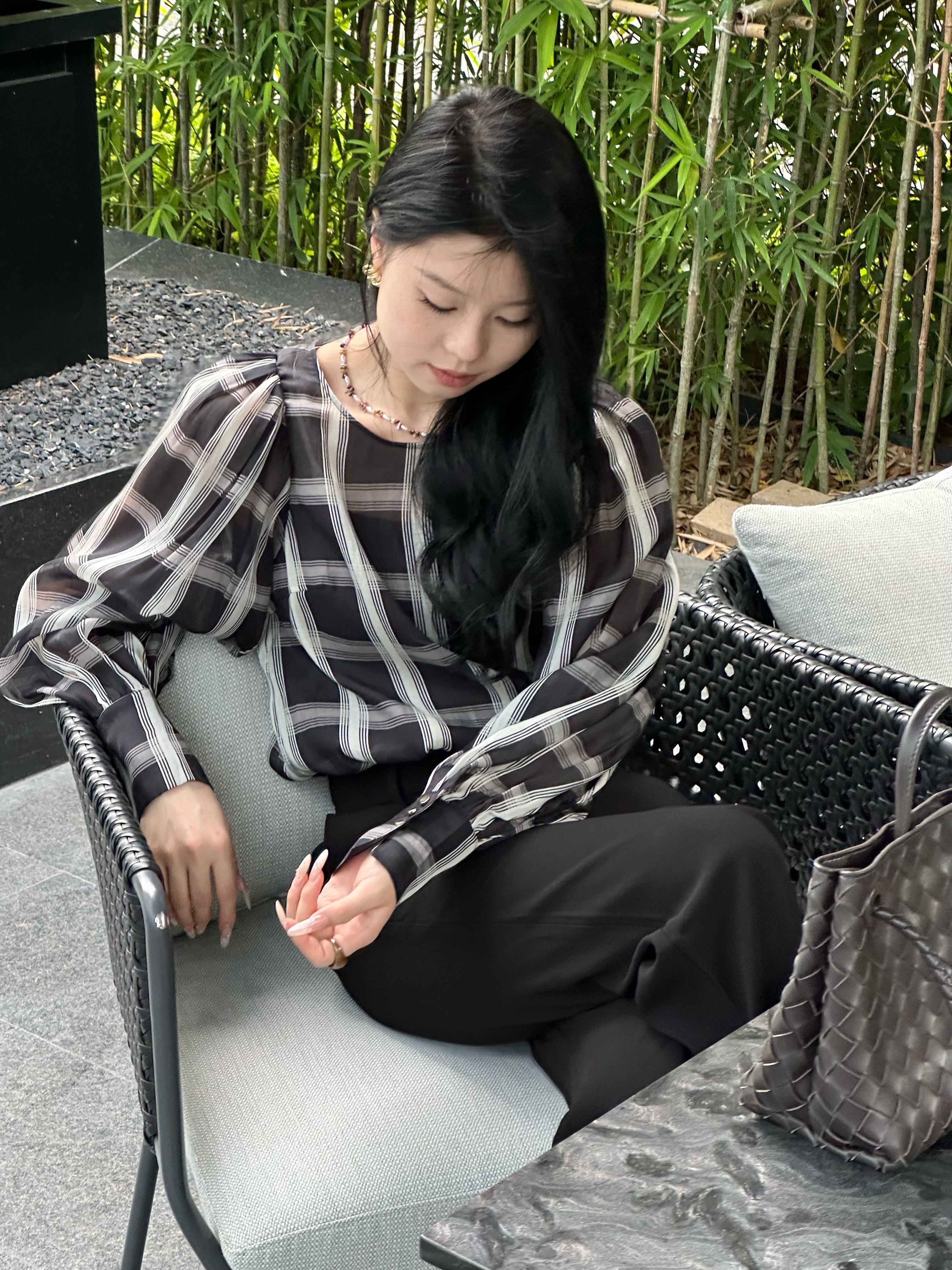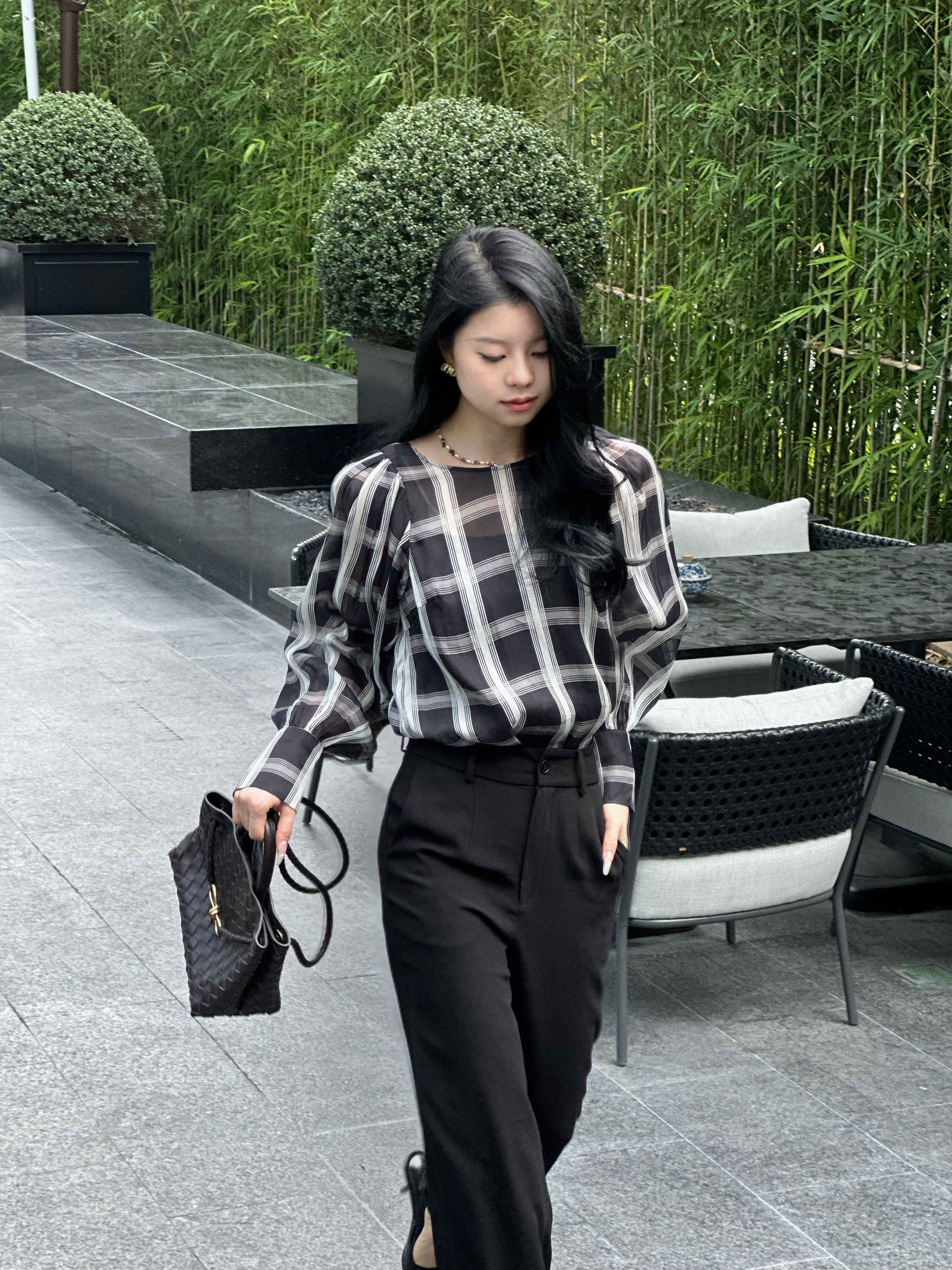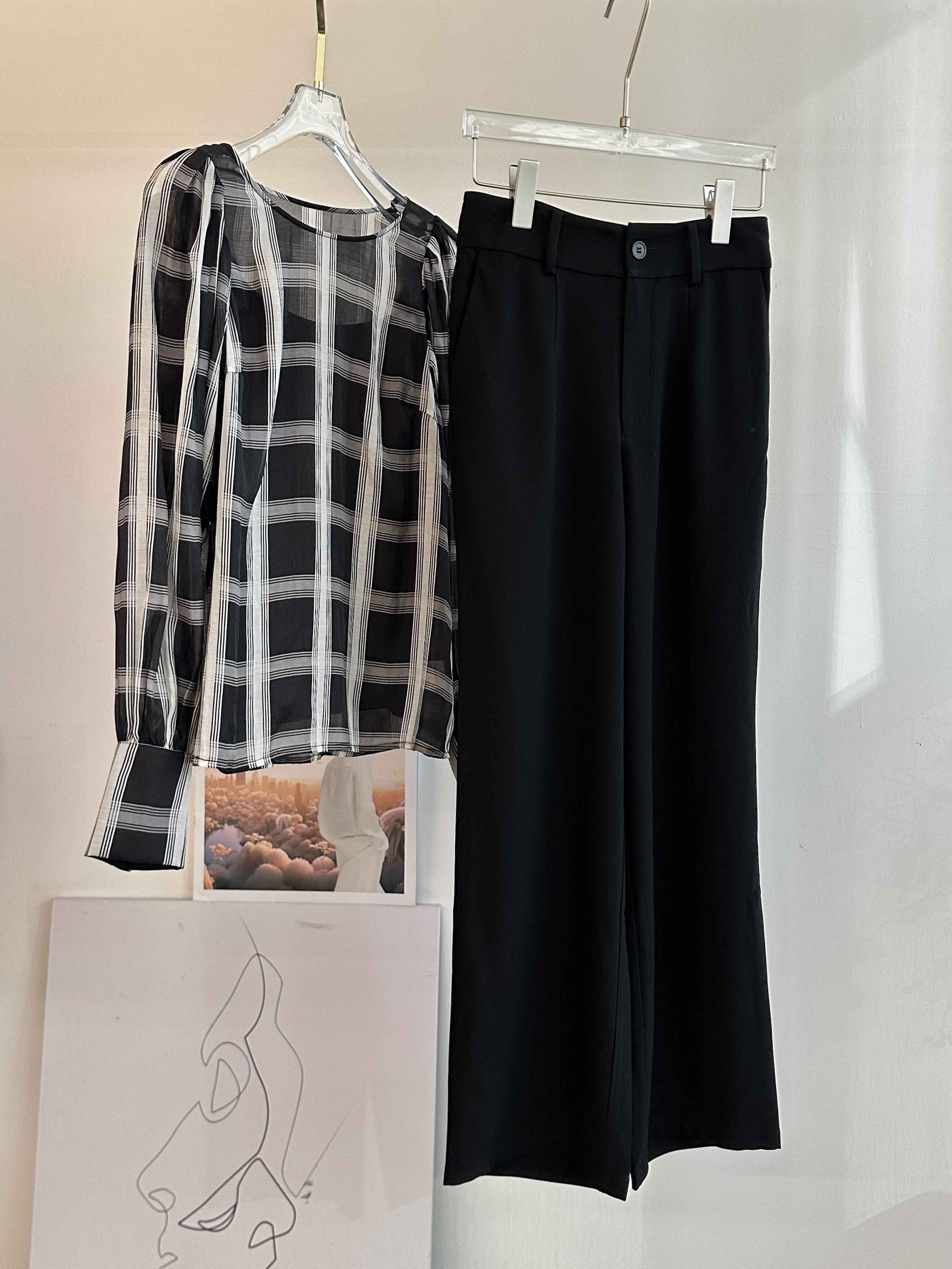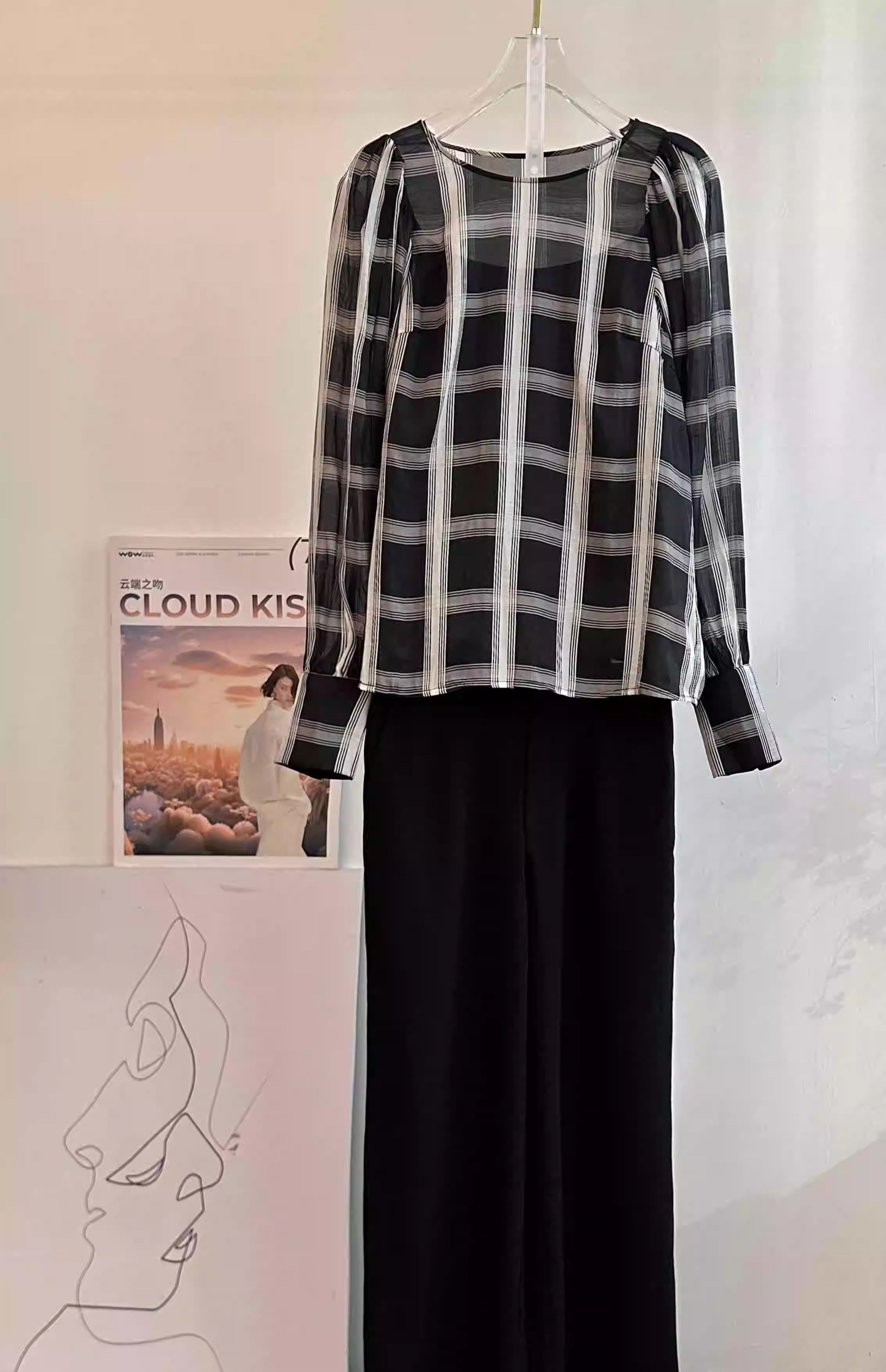 顺丰包邮洛诗琳99437春季精致丝绵格子上衣气质直筒长裤套装0120