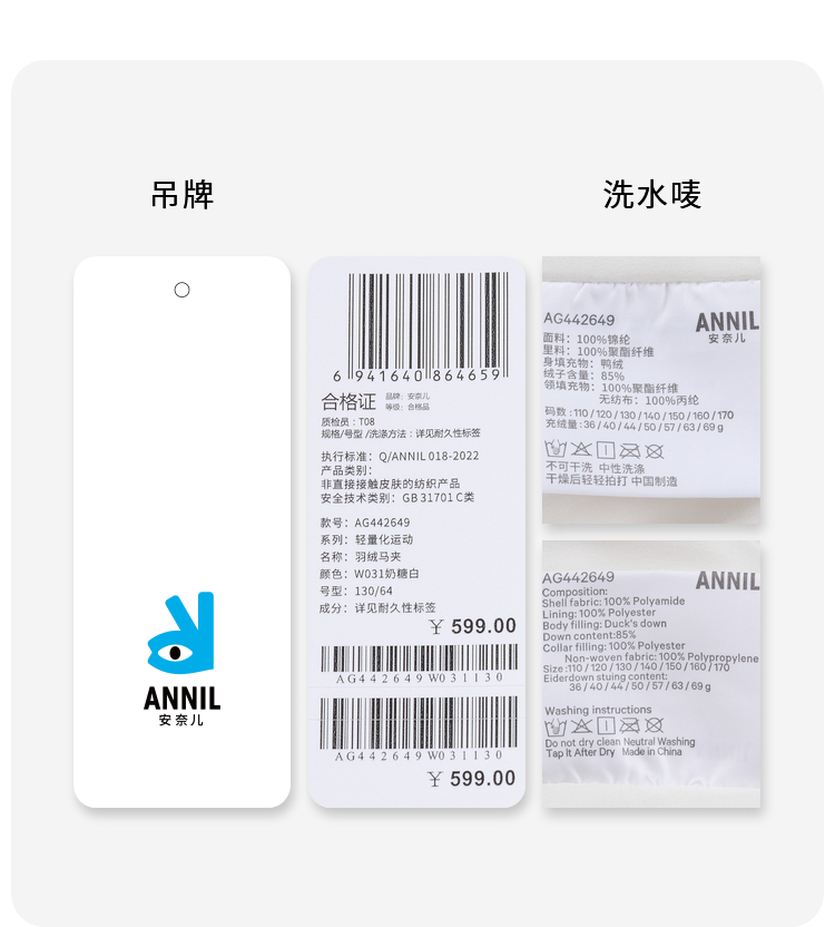 【轻暖0~10℃】女童净色三防马夹冬季新款安奈儿童装实体店同款AG442649