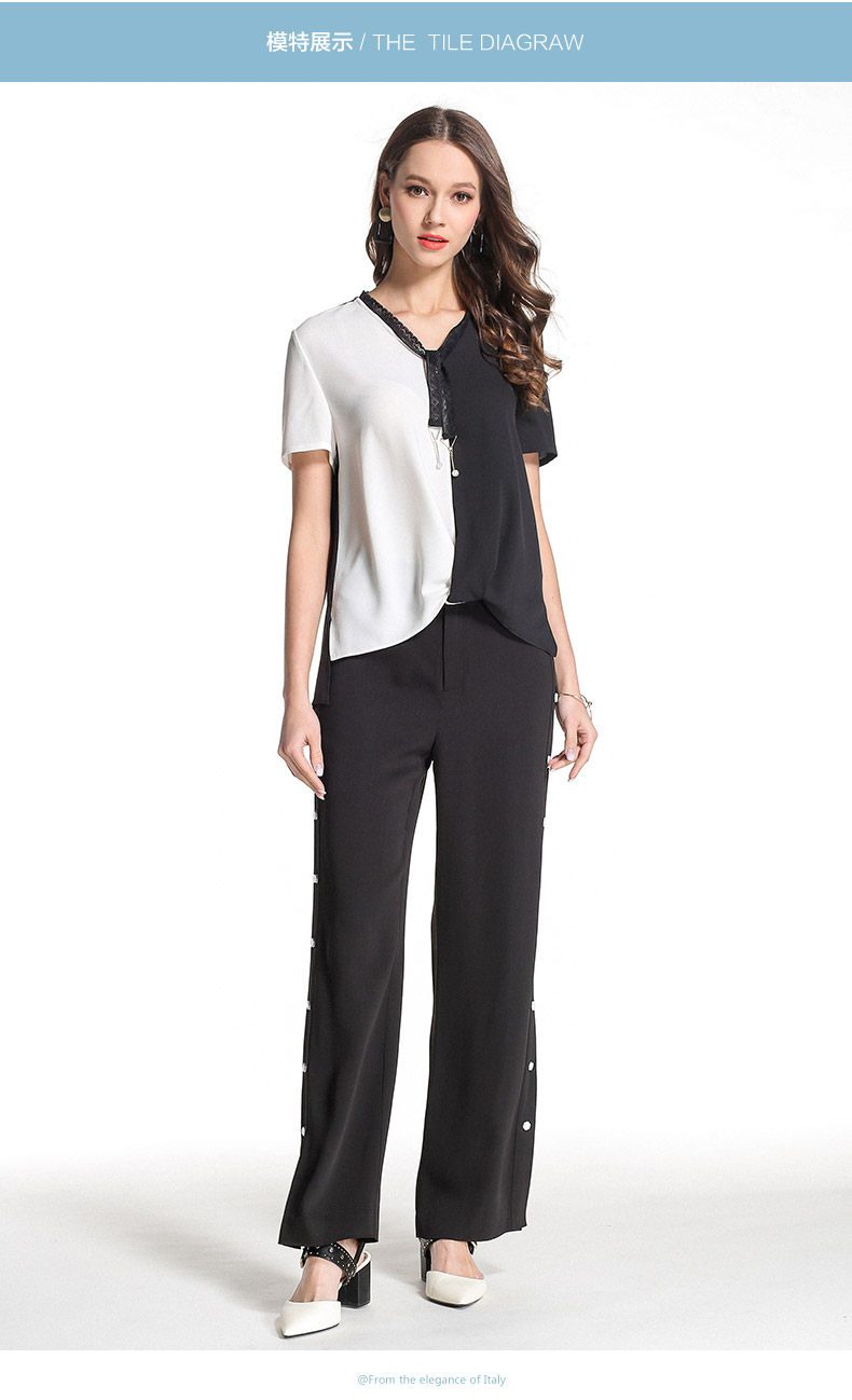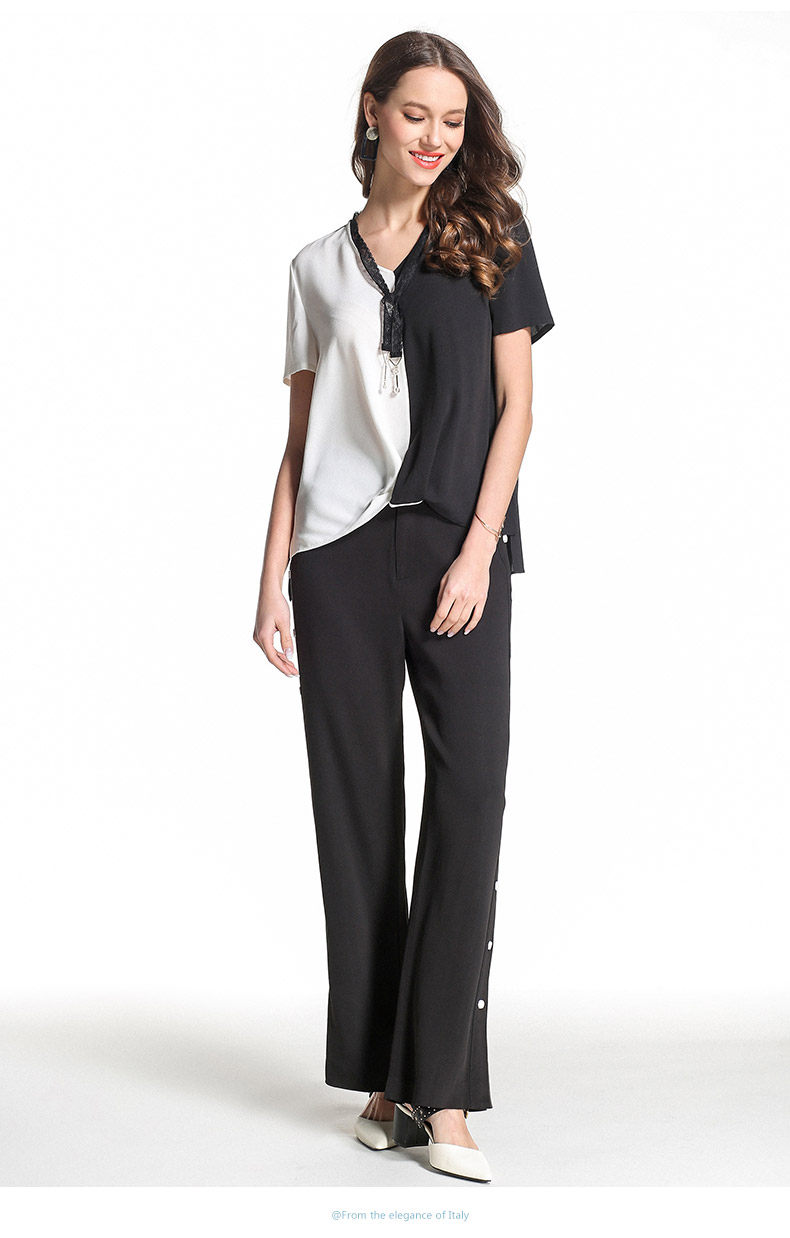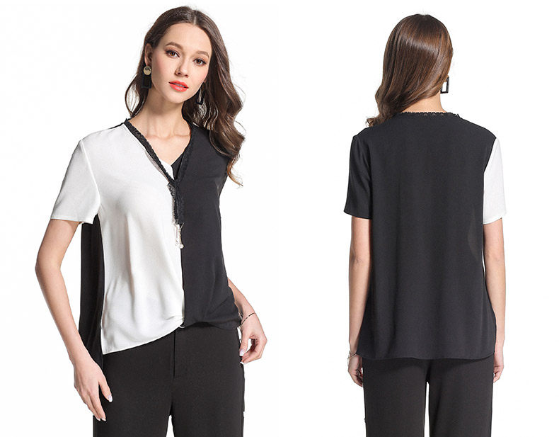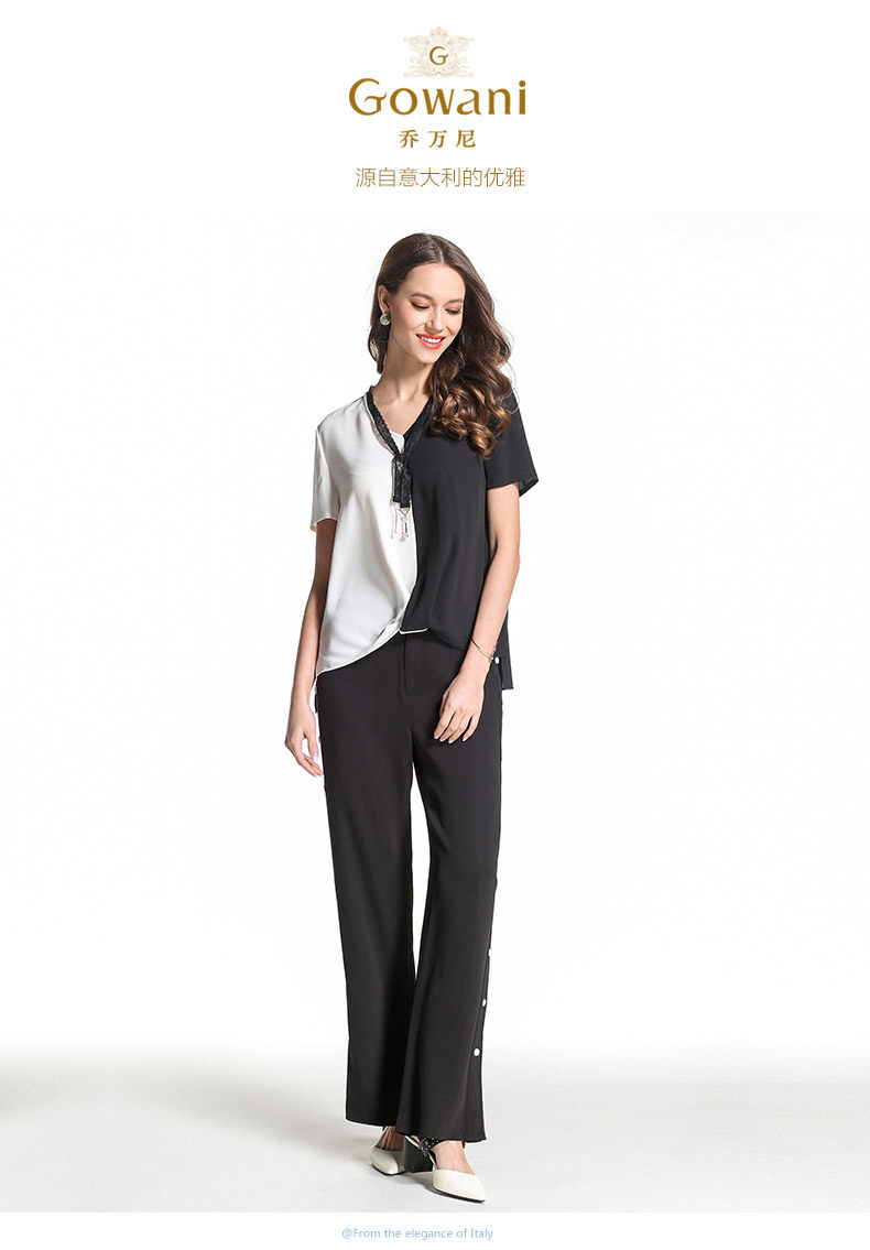 乔万尼桑蚕丝衬衫v领时尚黑白拼色宽松短袖真丝上衣EB2C862