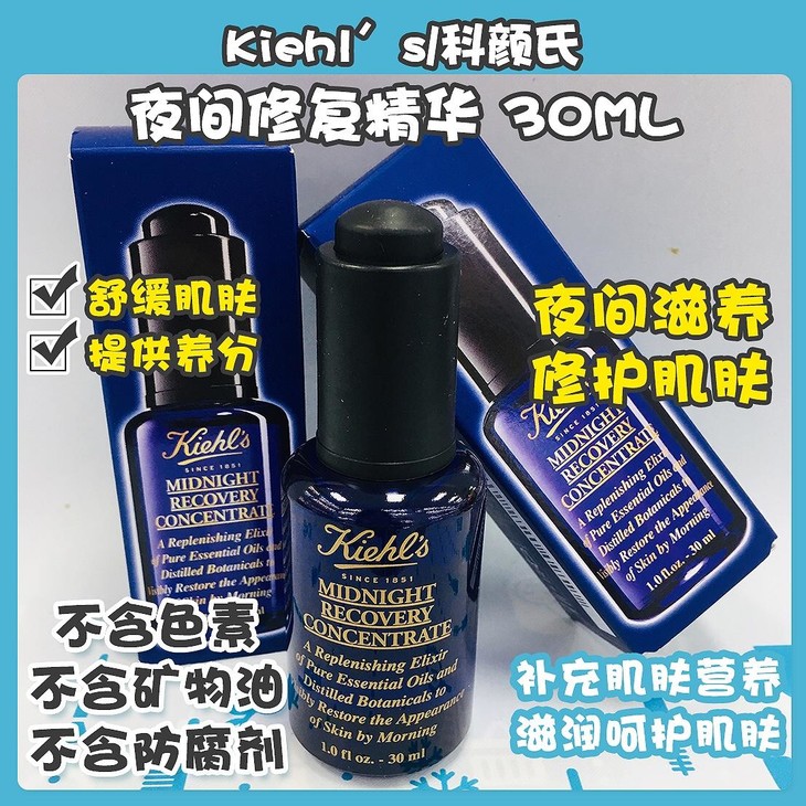 👑科颜氏夜间修复精华 👍它又叫蓝精灵💙 ,里面含有角鲨烷成分,能修复皮肤角质层🌬,一个晚上两滴精华💧,然后手掌加热按摩脸部💆,也可以采用提拉的方式按摩。精华内含99.8%的天然成分🌿,不添加防腐剂,早晨🌤就可以看到皮肤修复有明显效果啦,😲皮肤敏感干燥或者是痘痘之类的,第二天都会得到缓解哟。脸部看起来就是很有光泽的感觉✨~还增加皮肤自身修复机能呢!