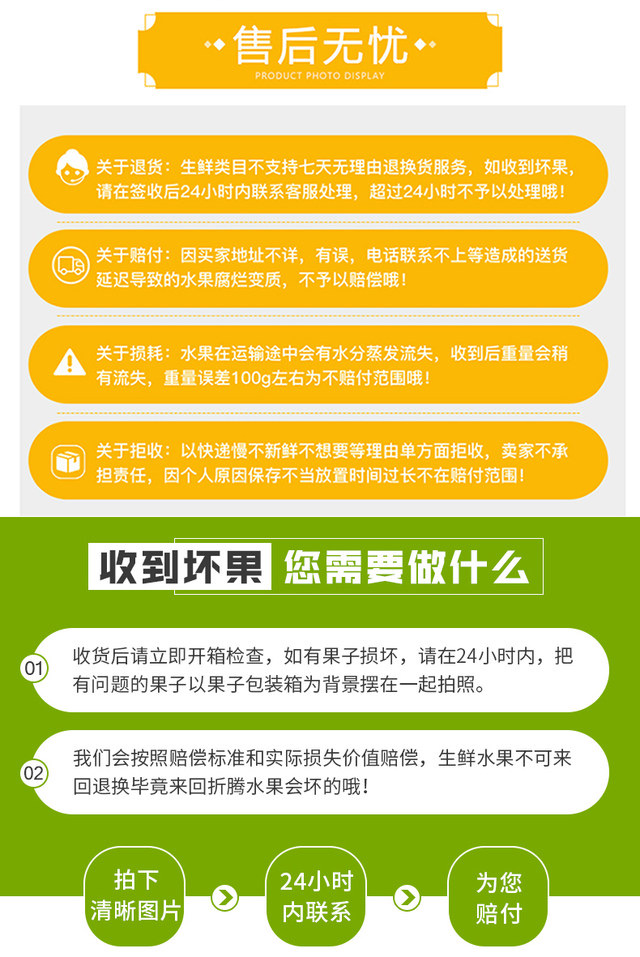 售后:坏果包赔!按个数比例赔付,维纳斯果皮很薄,采果运输途中会产生轻微挤压伤属于正常现象 不影响食用,非常轻微的挤压伤不售后