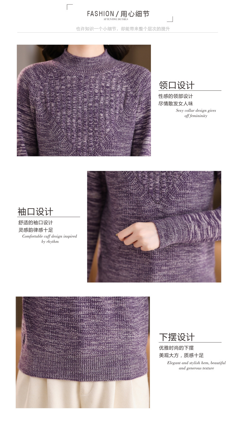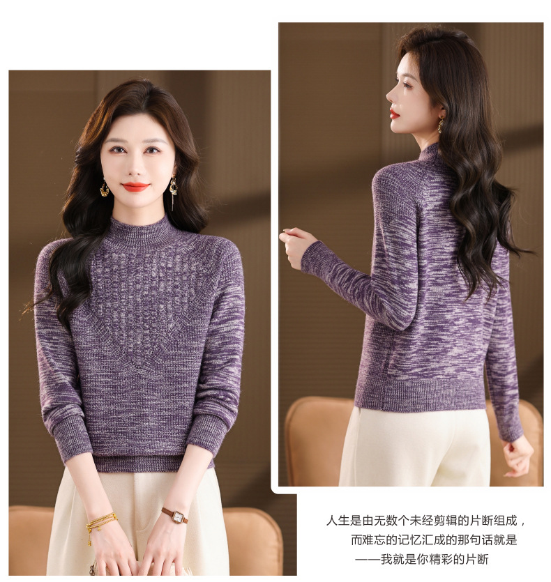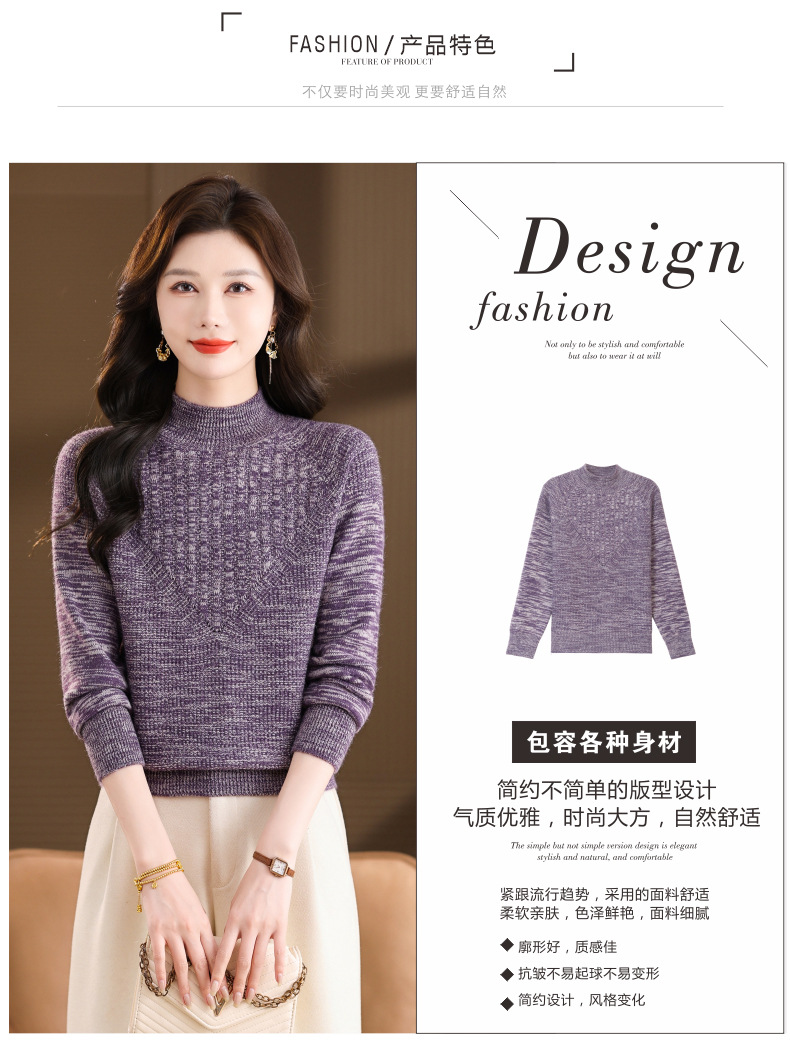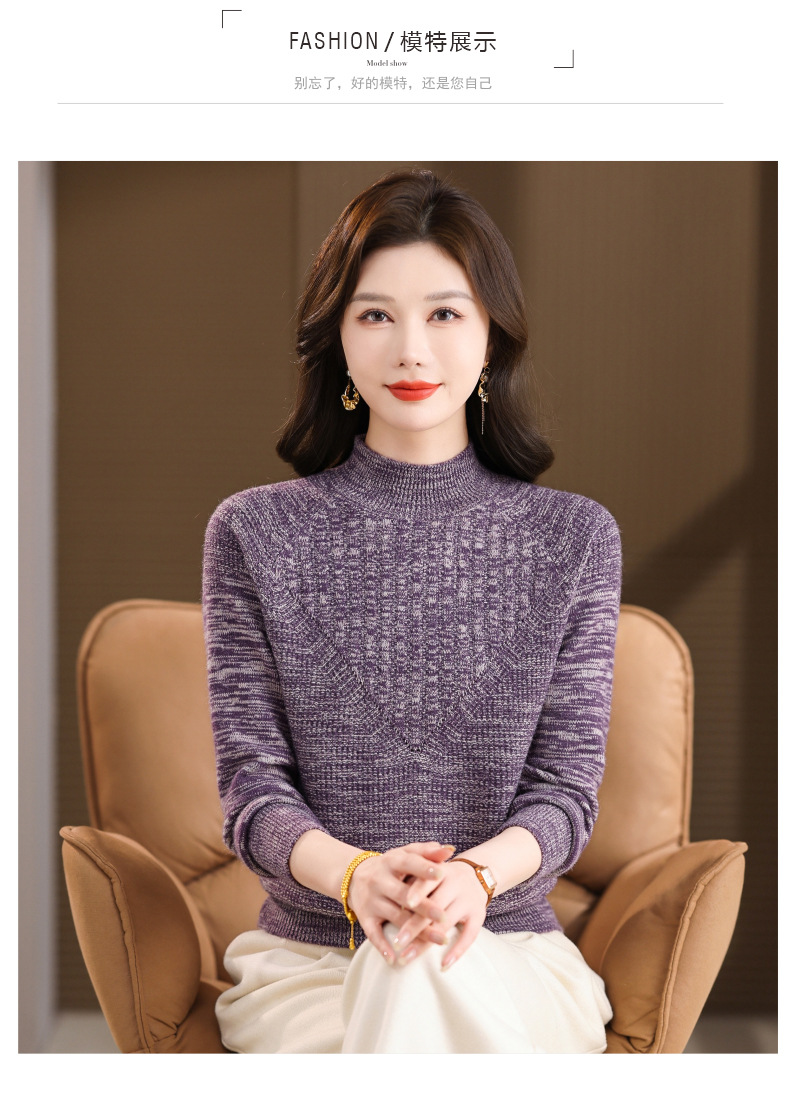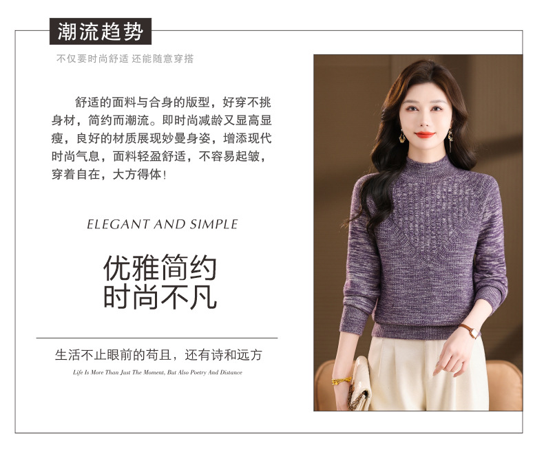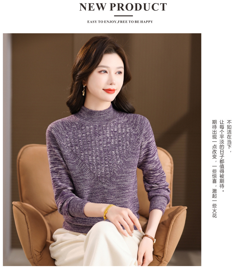 CC复古杂色半高领提花针织衫女秋冬季显瘦厚款紫色套头内搭外穿毛衣