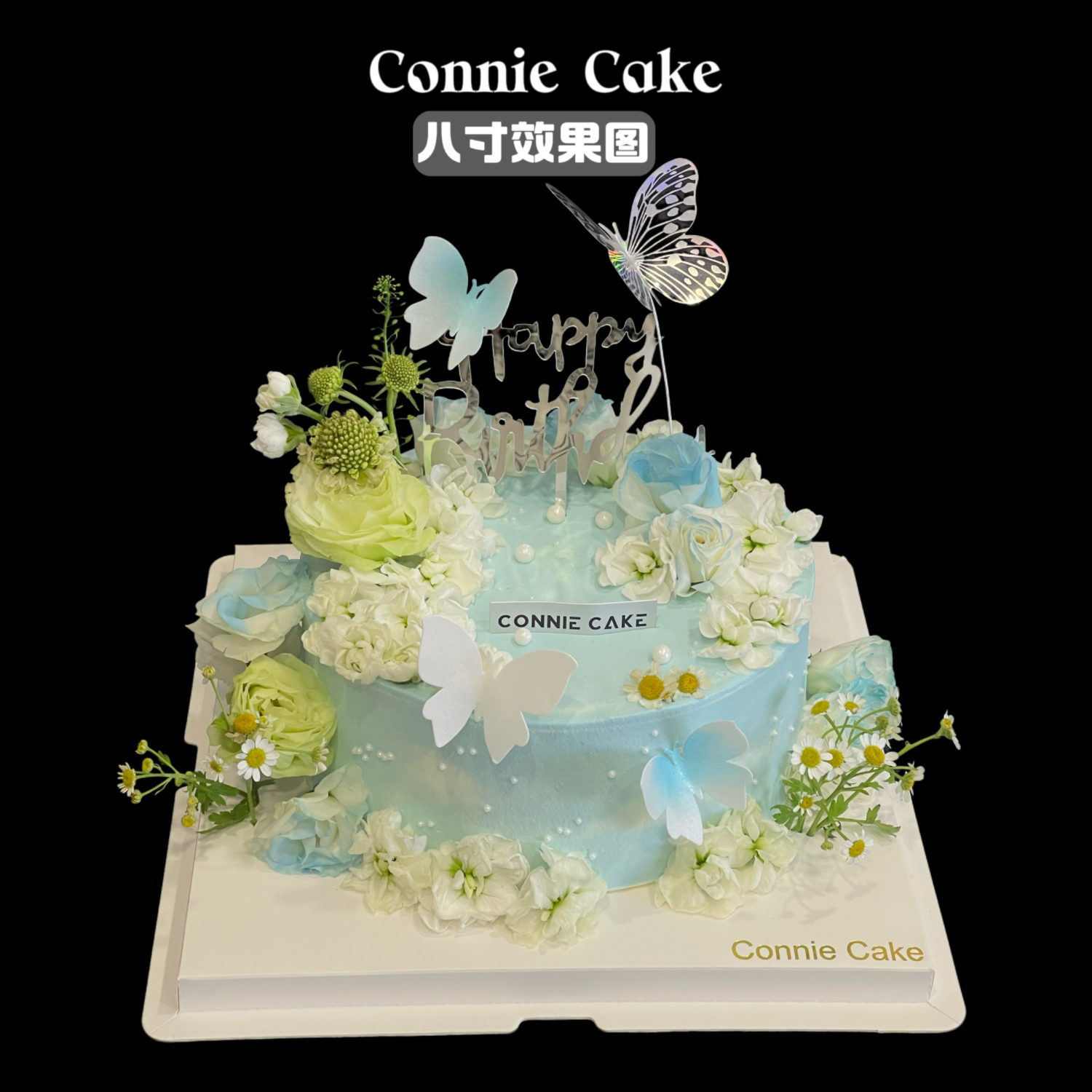 仿佛将夏日的晴空与花园的浪漫一同捧到您面前——柔和的蓝如梦境般温柔,层层奶油晕染出细腻的云朵质感。蛋糕顶端缀满新鲜白色紫罗兰,花瓣轻盈舒展,桔梗与小雏菊簇拥其间,宛如繁星洒落,每一朵都藏着清新的自然气息。