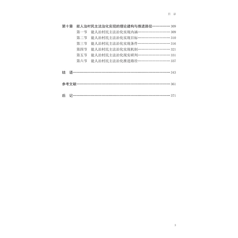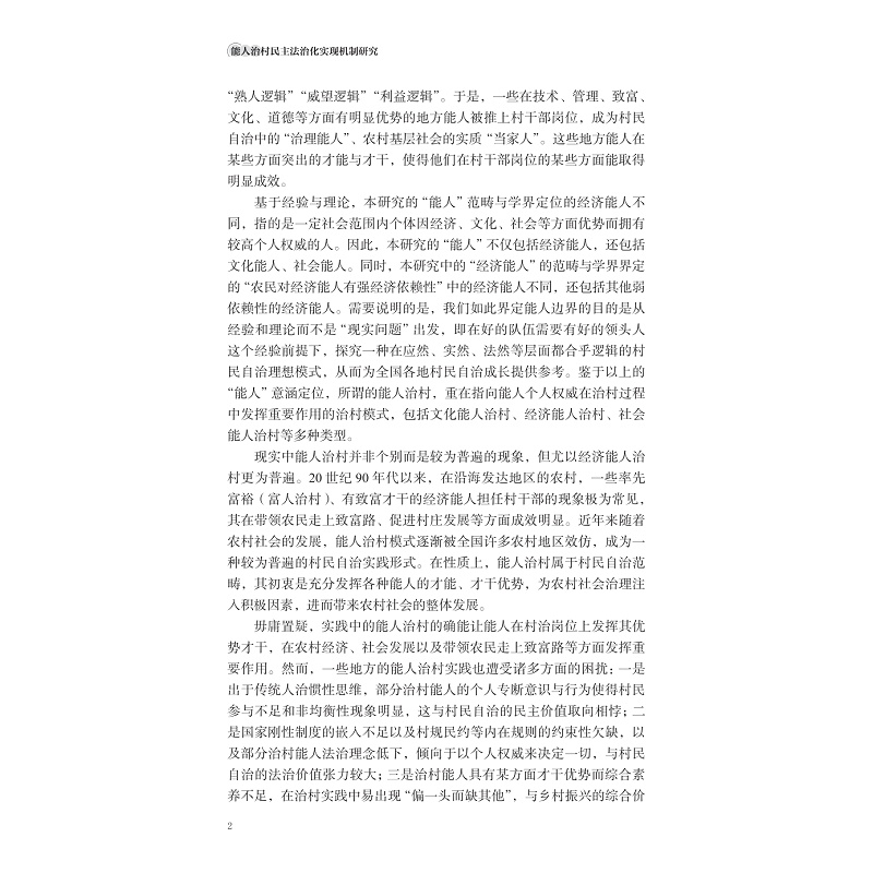 国家社科基金项目成果。能人治村是村民自治重要实践形式,在全国各地普遍盛行。农村基层治理是国家治理重要组成部分,国家治理现代化和乡村振兴战略背景下,系统研究能人治村与农村基层民主法治建设,既是对国家治理法治现代化战略目标的理论回应,也是对中国特色社会主义制度运行机制实践探索。从研究角度看,本书针对能人治村是农村较为普遍治理现象及其与民主法治建设产生较大张力的现实,提出“能人治村民主法治化”这一理论命题。利用我国大力加强社会主义基层民主法治建设背景,对能人治村与民主法治间的契合性进行学理分析,剖析现实能人治村背离民主法治的种种迹象与缘由,探索“能人治村民主法治化”的动力、阻滞因素、内涵、目标以及推进路径等问题,这在能人治村和社会主义基层民主法治建设研究的理论视角与研究内容等方面具有重要学术价值。
