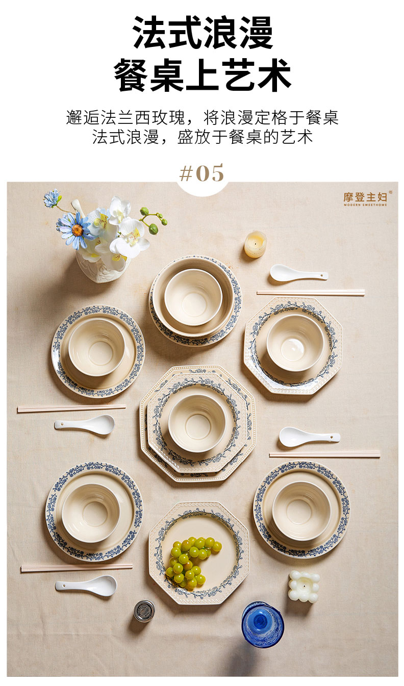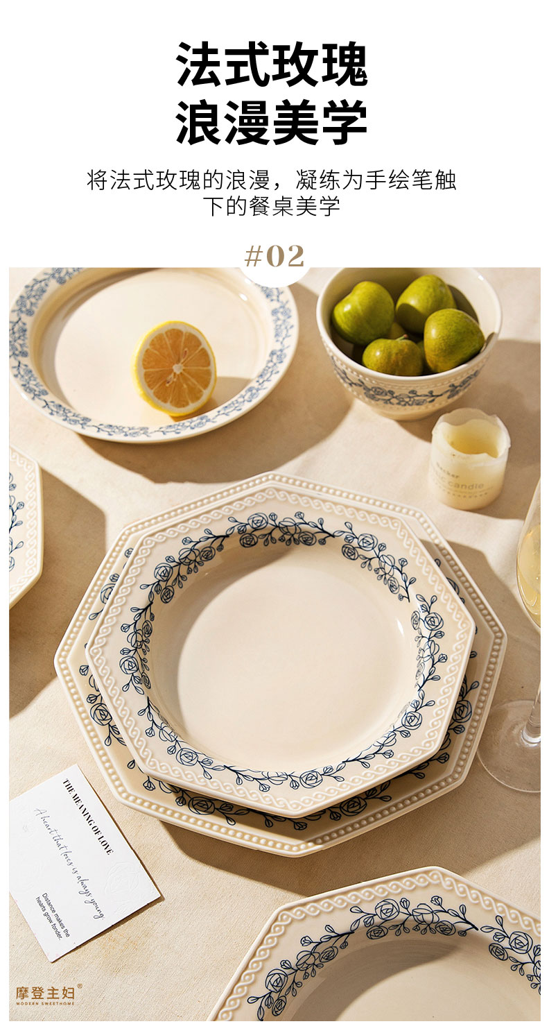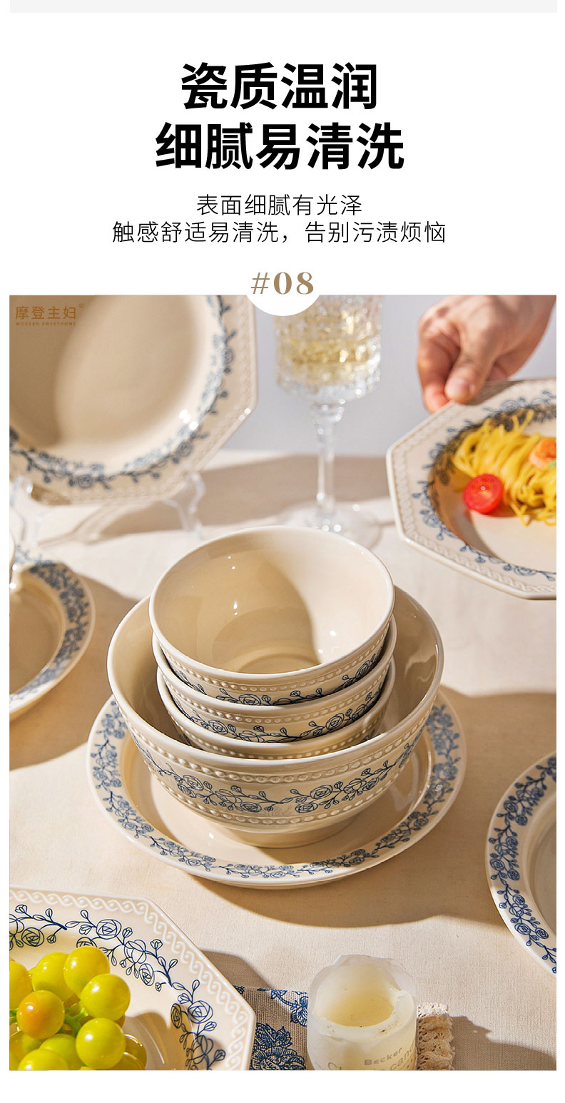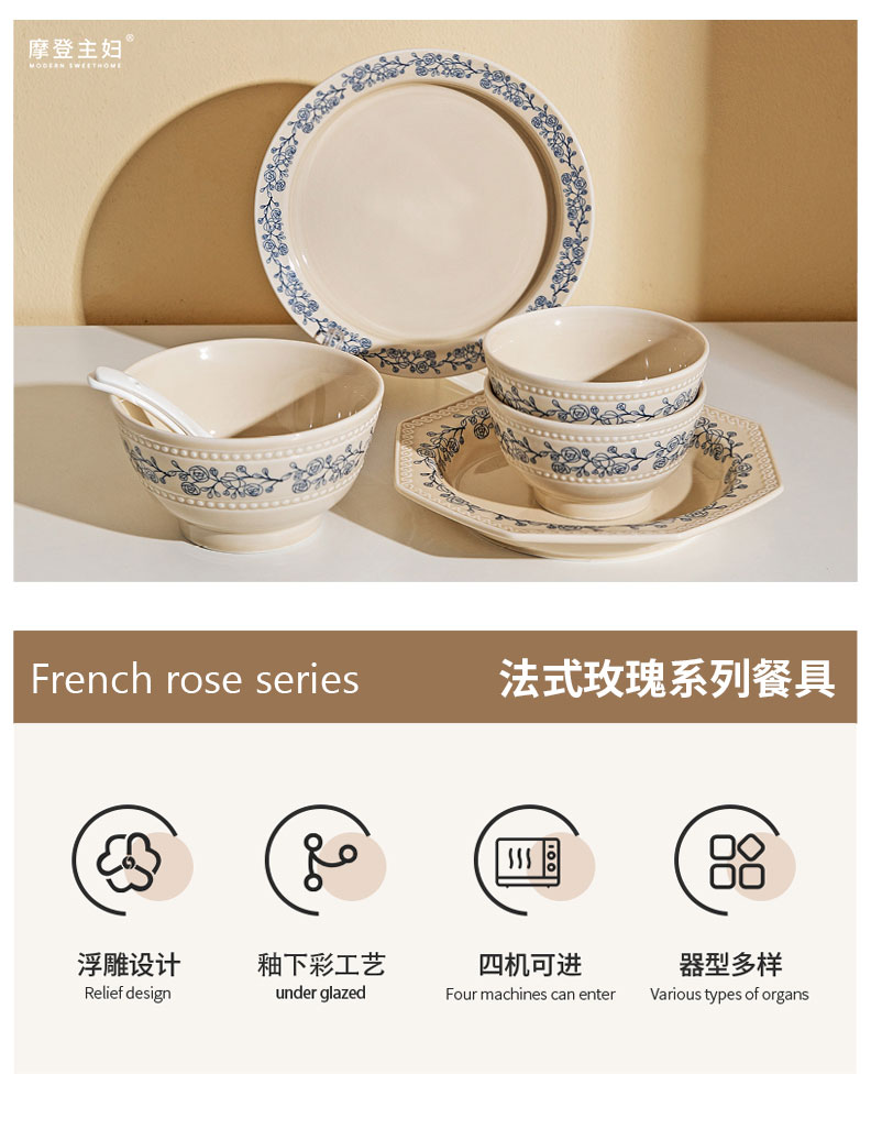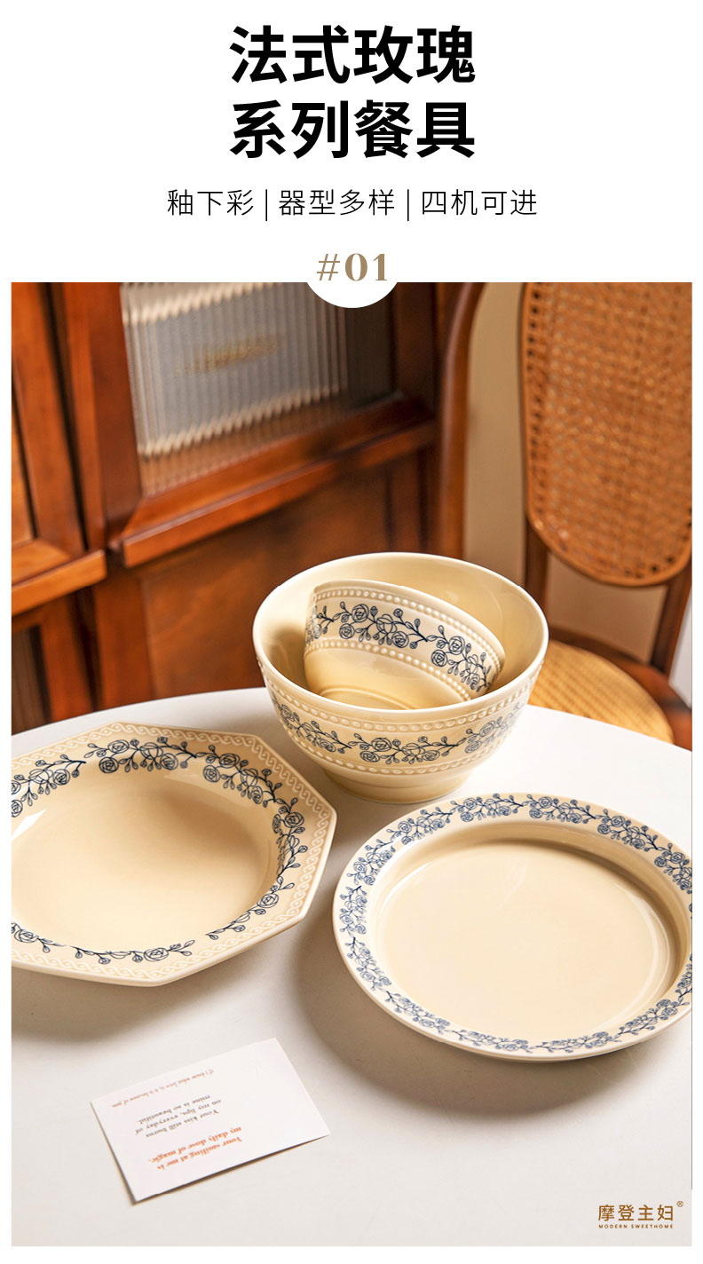 摩登主妇法式玫瑰釉下彩餐具饭碗家用2025新款碗具汤碗餐盘子法式碗盘套装