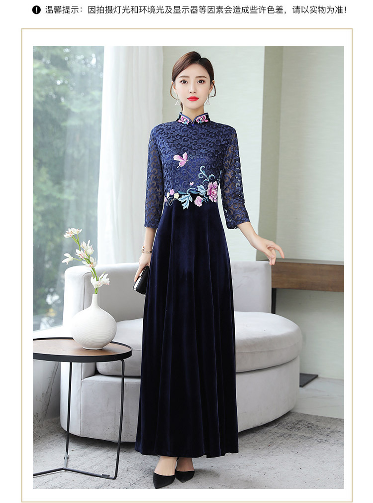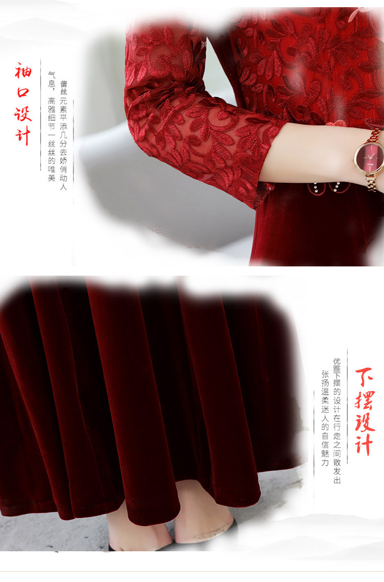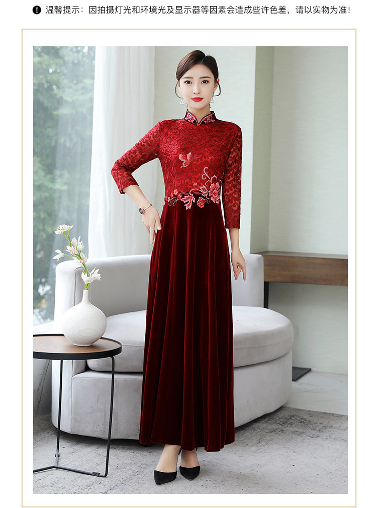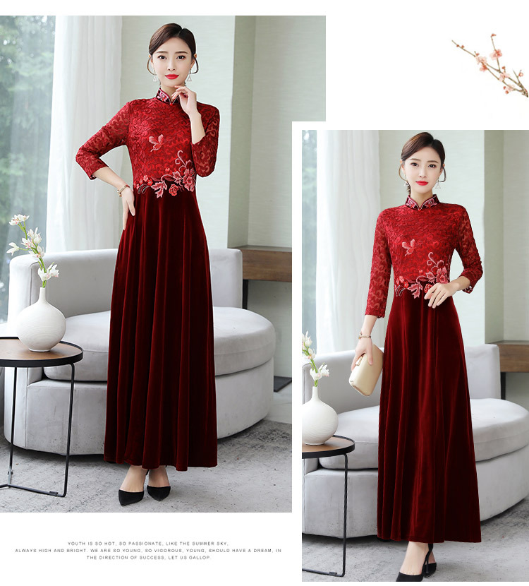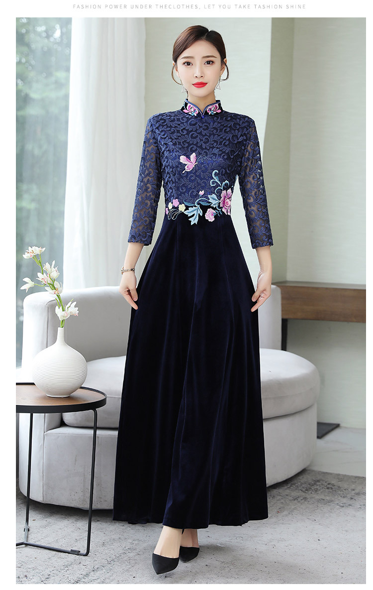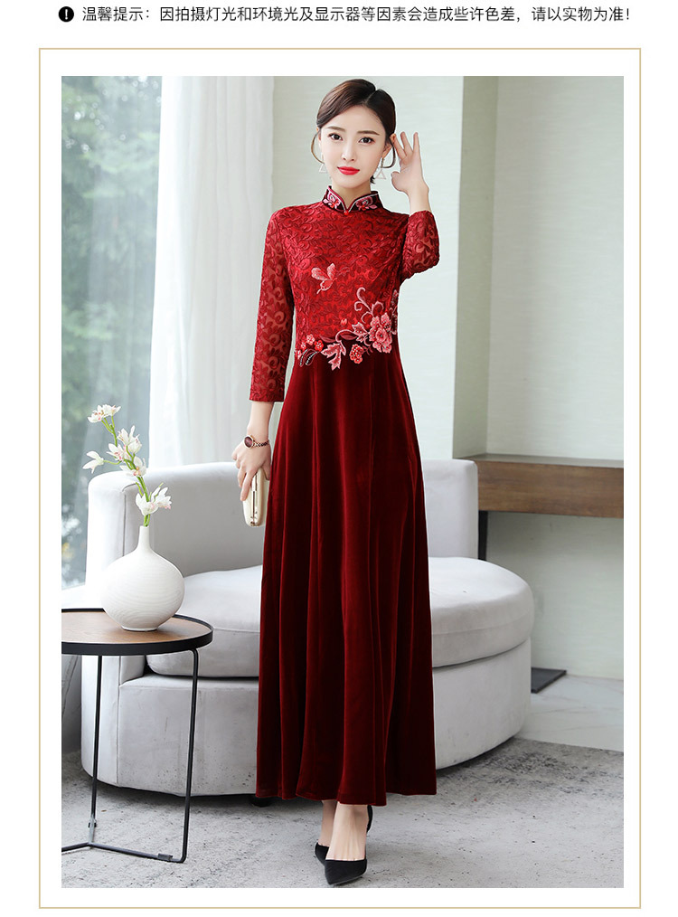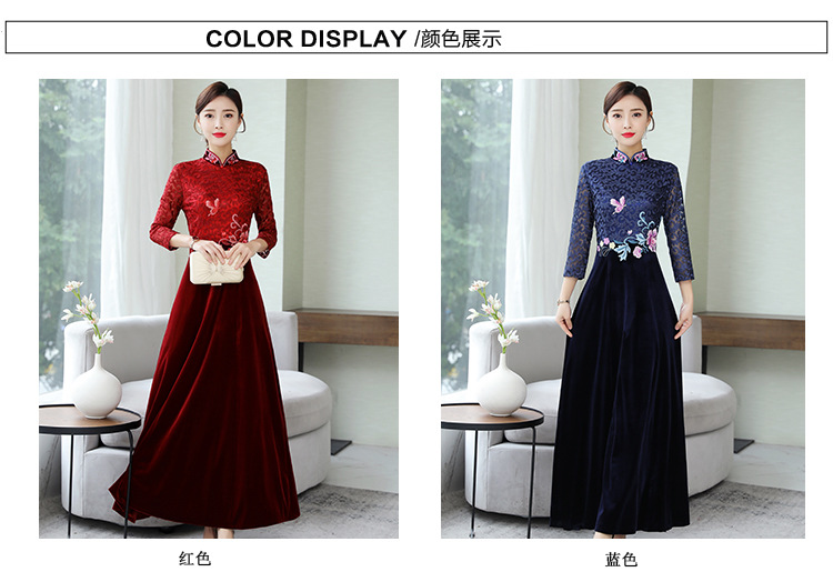 HT9256新款时尚优雅气质修身立领加绒加厚丝绒印花连衣裙