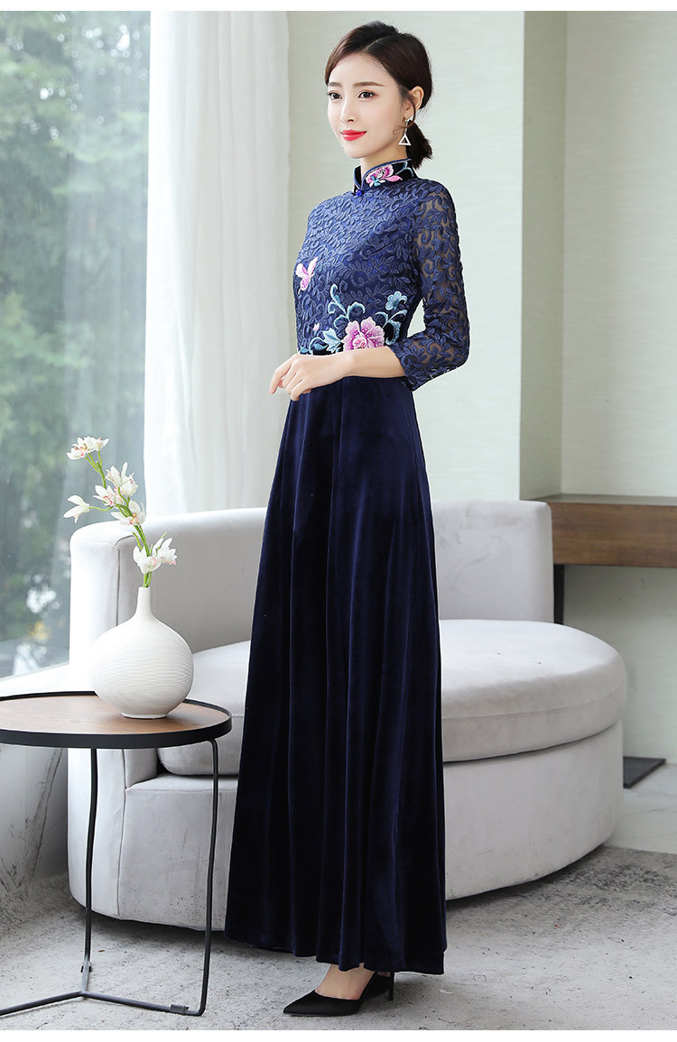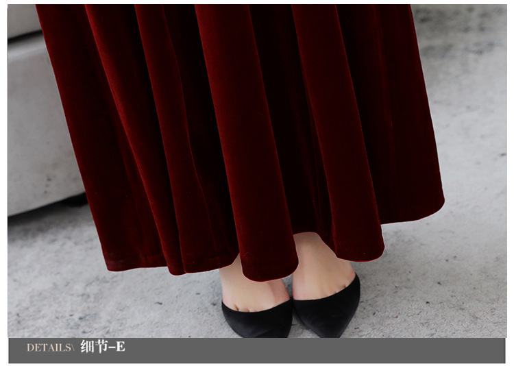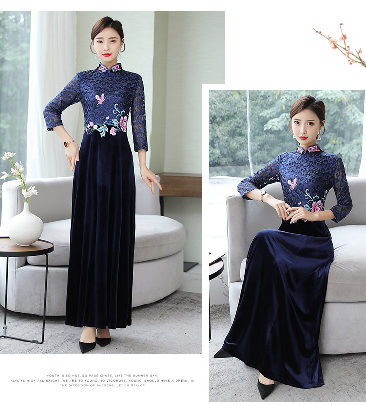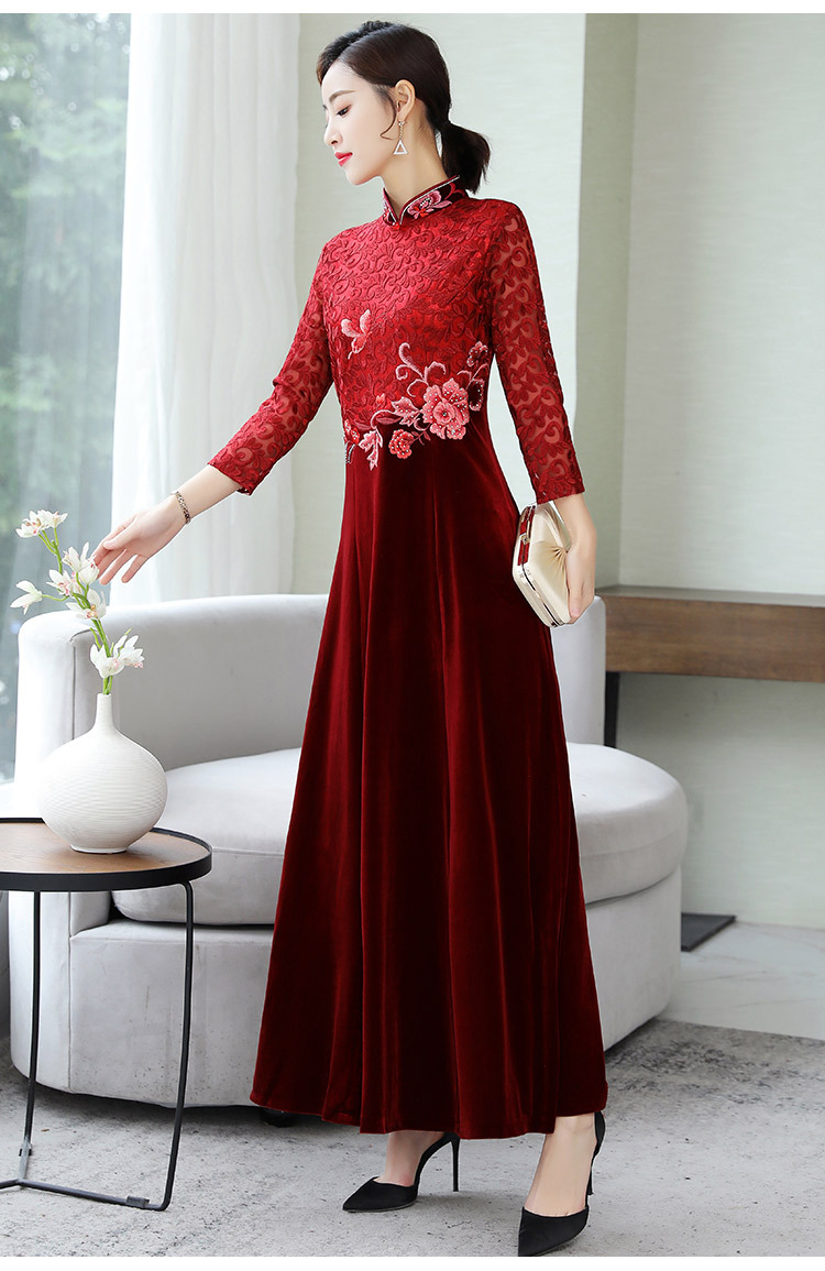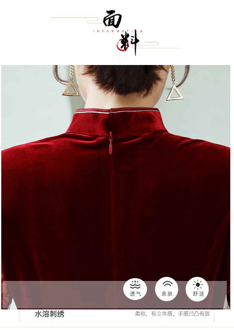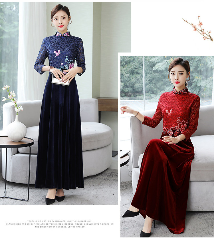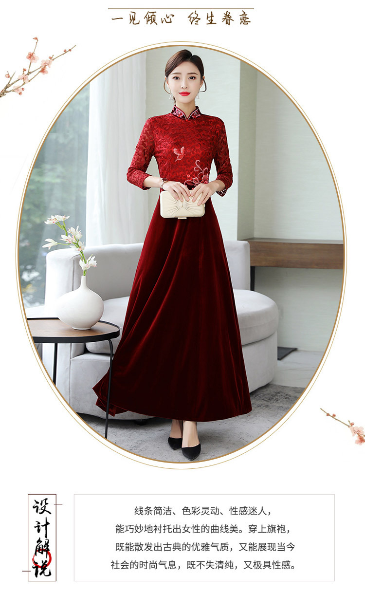 HT9256新款时尚优雅气质修身立领加绒加厚丝绒印花连衣裙