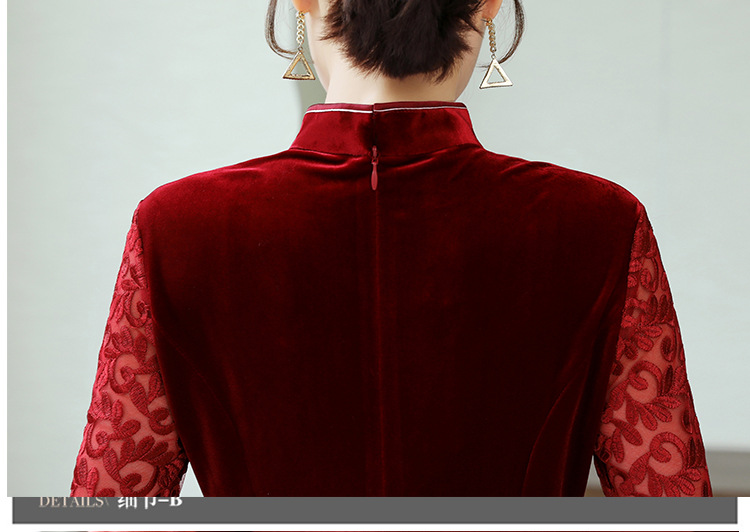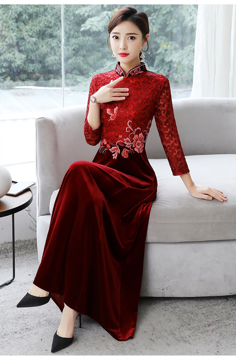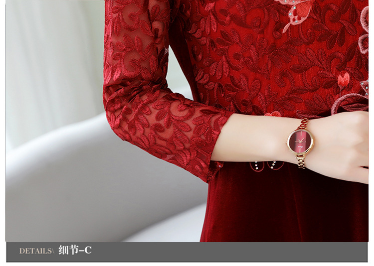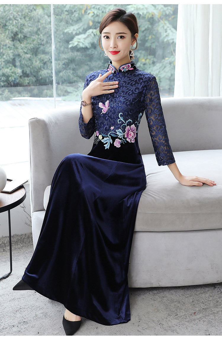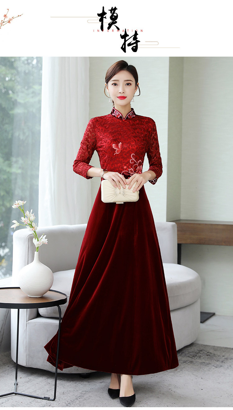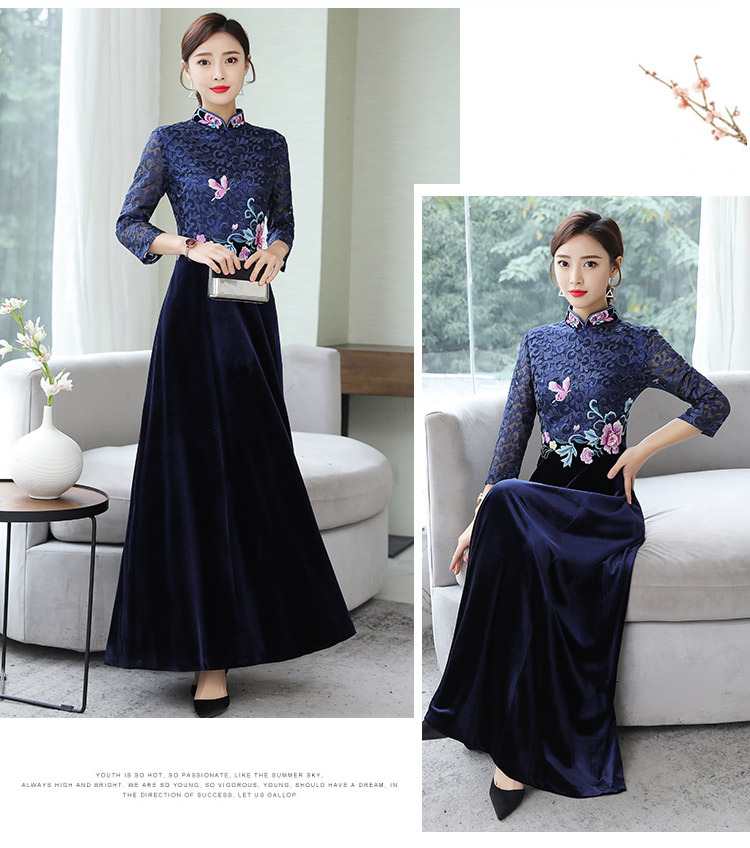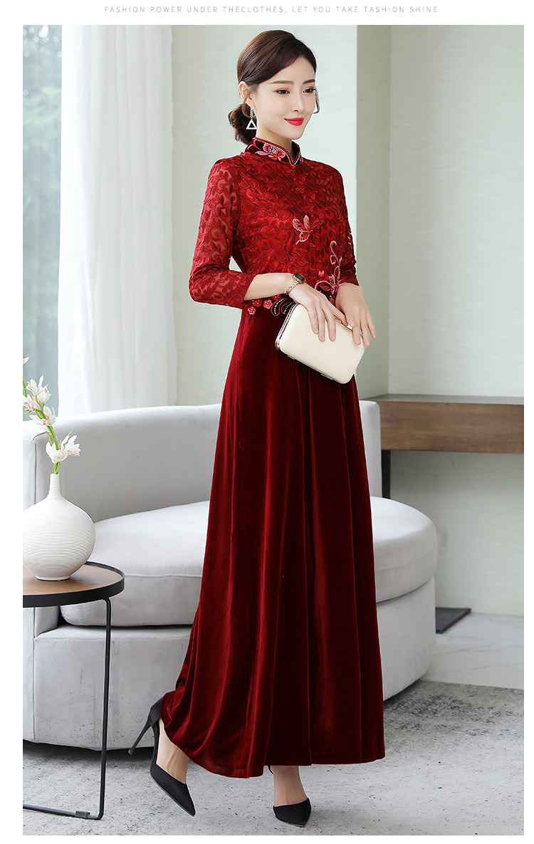 HT9256新款时尚优雅气质修身立领加绒加厚丝绒印花连衣裙