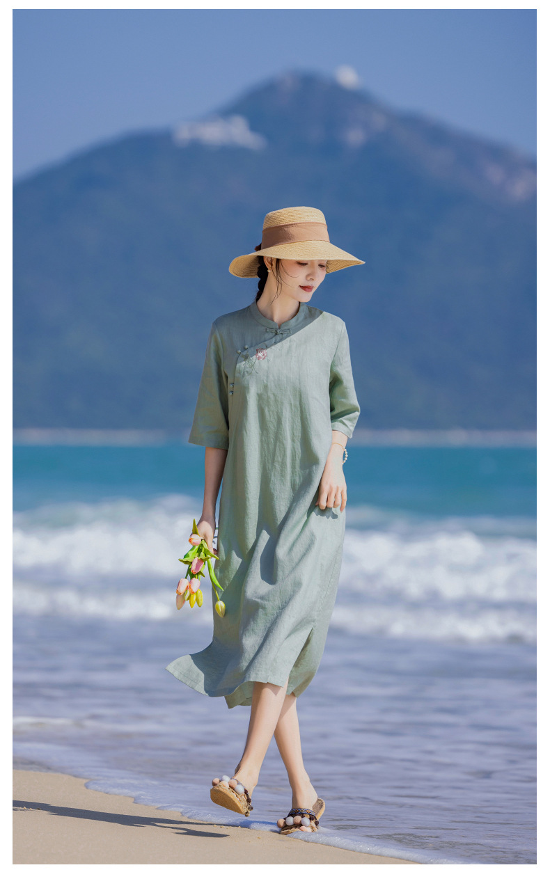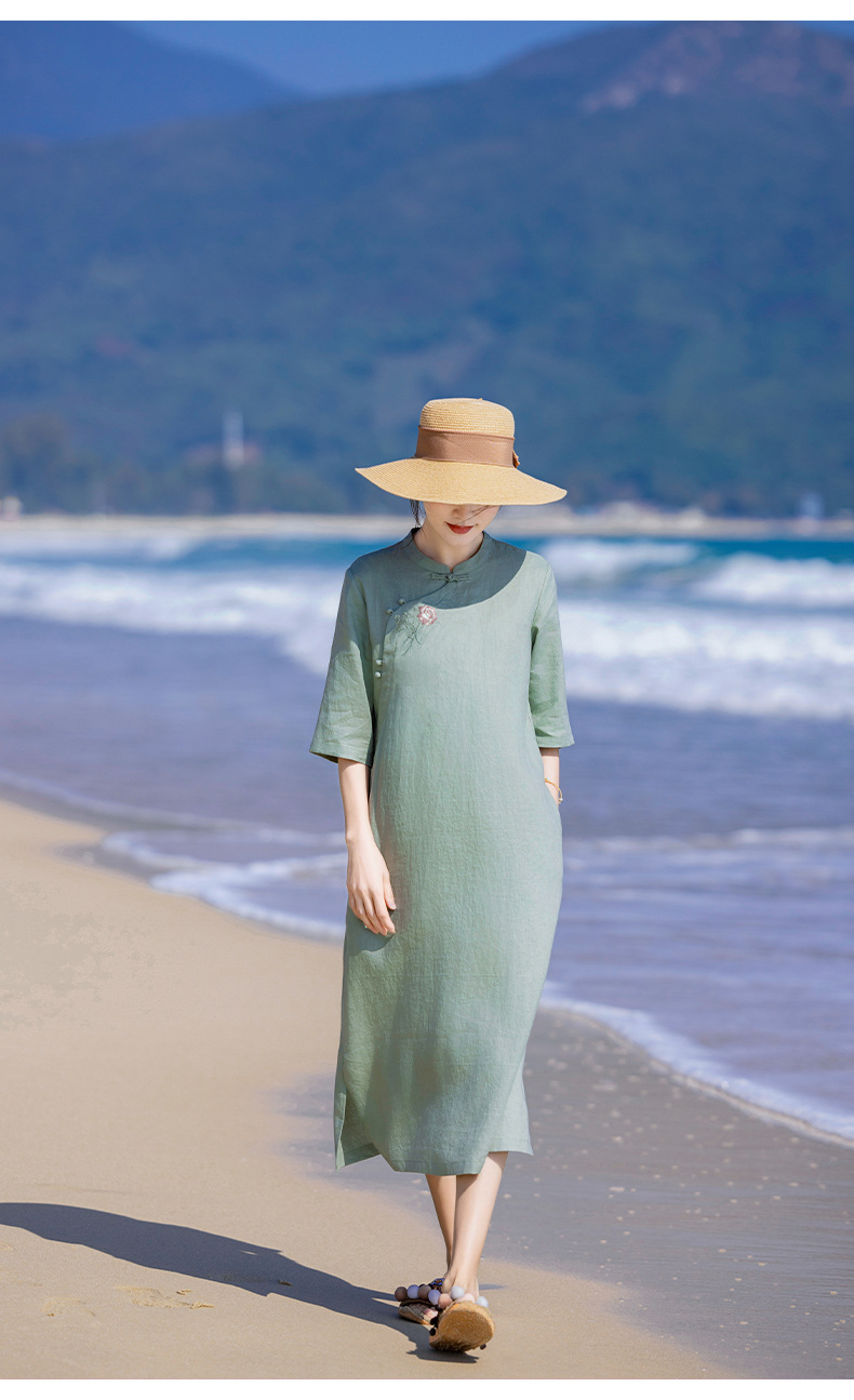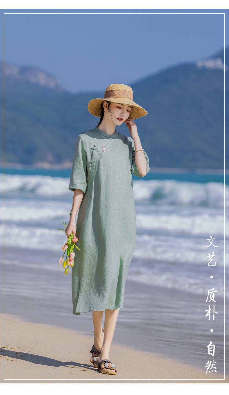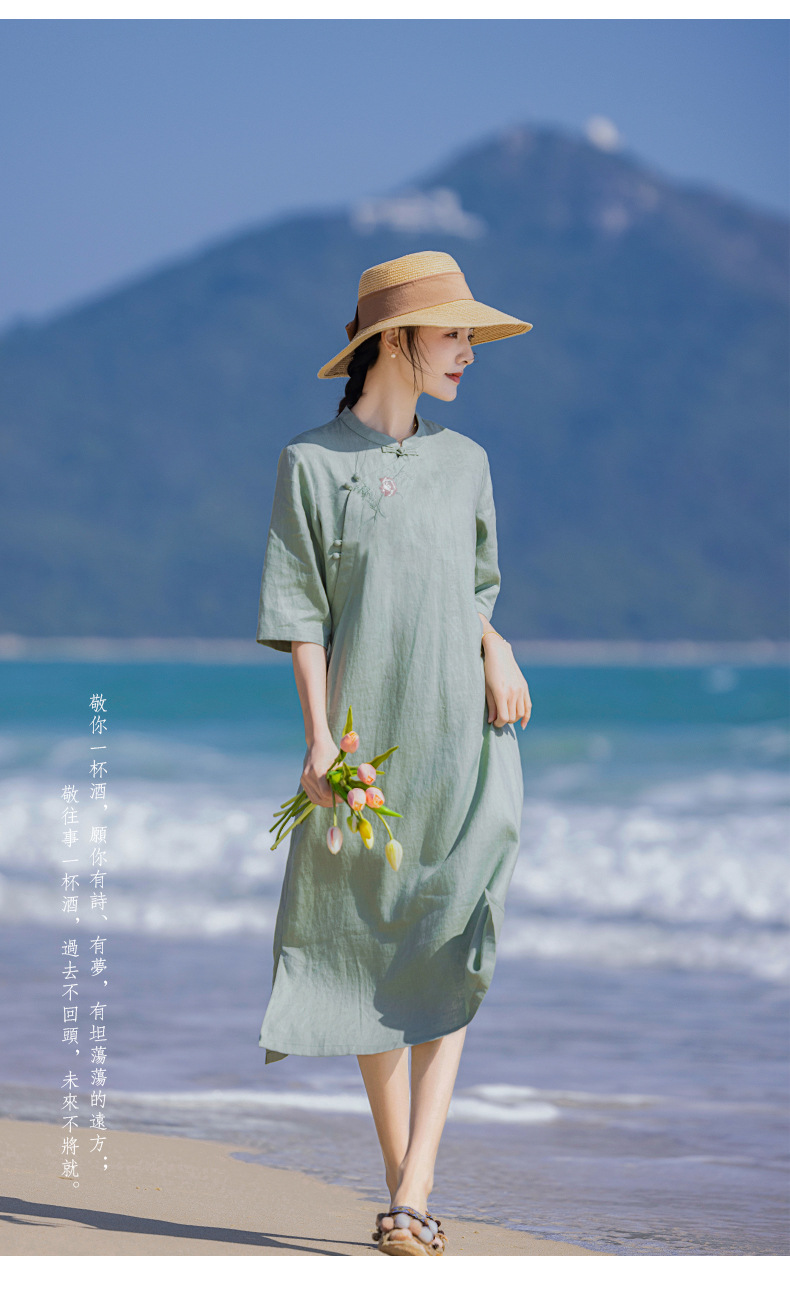 HM-S436国风复古亚麻绣花改良旗袍中式文艺斜襟立领五分袖连衣裙女侧开叉
