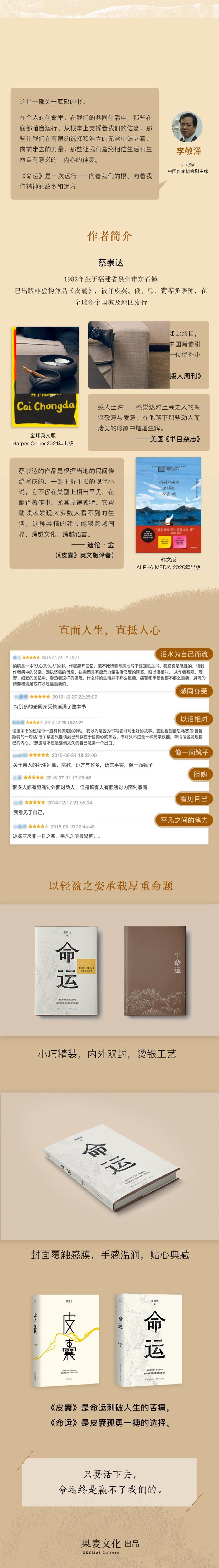 命运 蔡崇达著 皮囊之后睽违8年 皮囊是命运刺破人生的苦痛 命运是皮囊孤勇一搏的选择 在绝望的尽头找到希望 小说