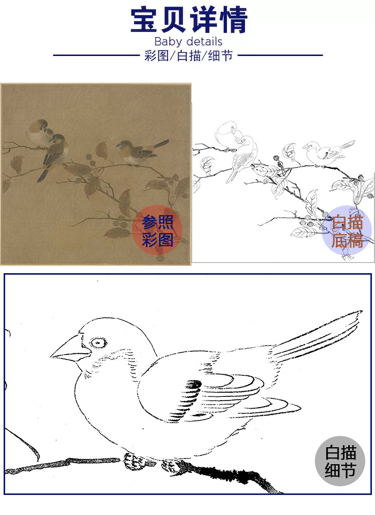 宋画花鸟白描底稿-佚名《霜柏山鸟图》-斗方小品册页-GH43