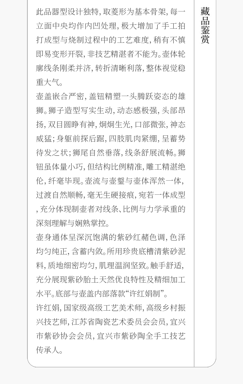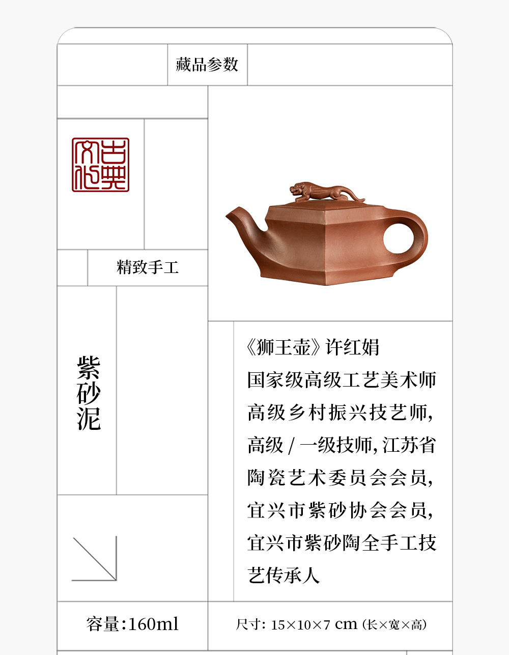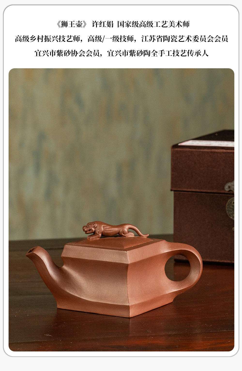 《狮王壶》 许红娟 高级工艺美术师,高级乡村振兴技艺师,高级/一级技师,江苏省陶瓷艺术委员会会员,宜兴市紫砂协会会员,宜兴市紫砂陶全手工技艺传承人