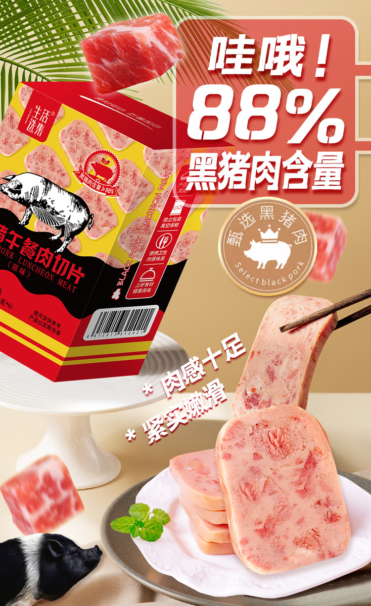 黑猪肉大于等于88%,大片厚实,肉味浓,撕开即食,也可拿来做早餐