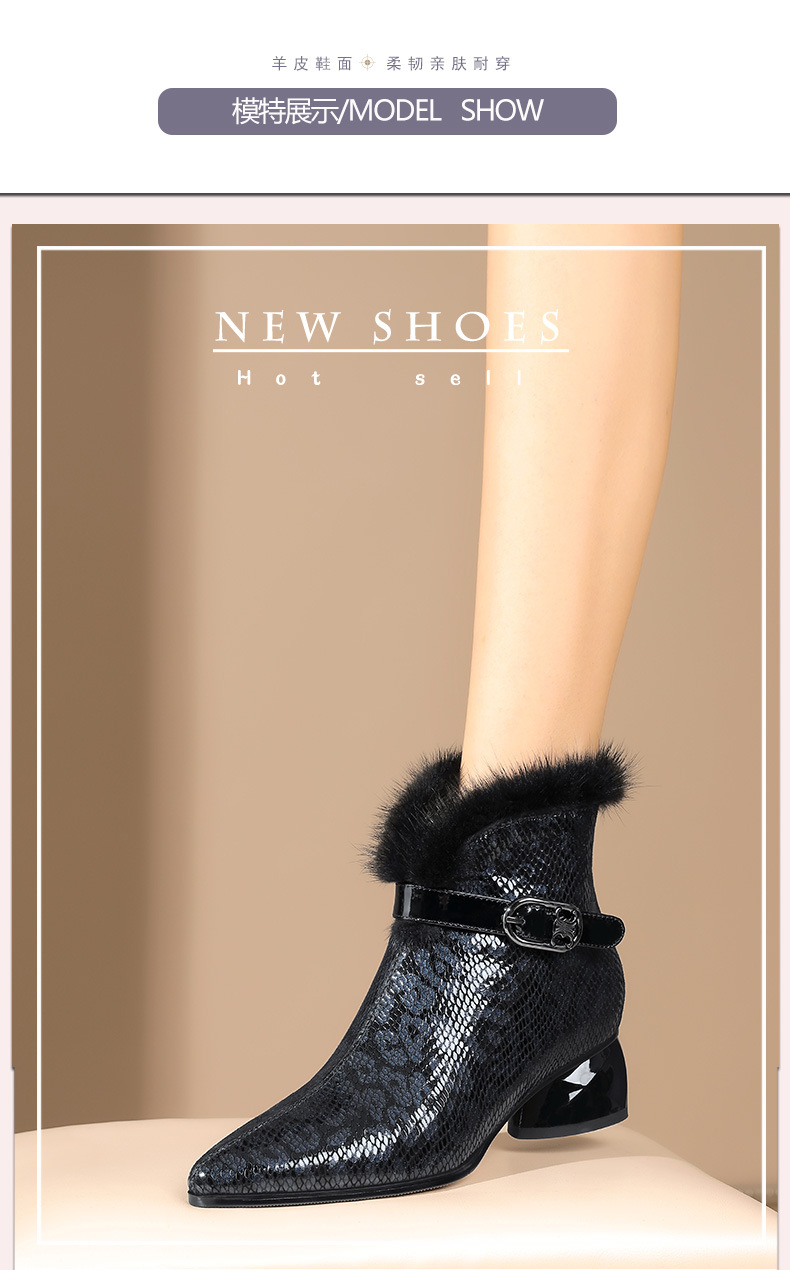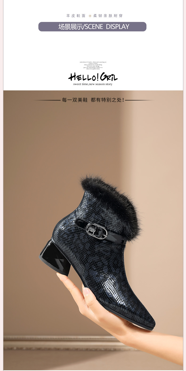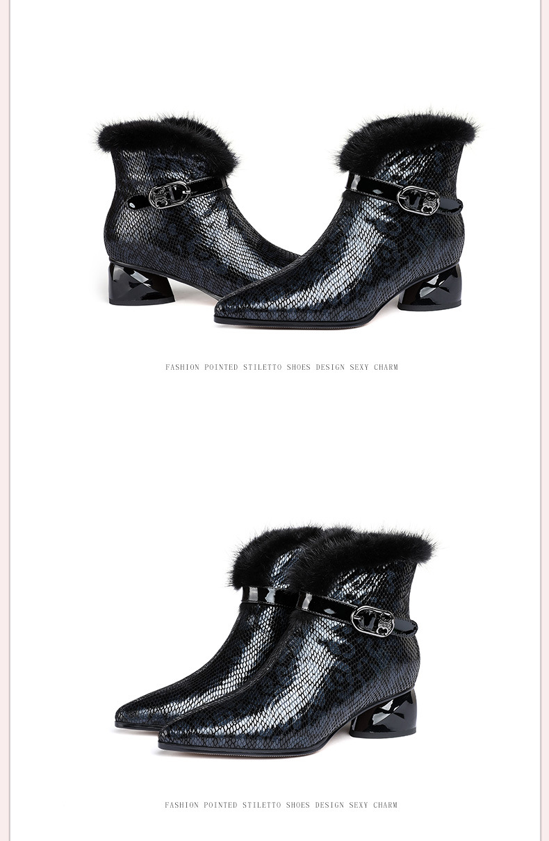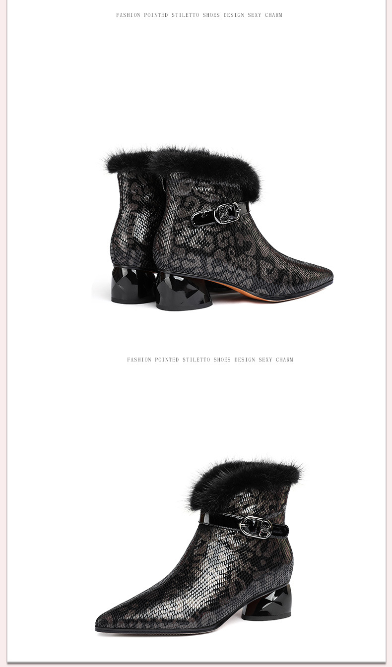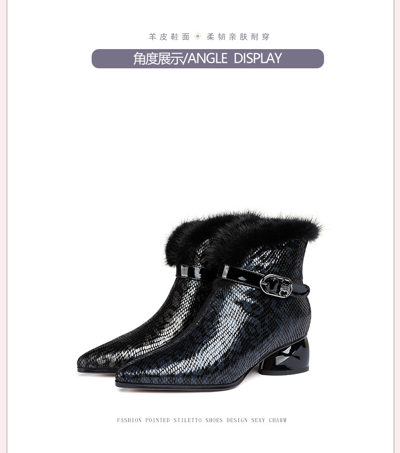 尖头粗跟貂毛短靴,高跟鞋加绒漆皮女靴LMJ-L2196