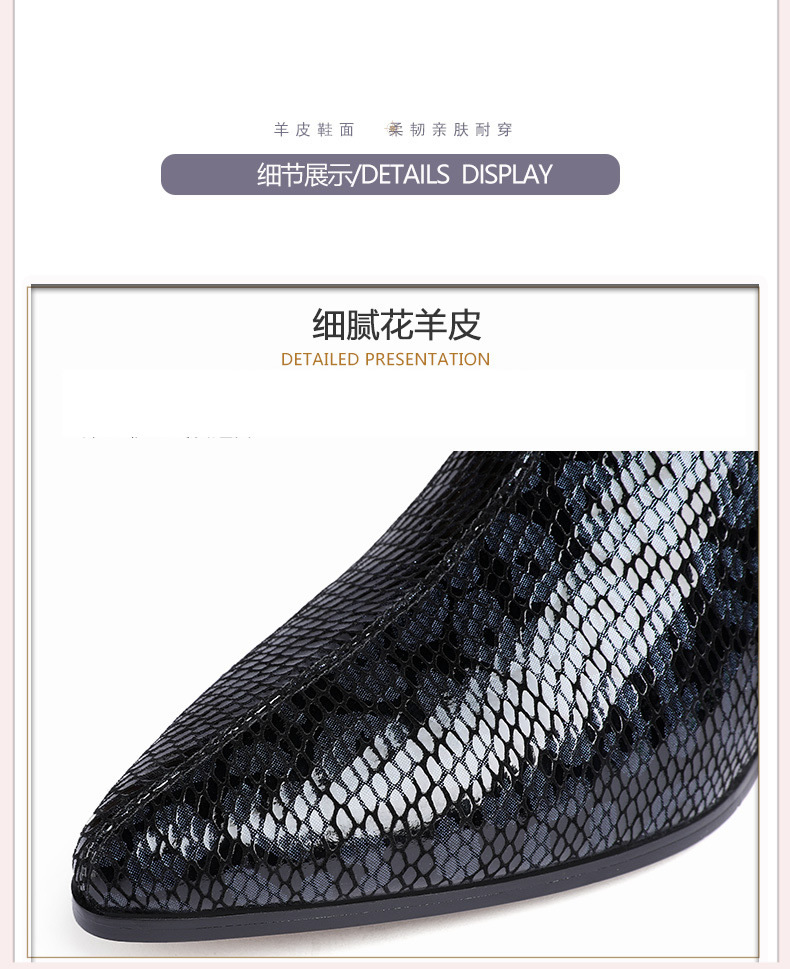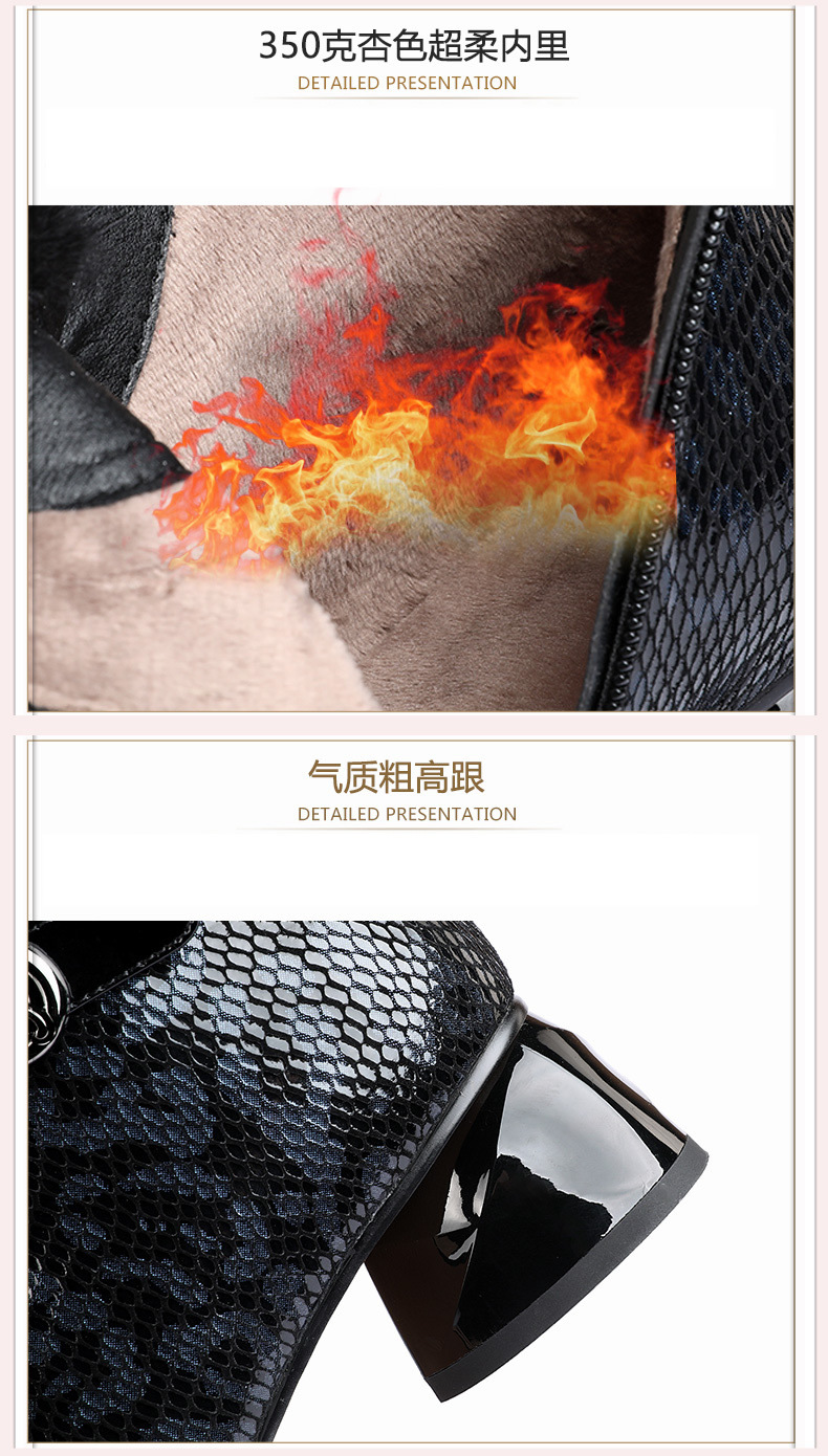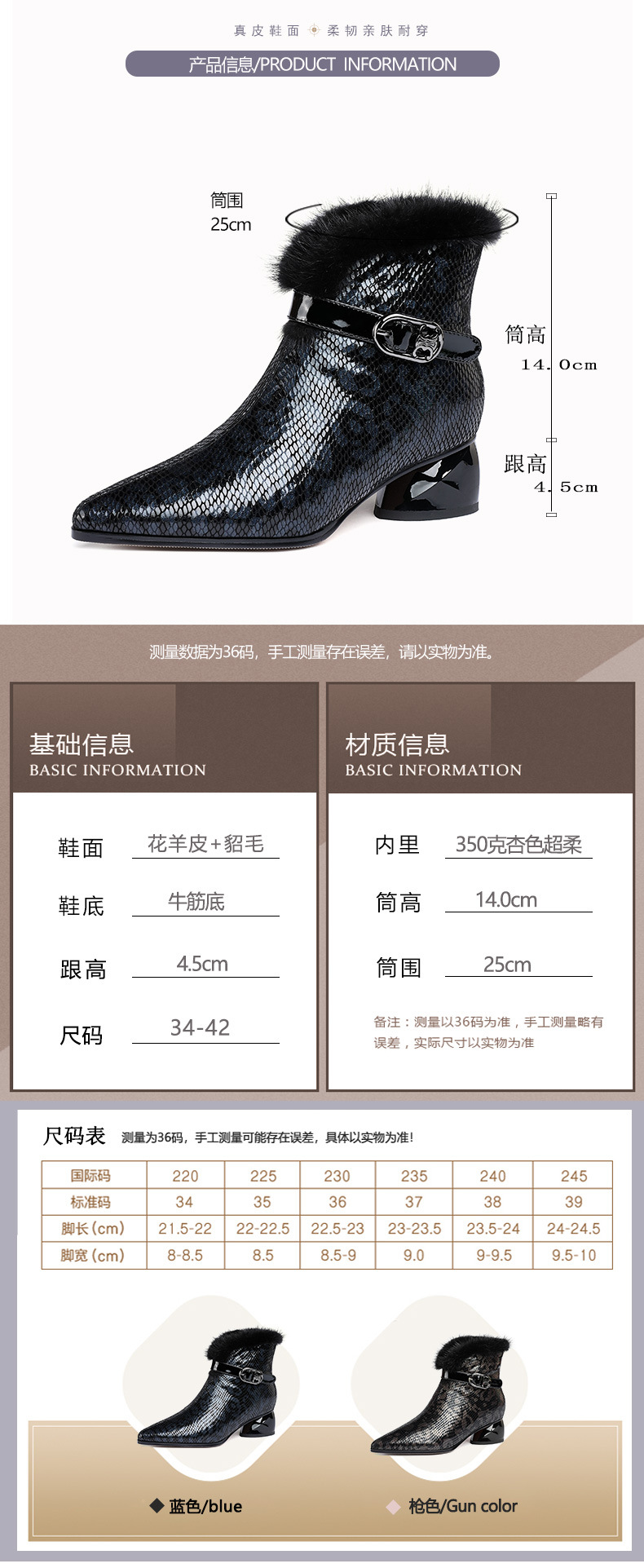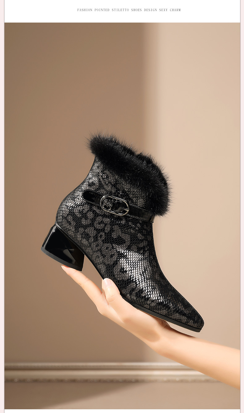 尖头粗跟貂毛短靴,高跟鞋加绒漆皮女靴LMJ-L2196