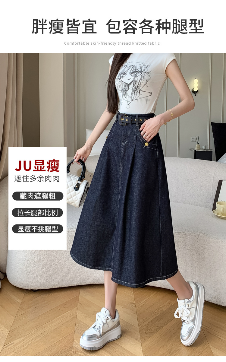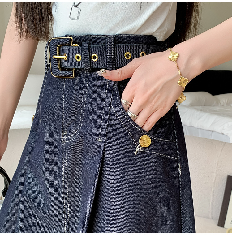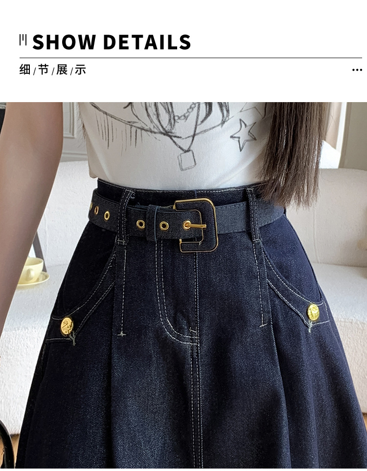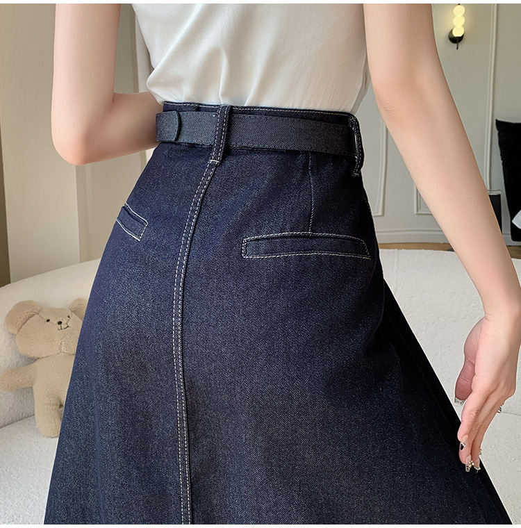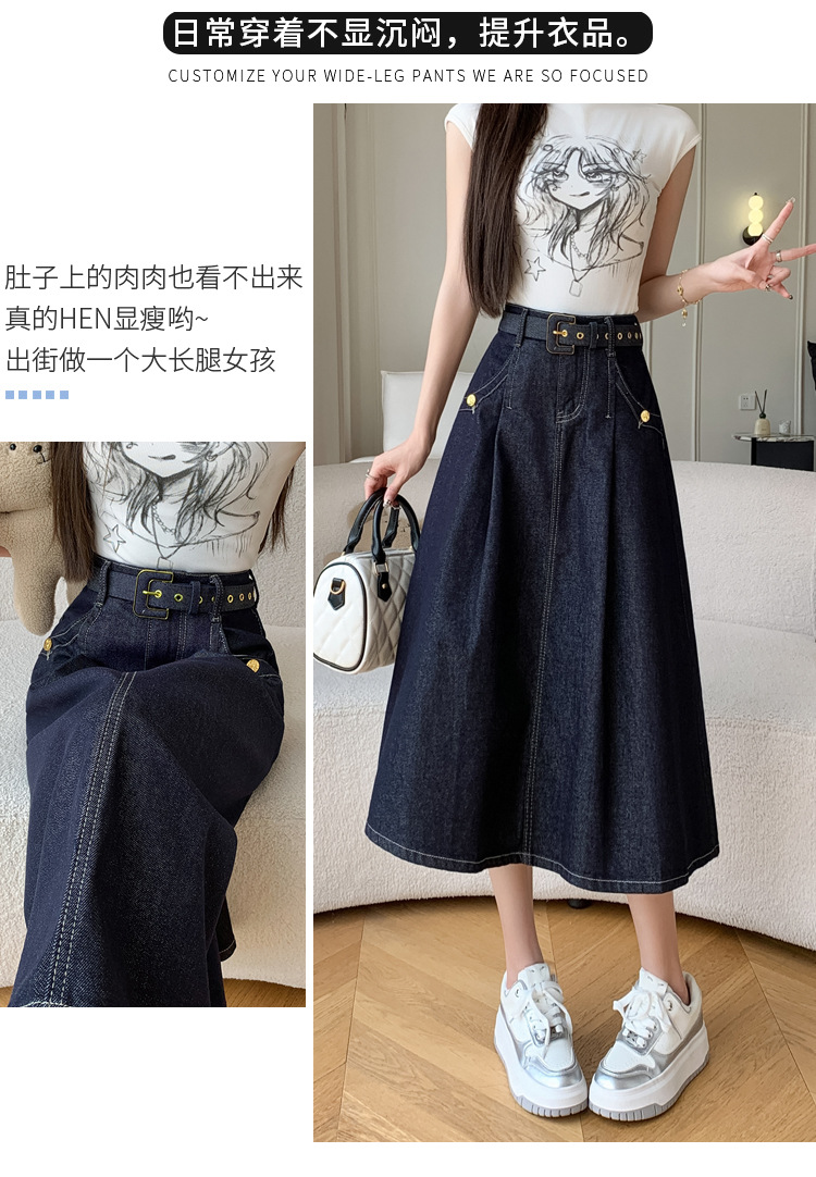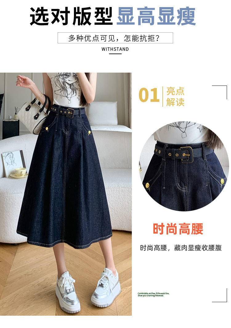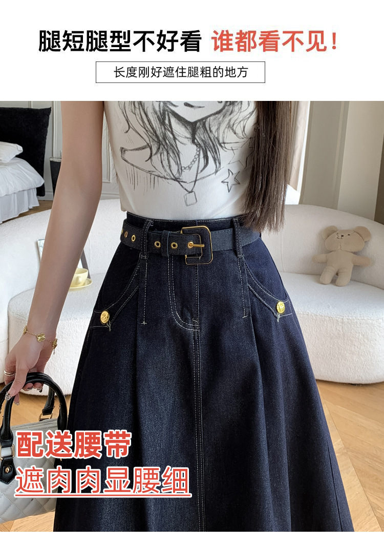 雀说实拍腰带收腰A字裙复古高腰设计感女显瘦牛仔半身裙AL