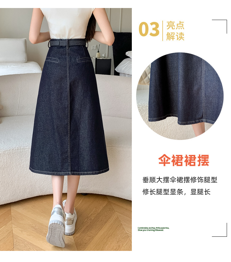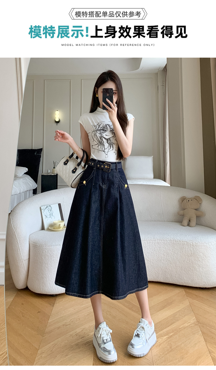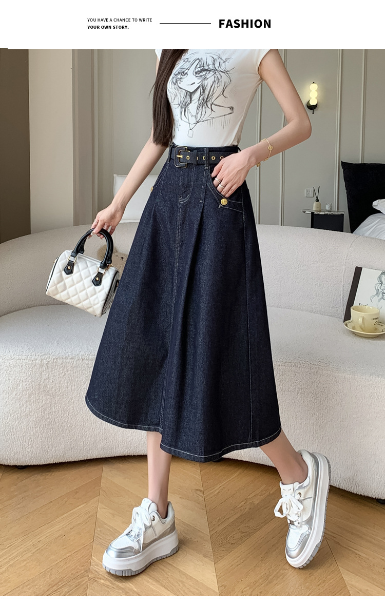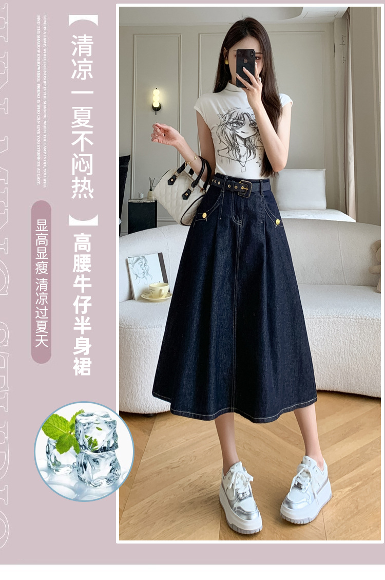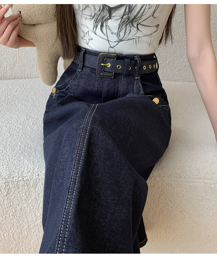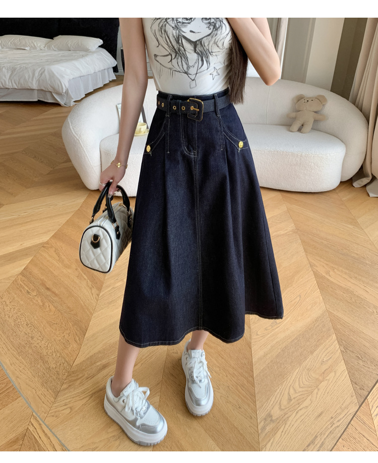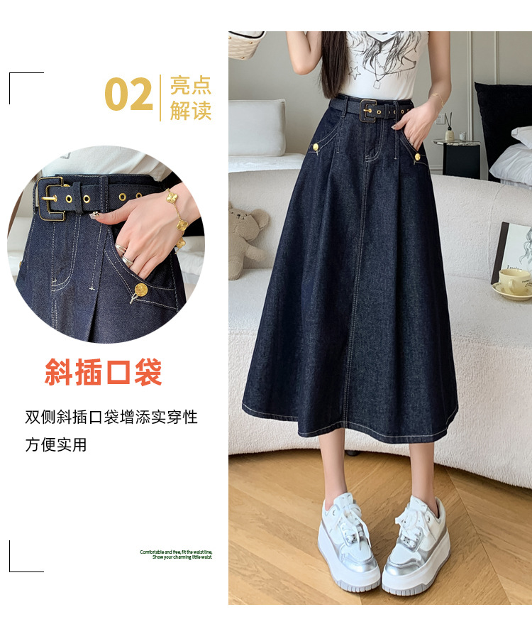 雀说实拍腰带收腰A字裙复古高腰设计感女显瘦牛仔半身裙AL