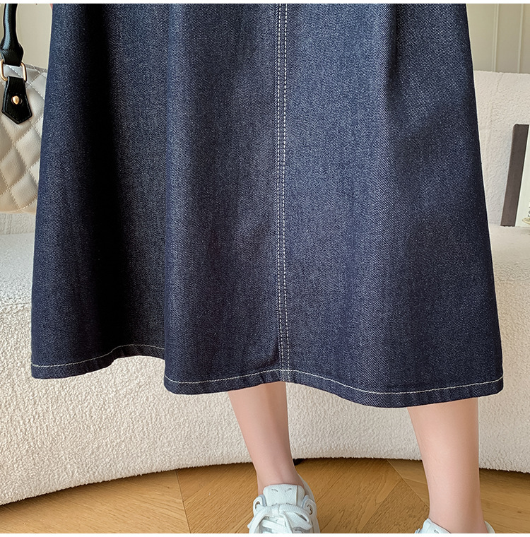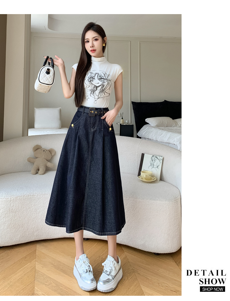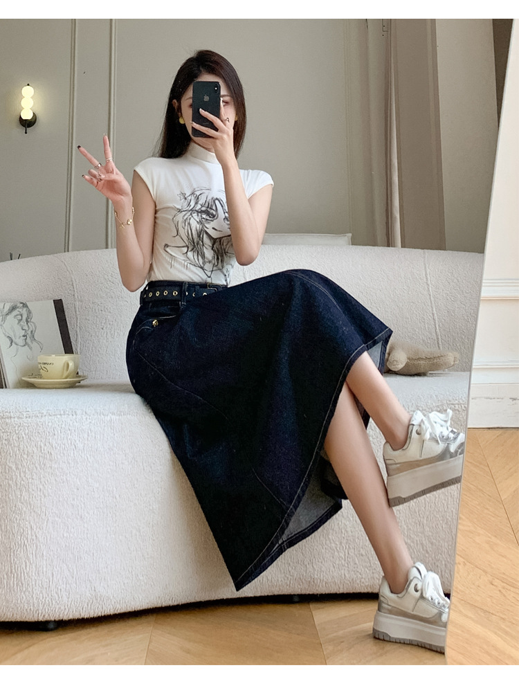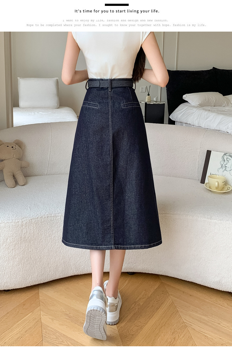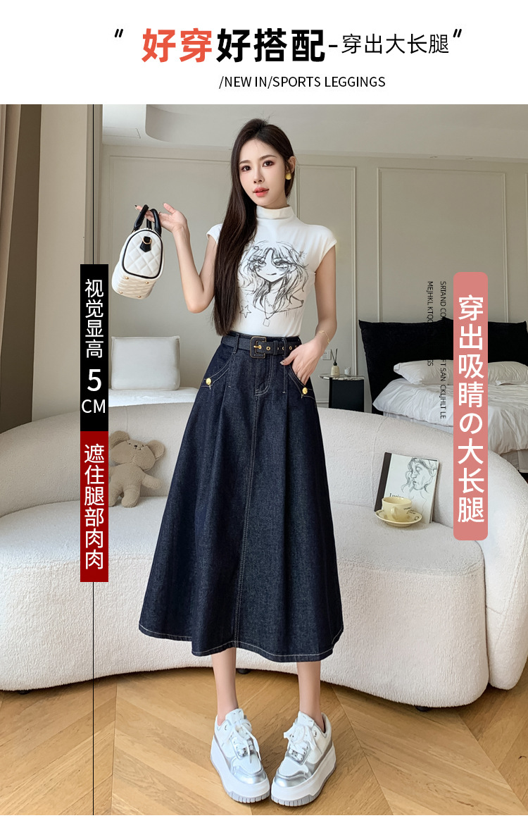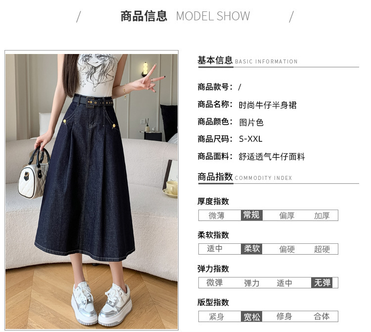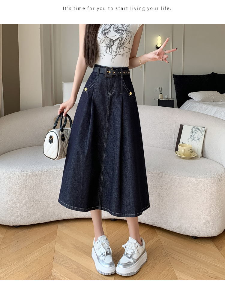 雀说实拍腰带收腰A字裙复古高腰设计感女显瘦牛仔半身裙AL