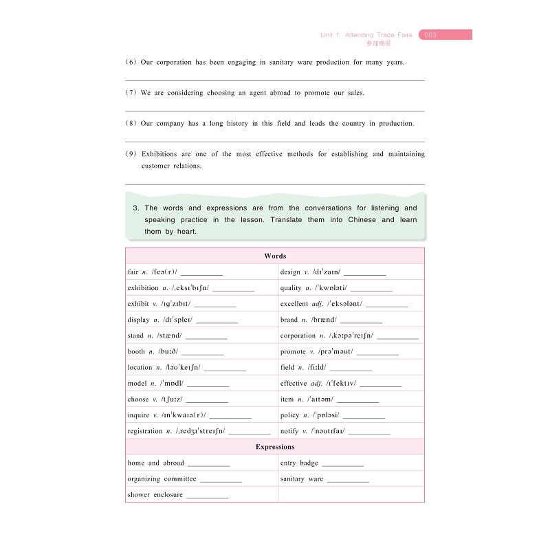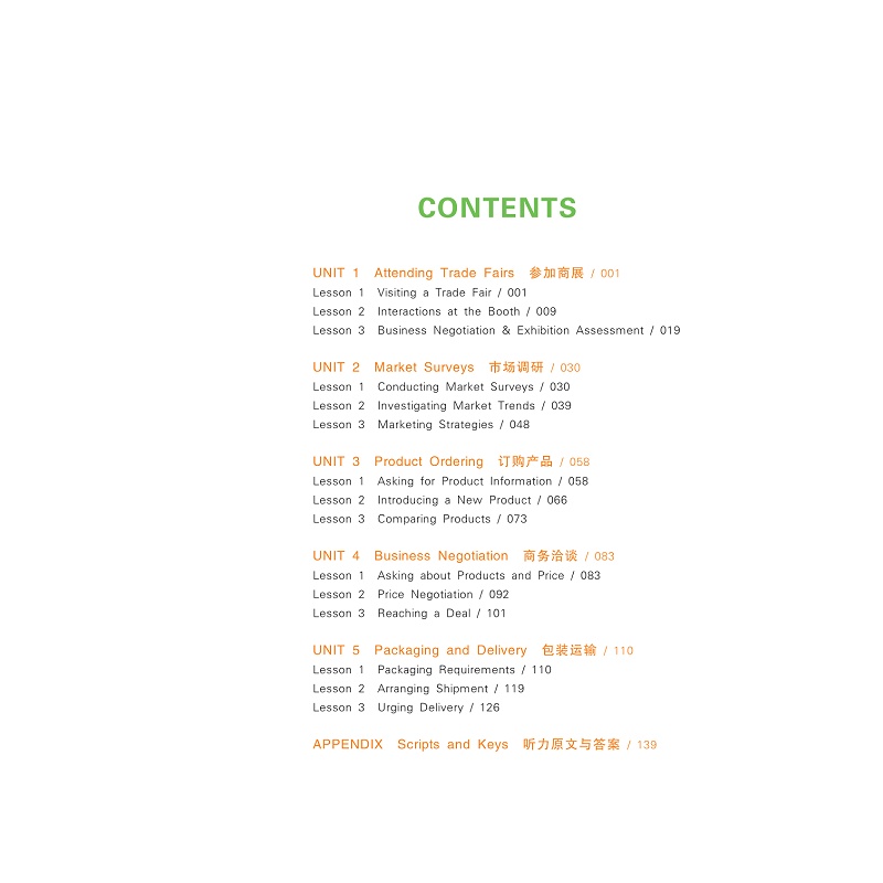 本教材的编写原则按照高职高专的英语教学要求而制订,各个单元是基于常用商务活动的场景,以“经典句型与经典对话”为主体,在每单元中把口语与听力训练相融合,促进语言的输入与输出的结合。每单元包含三个主要的场景。每个场景的内容相对独立,分别由Preparation, Listening和Speaking out三部分构成,便于教师围绕场景交际的常用句型开展听说训练,有利于开展丰富多样的训练活动,提高学生学习兴趣。本册内容包含产品调研、产品介绍、商务洽谈、包装运输、投诉索赔、付款方式,共6个单元。