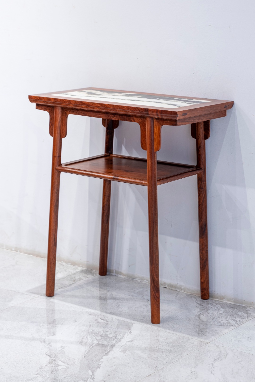 石面 70 刀牙带屉板双层 小酒桌 :此案以缅甸花梨木制,纹理红润,清晰自然。案面格角榫攒边打槽装大理石,如同水墨山水。边抹由上到下缩进,至底压一道细致的窄平线,抹头可见明榫。夹头榫结构,光素刀牙板。圆材腿足,微有测脚。四腿之间加横枨,枨子里口打槽装屉板,形成平头案的隔层,增加了使用空间和面积。