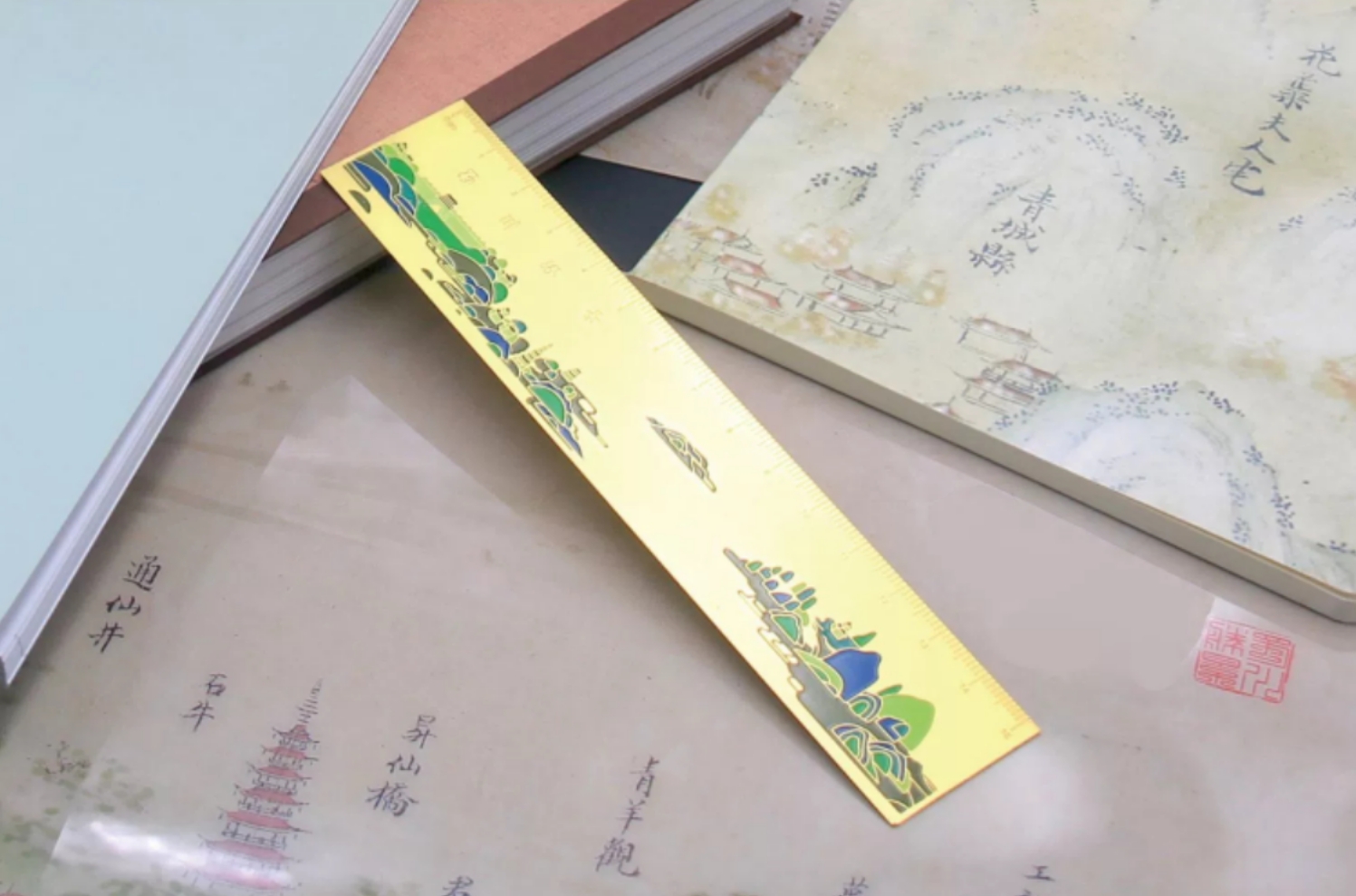 蜀川盛景-铜尺 以《蜀川胜概图》为蓝本,勾勒画卷中山体轮廓线条,刻画在黄铜尺上。山体呈现富有层次感的青绿色,一如当年的蜀川胜景。
