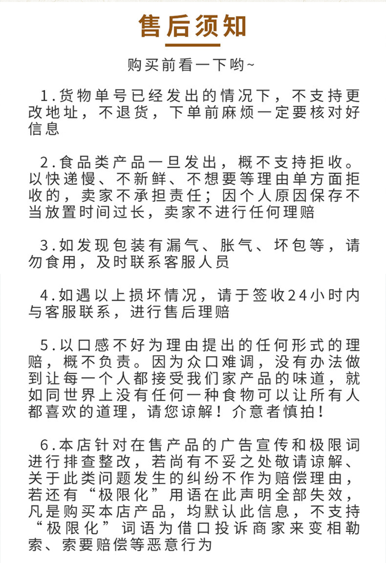 3.下单前请确定好发货信息,下单后拦截需收取6元/件费用,拒收需收取12元/件费用