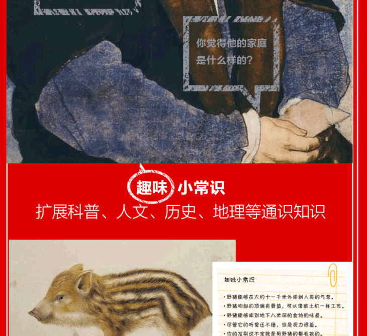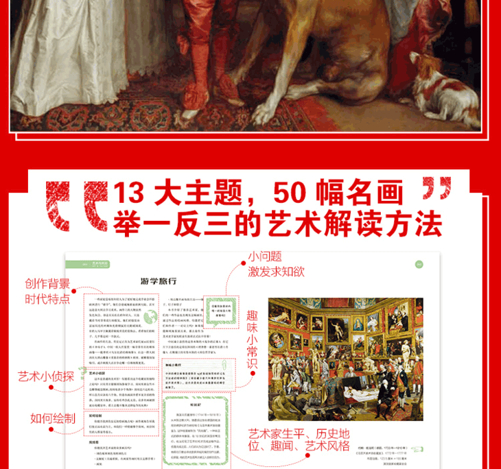 文中设置了多样的互动板块,“艺术小侦探”鼓励孩子根据线索在画中寻找答案;“趣味小常识”帮助孩子记忆大师作品,扩展科普、人文、历史、地理等小知识。除此之外,还能了解作品创作背景、时代特点、绘制手法、艺术家生平趣闻等知识,语言妙趣横生,让父母和孩子走进艺术博物馆时充满信心。