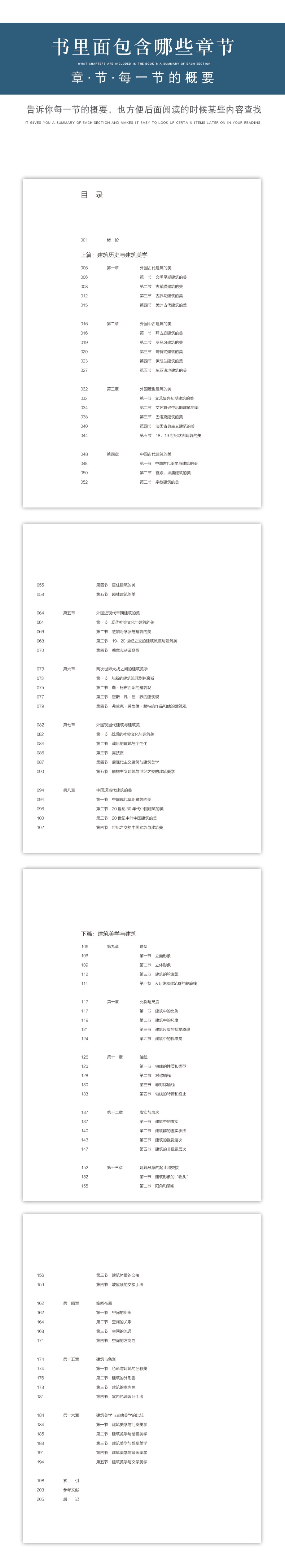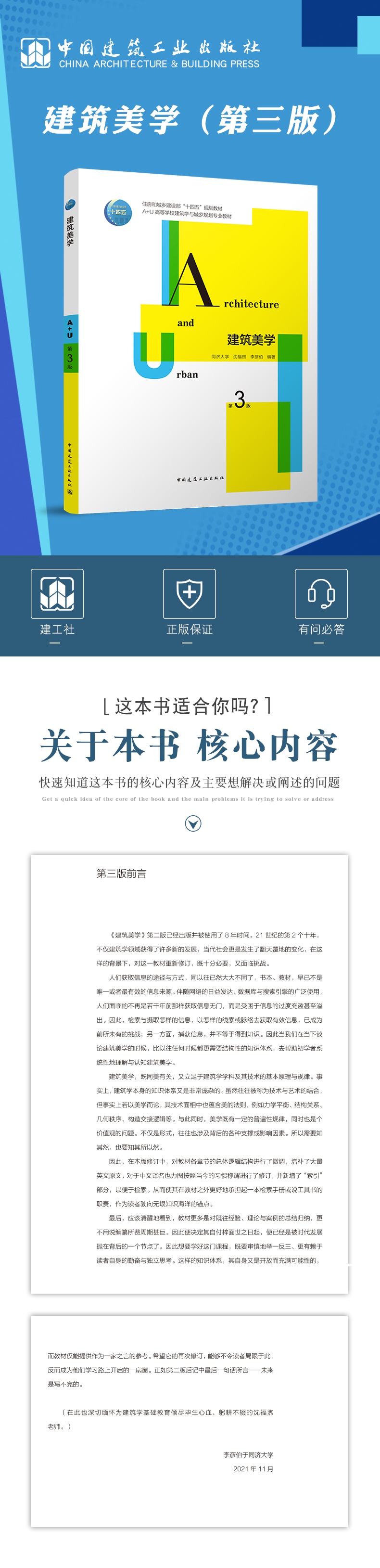 本书是建筑学和其他相关专业(如城市规划、室内设计、风景园林等)的建筑美学课的教材。当今,许多高等学校相继开设建筑美学课(选修课),甚至被认为有必要成为一门必修课,安排在建筑历史与理论课程体系中。 本书第一版式在这些年的教学中,得到许多好评,特别是在当今的社会现实中,对建筑的审美提出了更高的要求。对于建筑,只是实用、坚固、经济的要求越来越显得不够了。特别是近年来,大量的居住建筑,在建筑形式美方面的要求更为突出,针对人们本身的审美能力以及对建筑美的所谓“眼力”的不断提高,我们尤其做了很多努力,最终让本书内容更为充实丰富,更能满足需求。