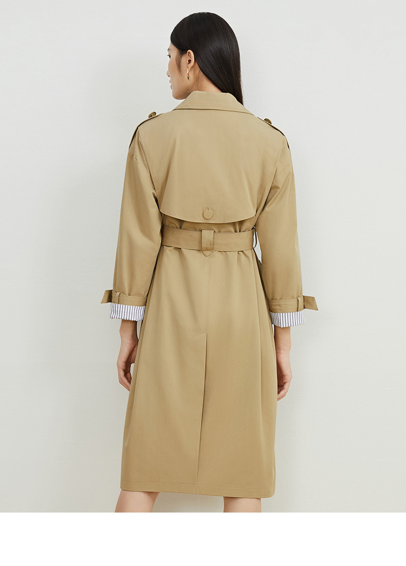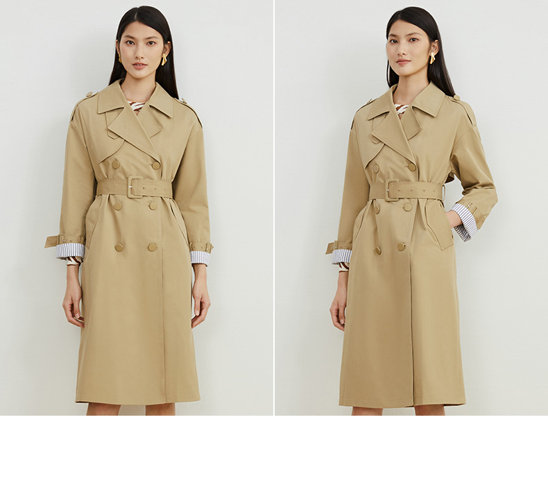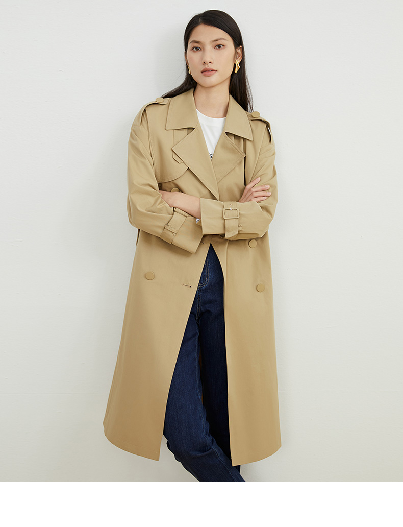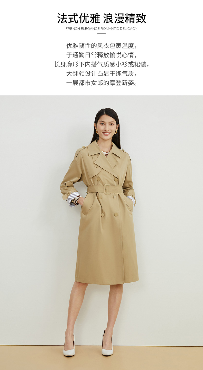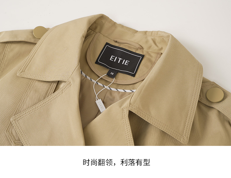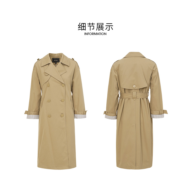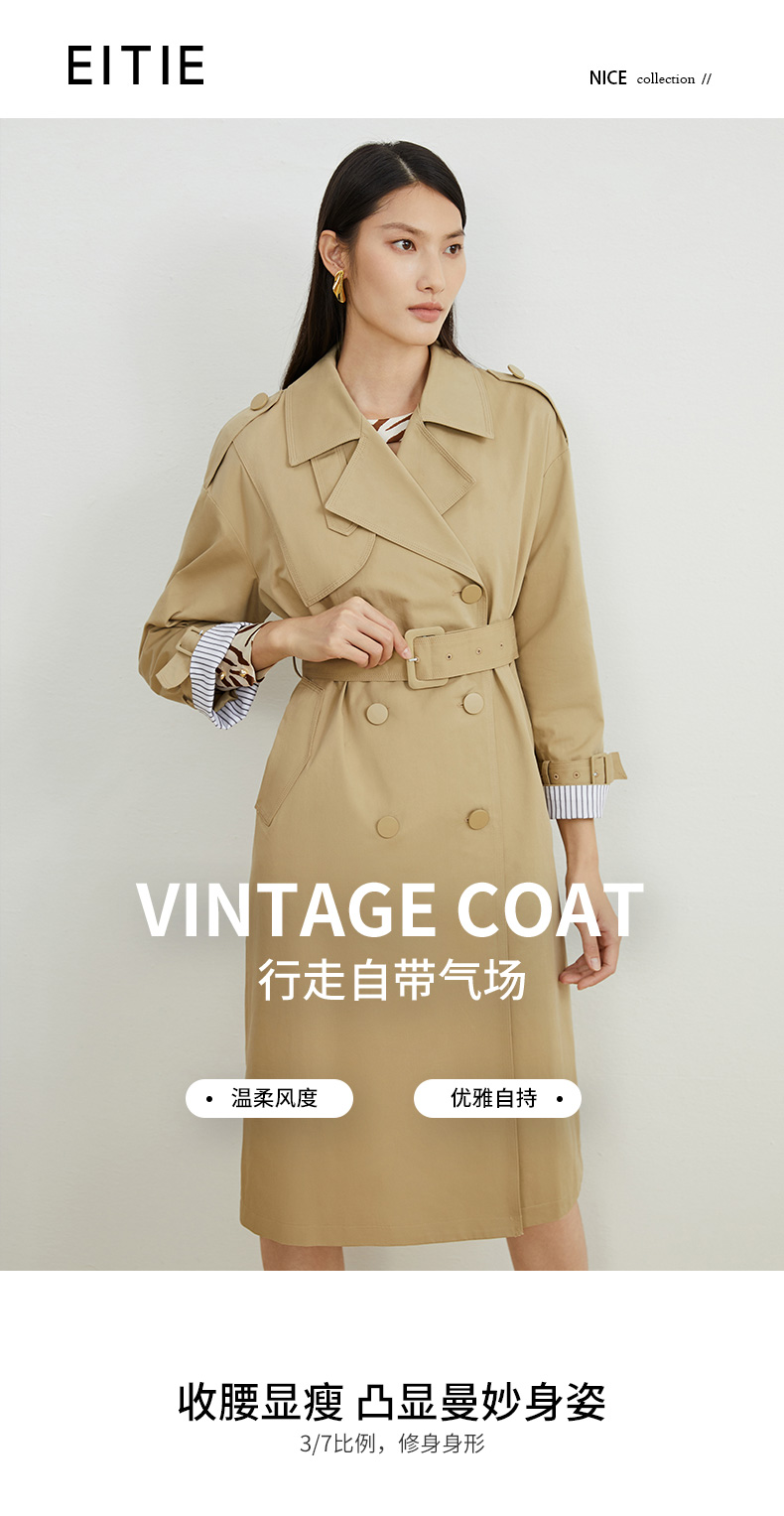 EITIE爱特爱秋新款经典双排扣纯色显瘦百搭纯棉长款风衣外套C2204008
