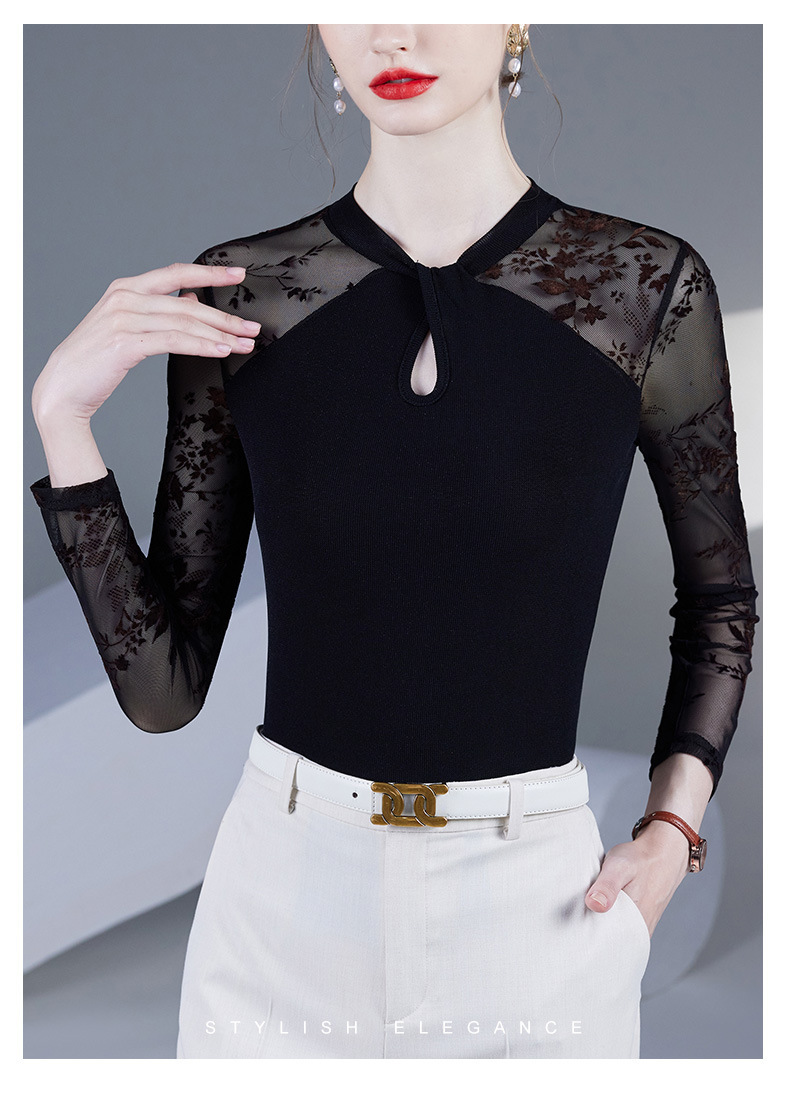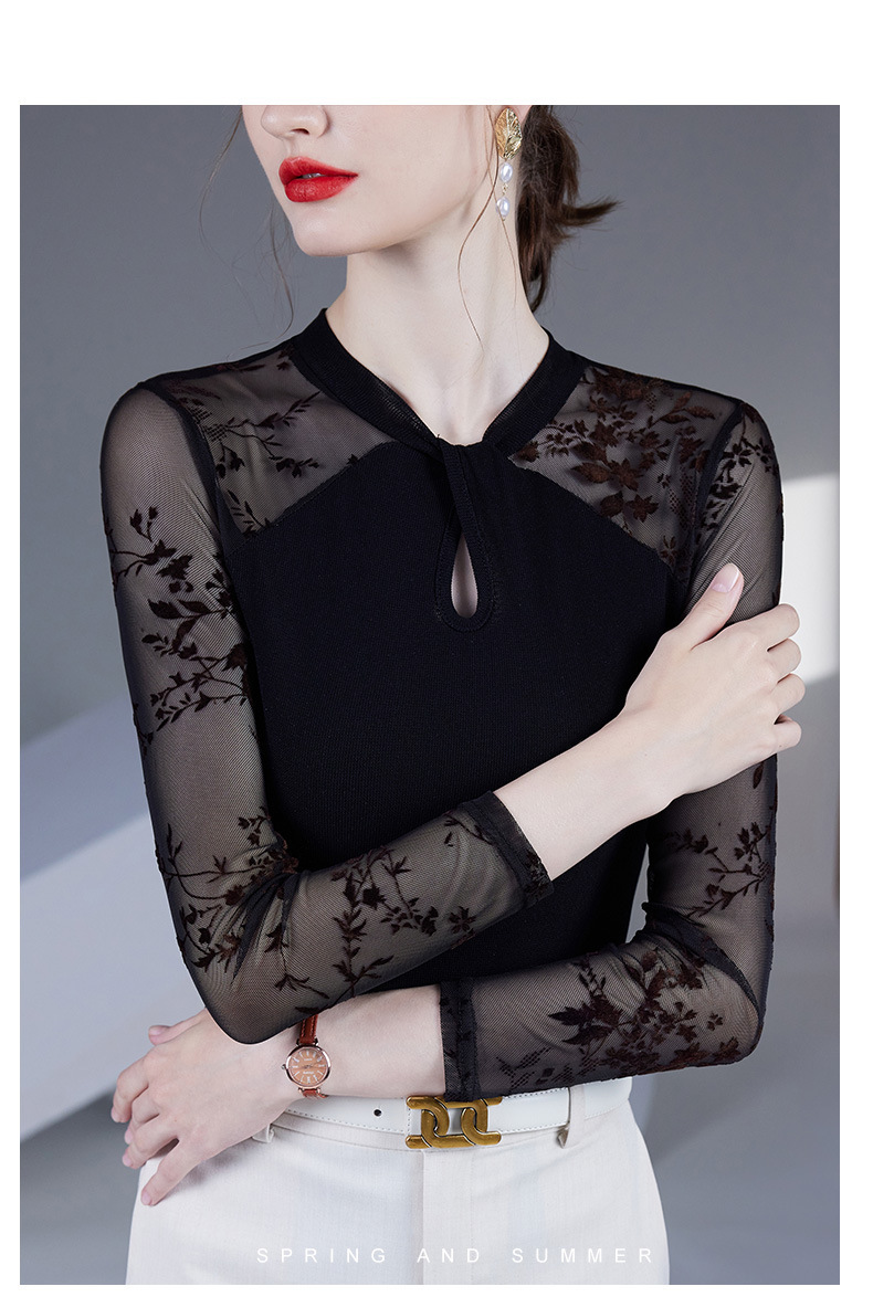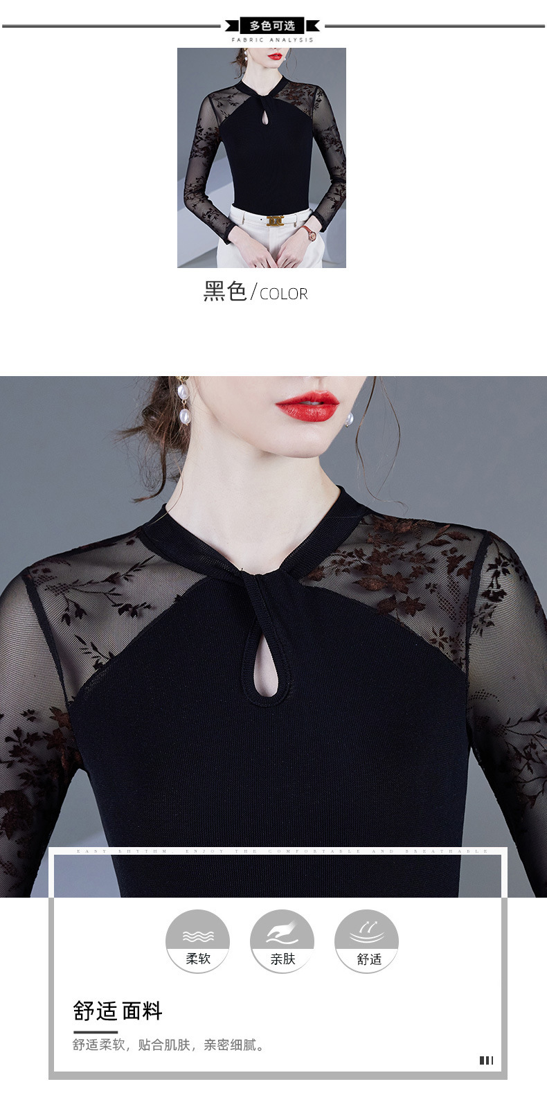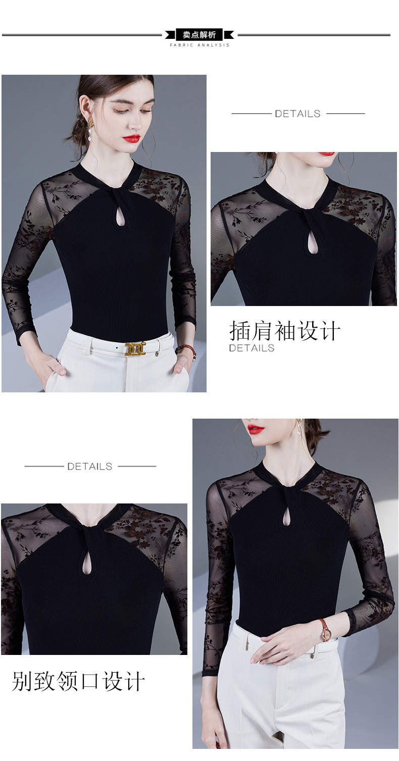 雀说别致镂空网纱拼接打底衫气质修身内搭t恤小衫黑色长袖女上衣AL46983