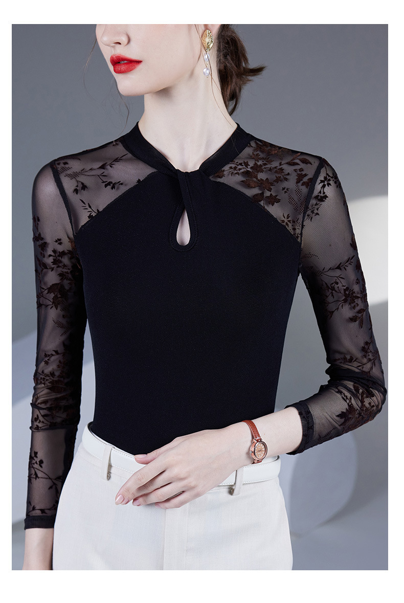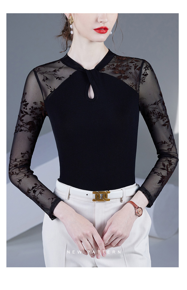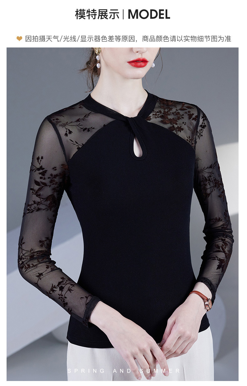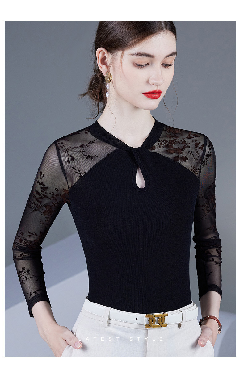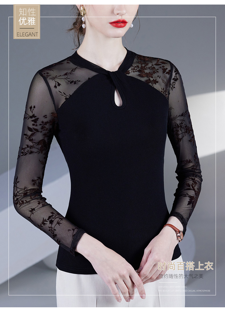 雀说别致镂空网纱拼接打底衫气质修身内搭t恤小衫黑色长袖女上衣AL46983