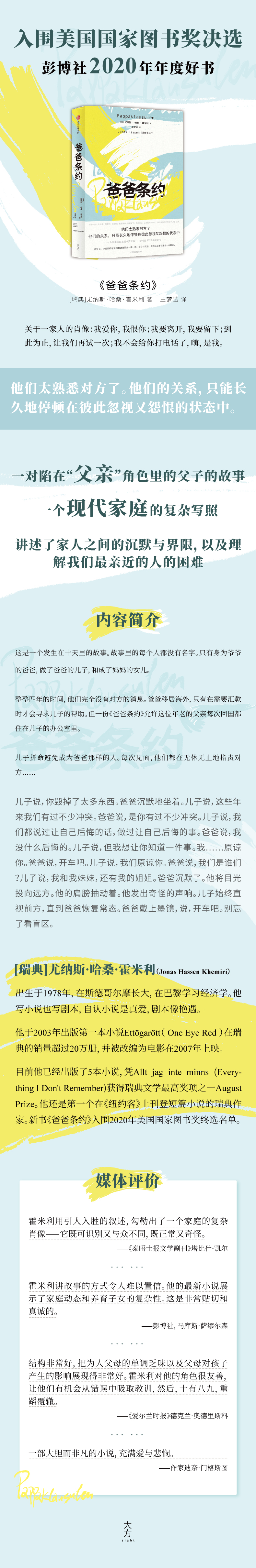 尤纳斯·哈桑·霍米利出生于1978年,在斯德哥尔摩长大,在巴黎学习经济学。他于2003年出版第一本小说Ettögarött( One Eye Red )在瑞典的销量超过20万册。他是第一个在《纽约客》上刊登短篇小说的瑞典作家。新书《爸爸条约》入围2020年美国国家图书奖终选名单。