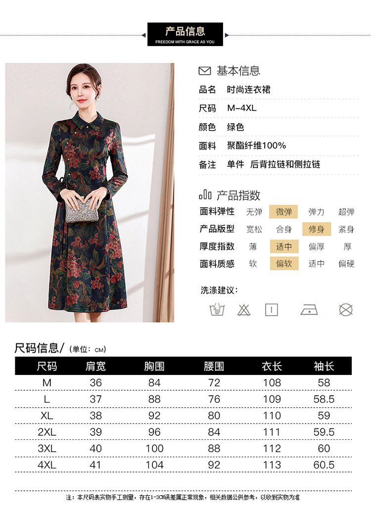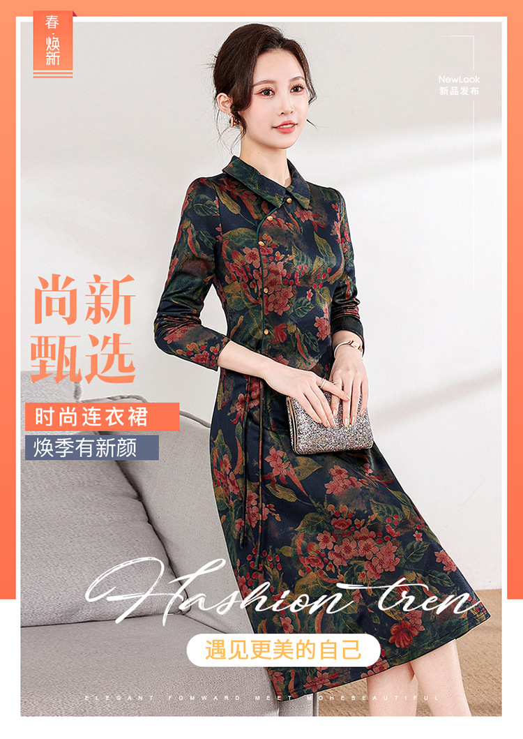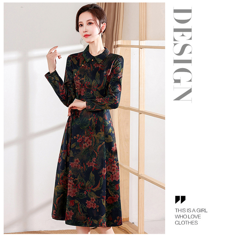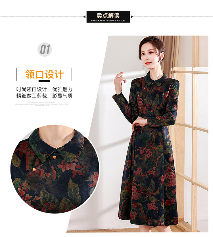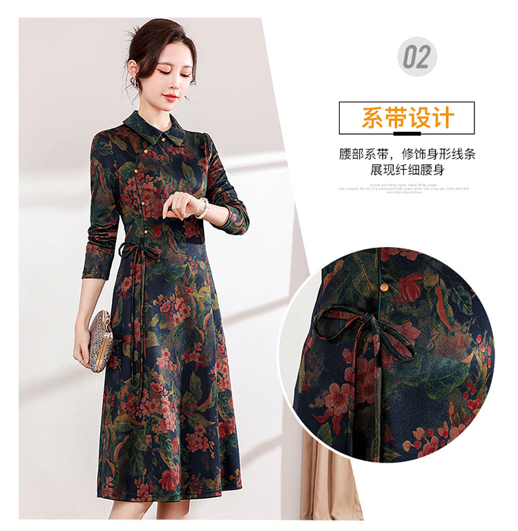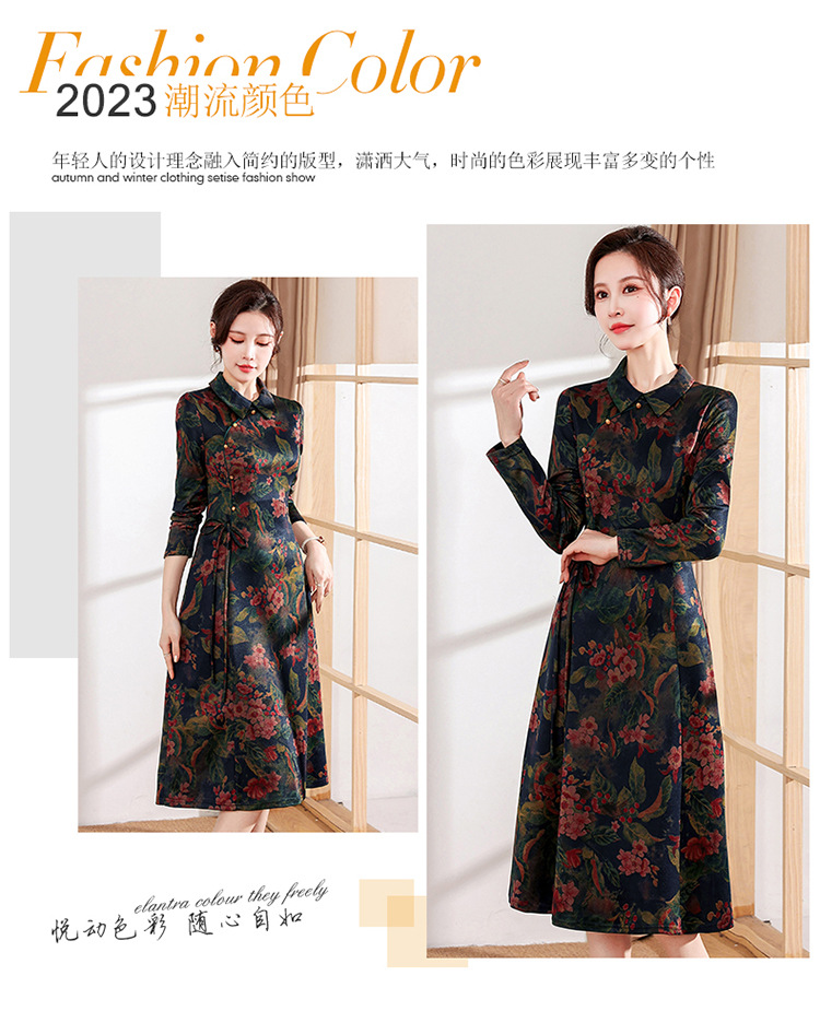 QYM MB2302印花复古优雅时尚连衣裙娃娃领优雅气质A字裙