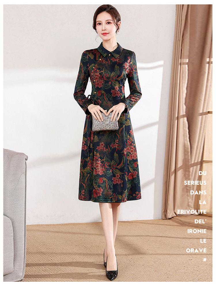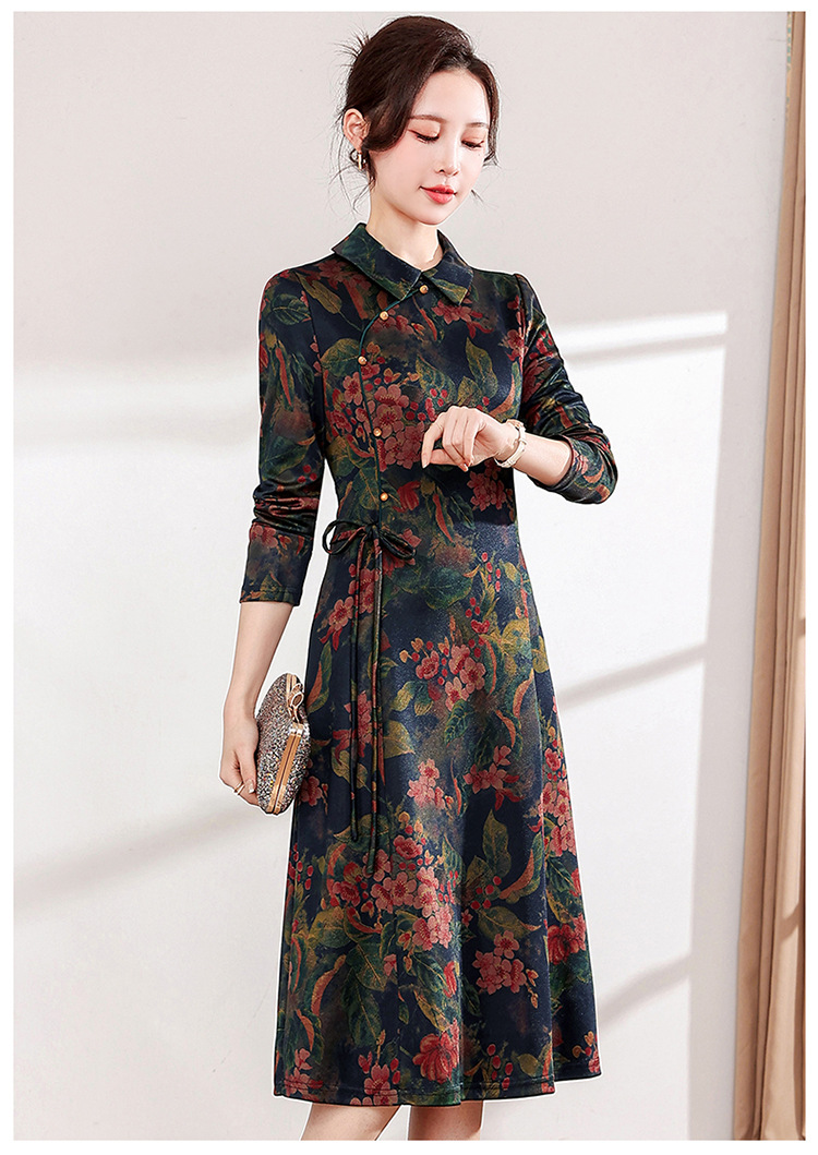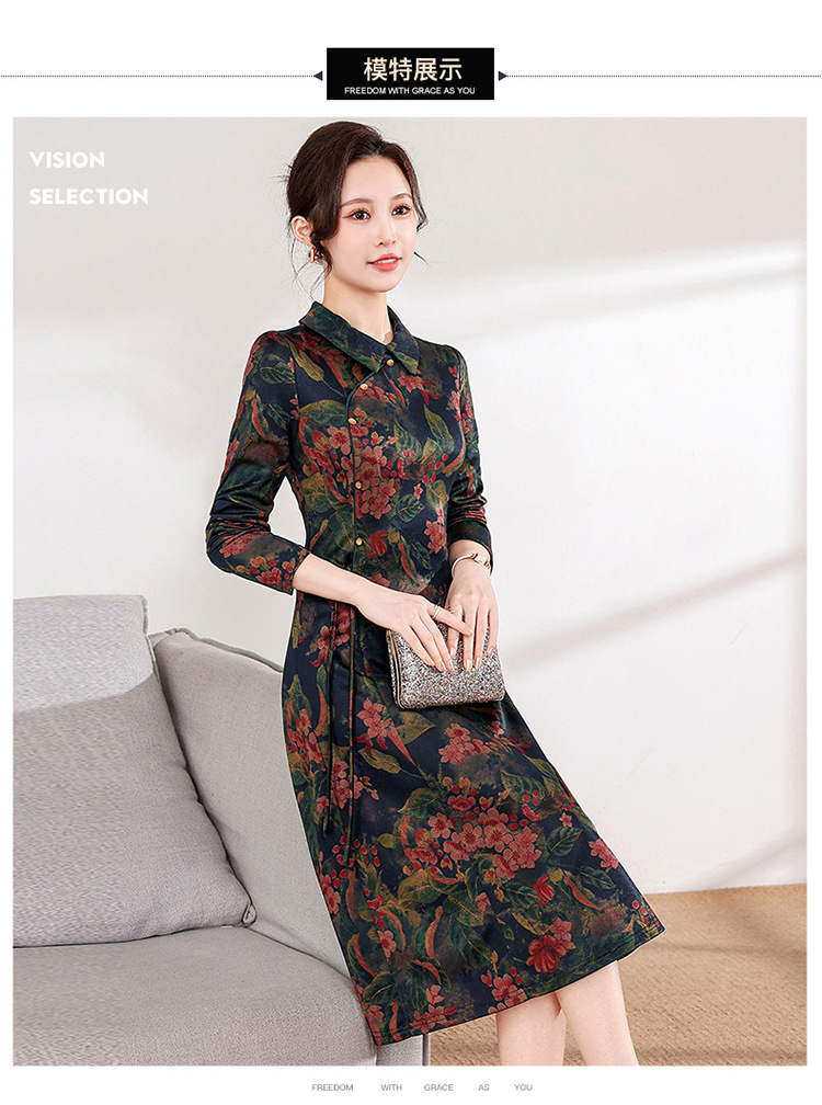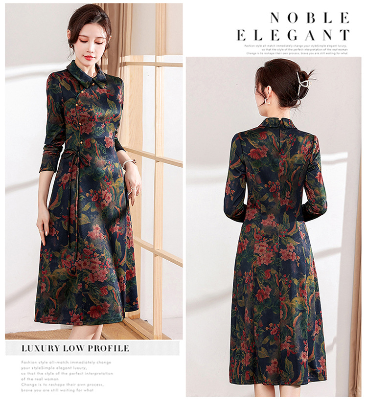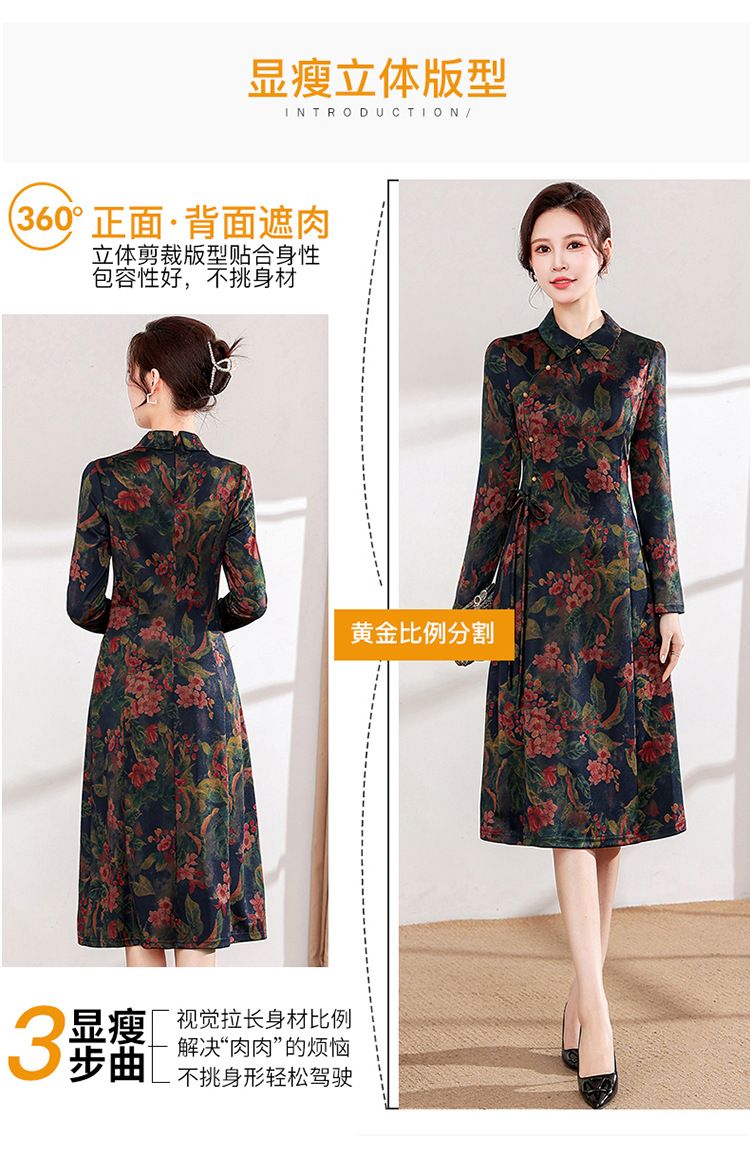 QYM MB2302印花复古优雅时尚连衣裙娃娃领优雅气质A字裙