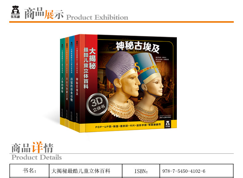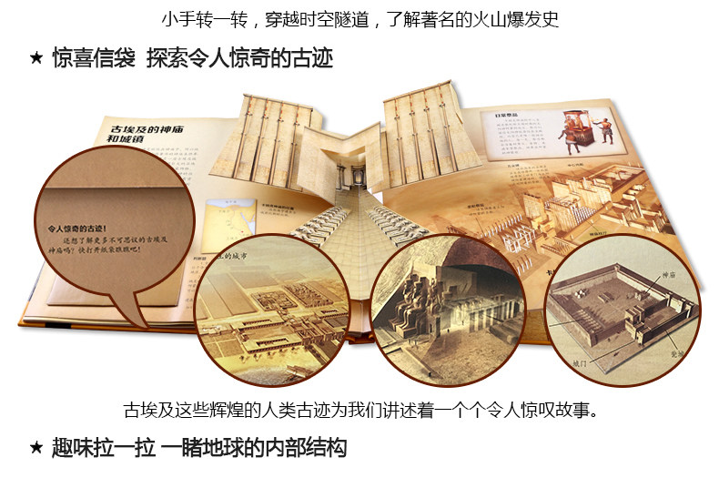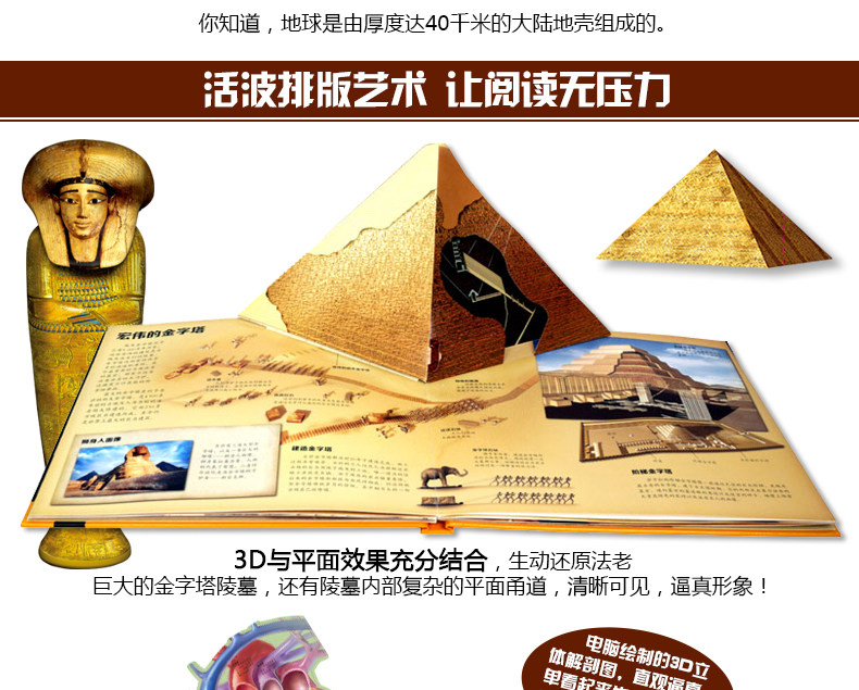 大揭秘 最酷3D儿童立体百科《神秘古埃及》,带你领略不一样的古埃及。丰富有趣的互动设计,带你探索神秘的金字塔、恢宏的古神庙、充满财宝的幽深陵墓、以及充满奇幻色彩的神话国度!